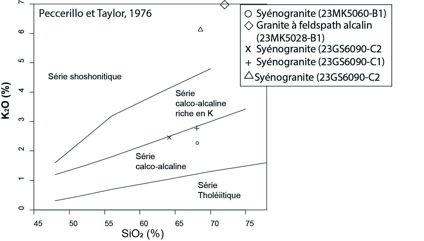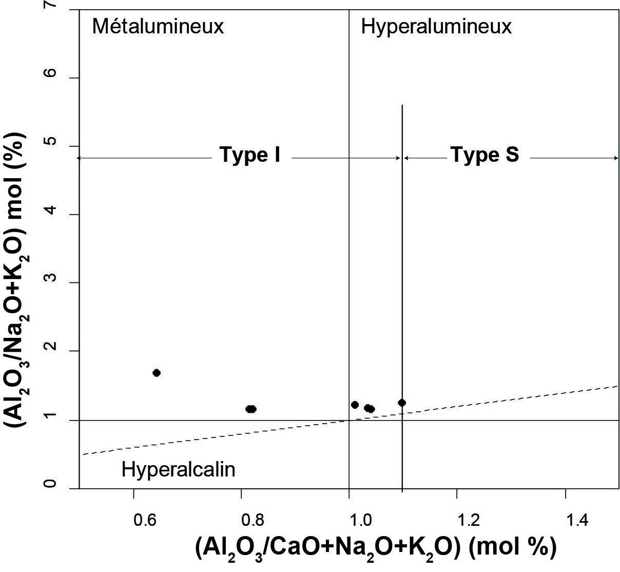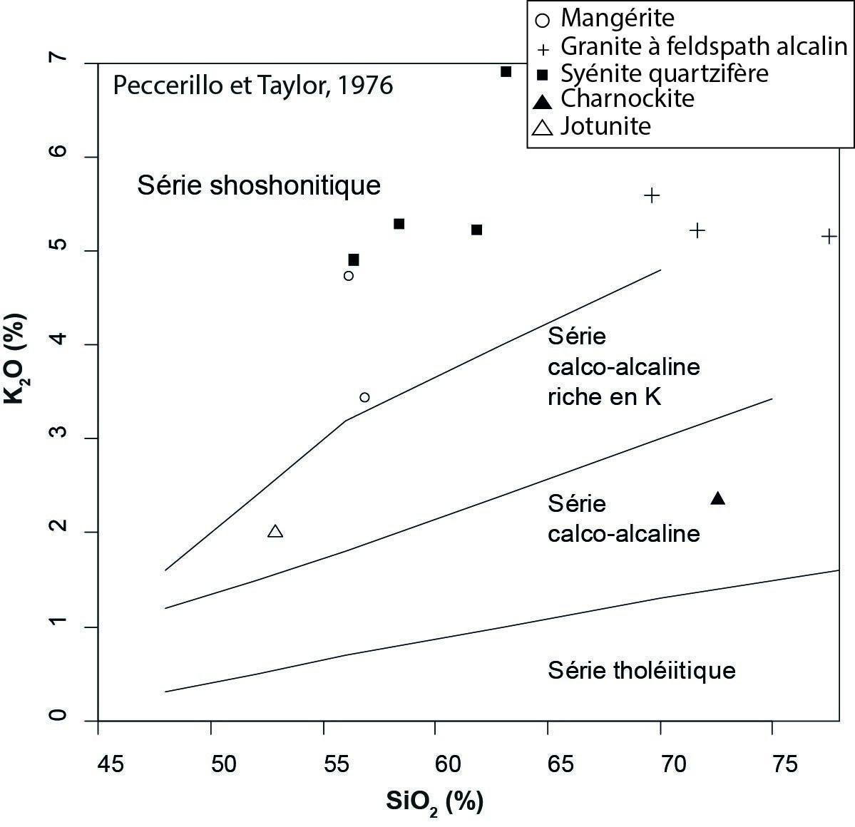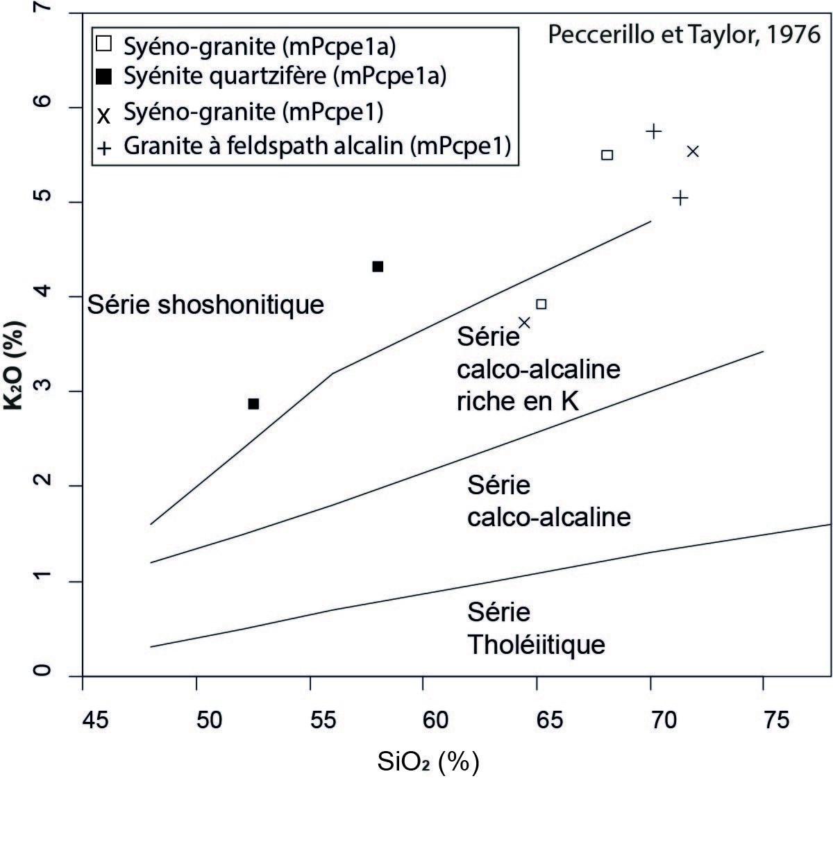Métalumineux à hyperalumineux (origine ignée) Série calco-alcaline riche en K à shoshonitique |