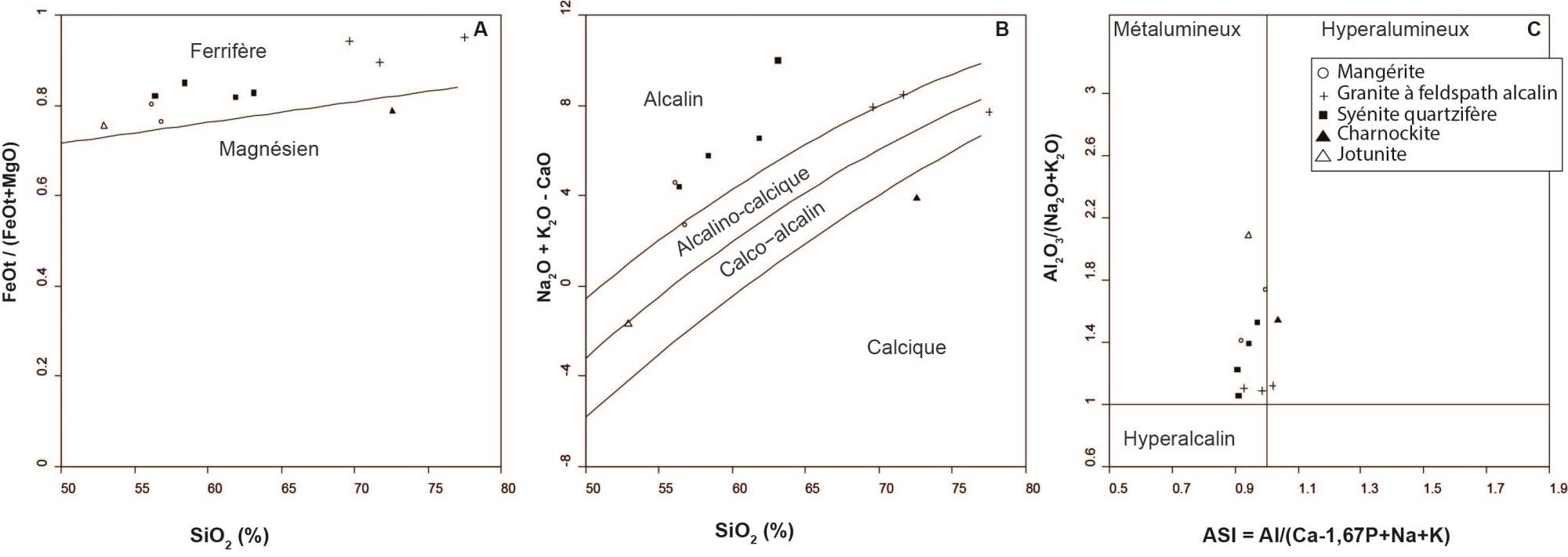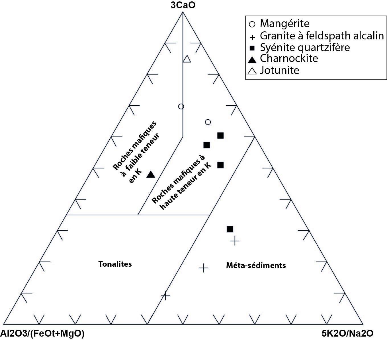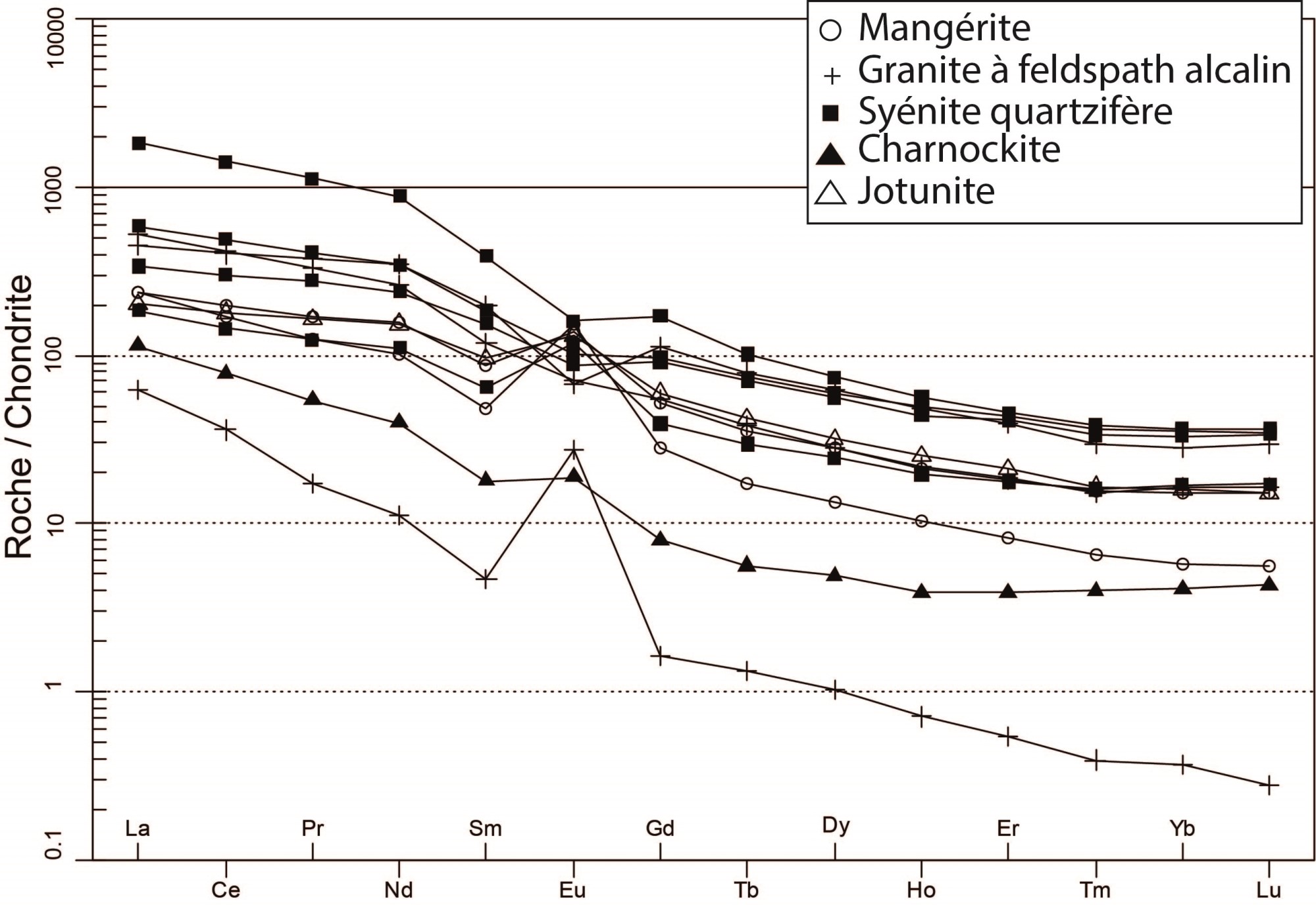 Mangérite, syénite quartzifère, monzodiorite à hypersthène (jotunite), granite à feldspath alcalin, charnockite |