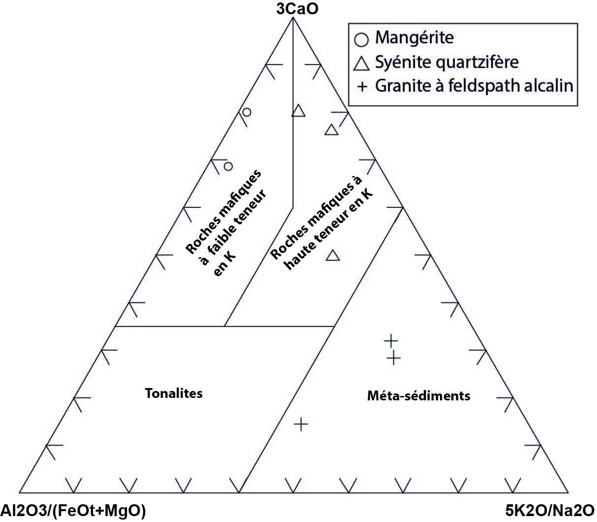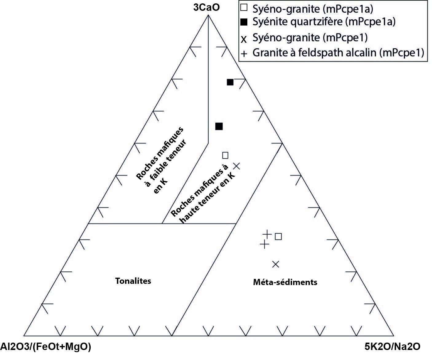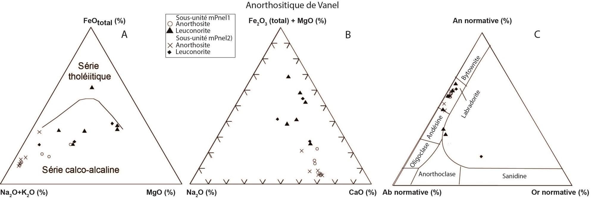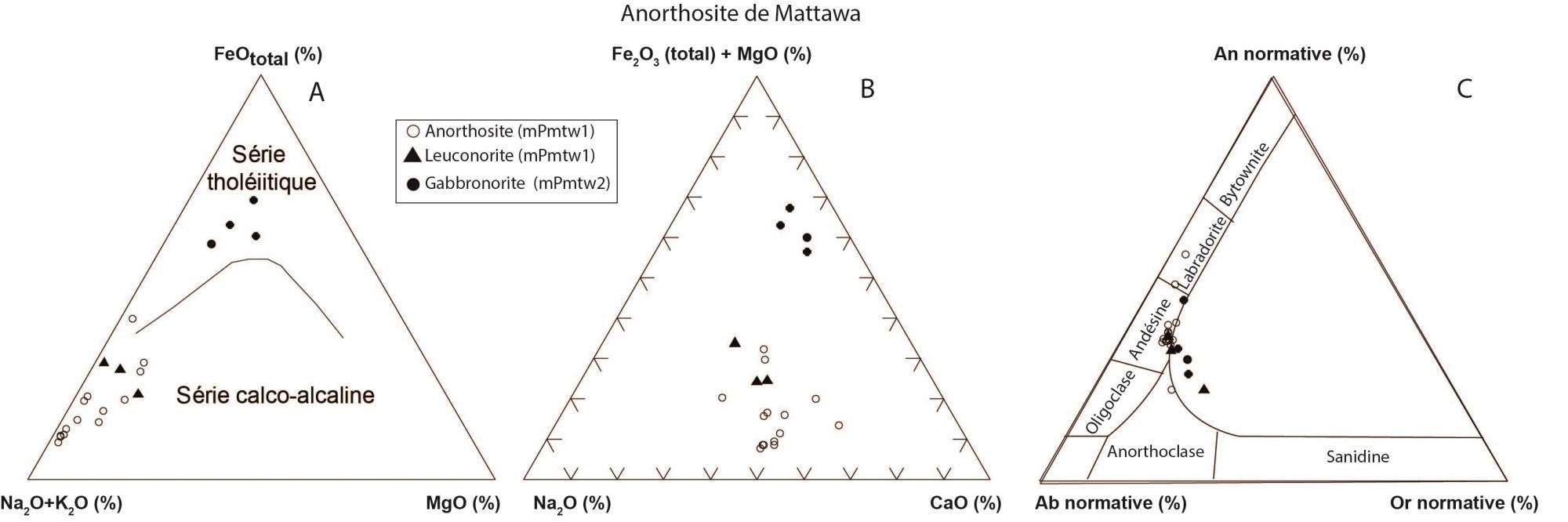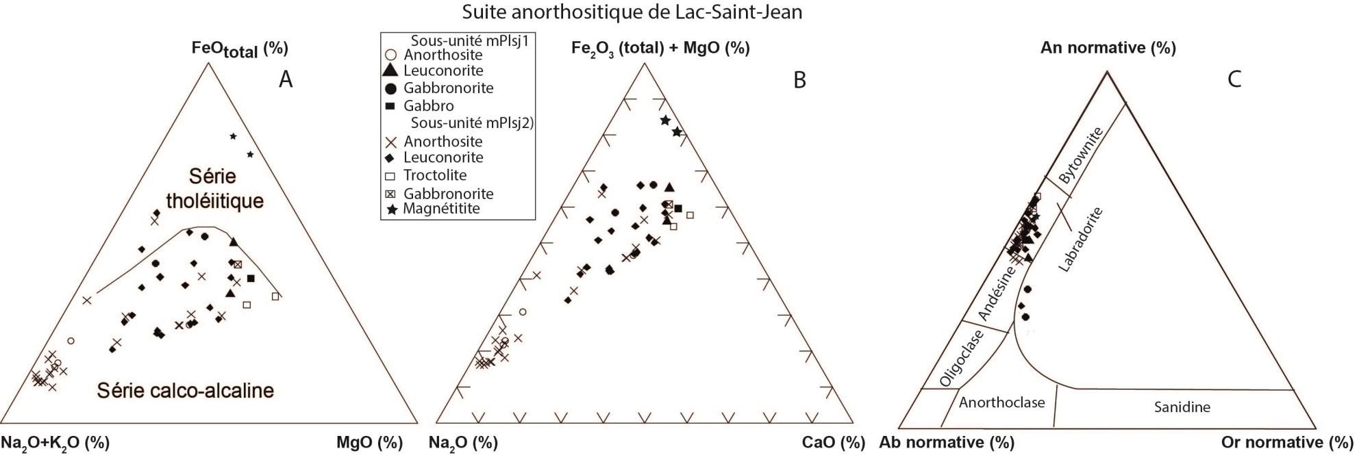 La norme CIPW modifiée pour inclure la biotite et la hornblende a été calculée selon la méthode de Hutchison (1974, 1975) à l’aide du logiciel GeoChemical Data toolkit (GCDkit, Janoušek et al. 2006) pour réaliser les diagrammes de classification des roches intrusives felsique et intermédiaires (p. ex. Streckeisen, 1976), alors que la norme CIPW non modifiée a été utilisée pour les roches anorthositiques et roches associées. Le logiciel GeoChemical Data toolkit a été utilisé pour réaliser les diagrammes géochimiques mentionnés dans les tableaux ci-dessous.