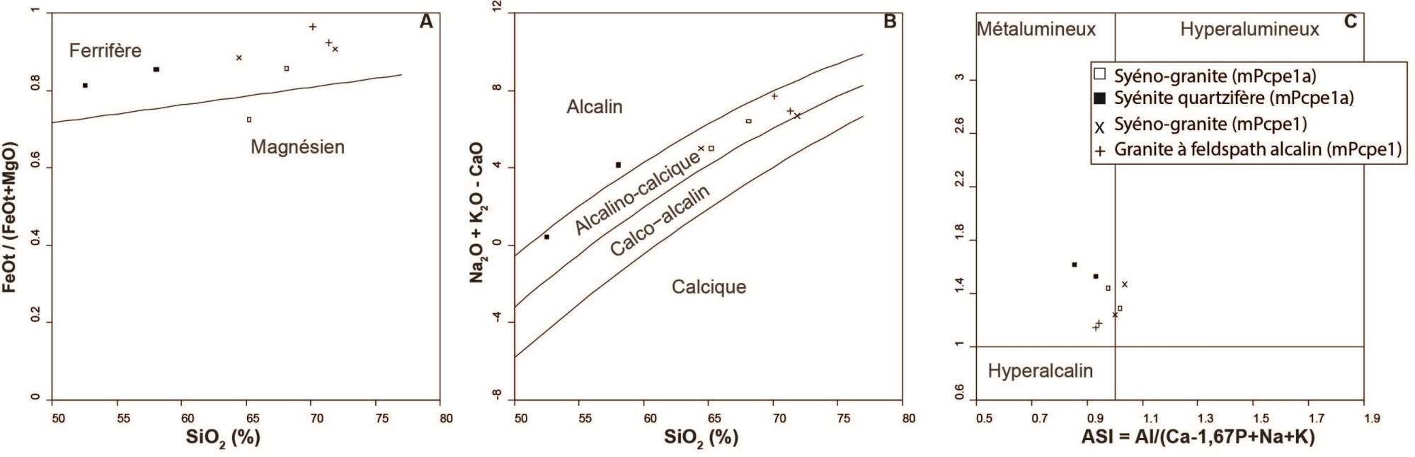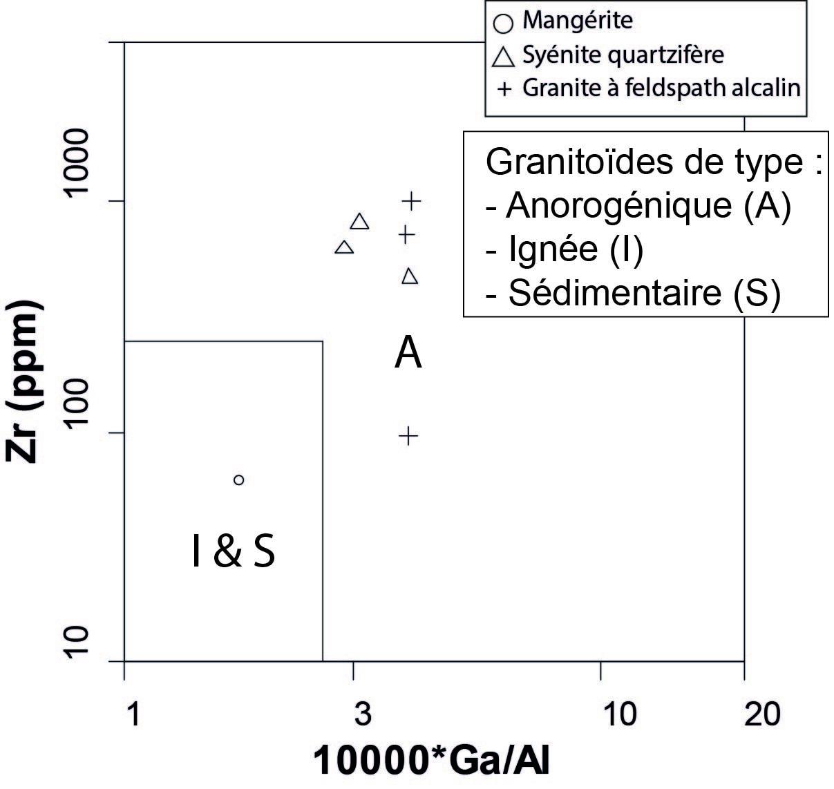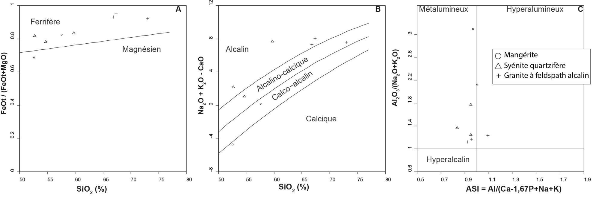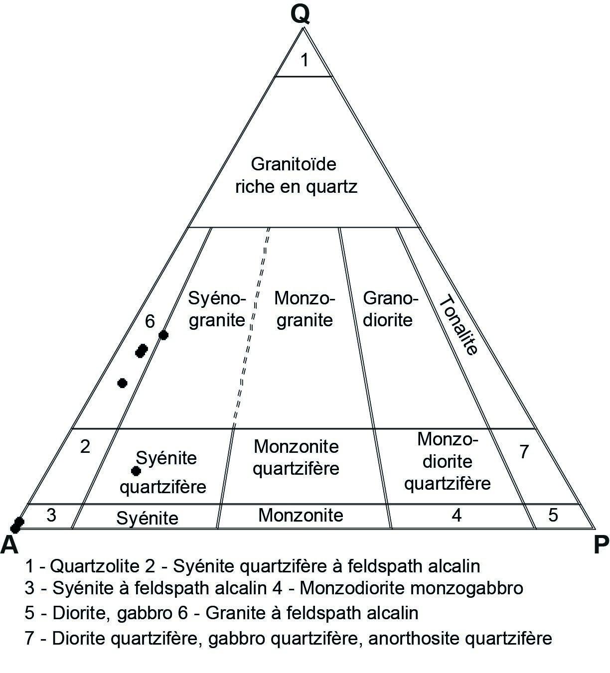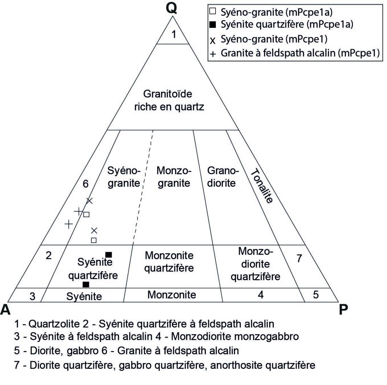 Granite à feldspath alcalin, syénite quartzifère et syénite à feldspath alcalin |