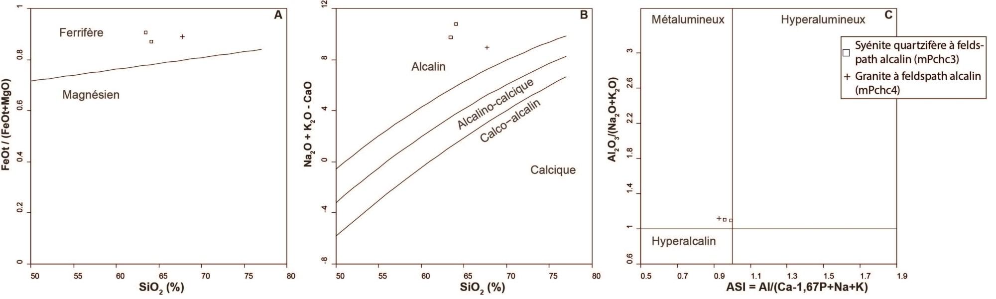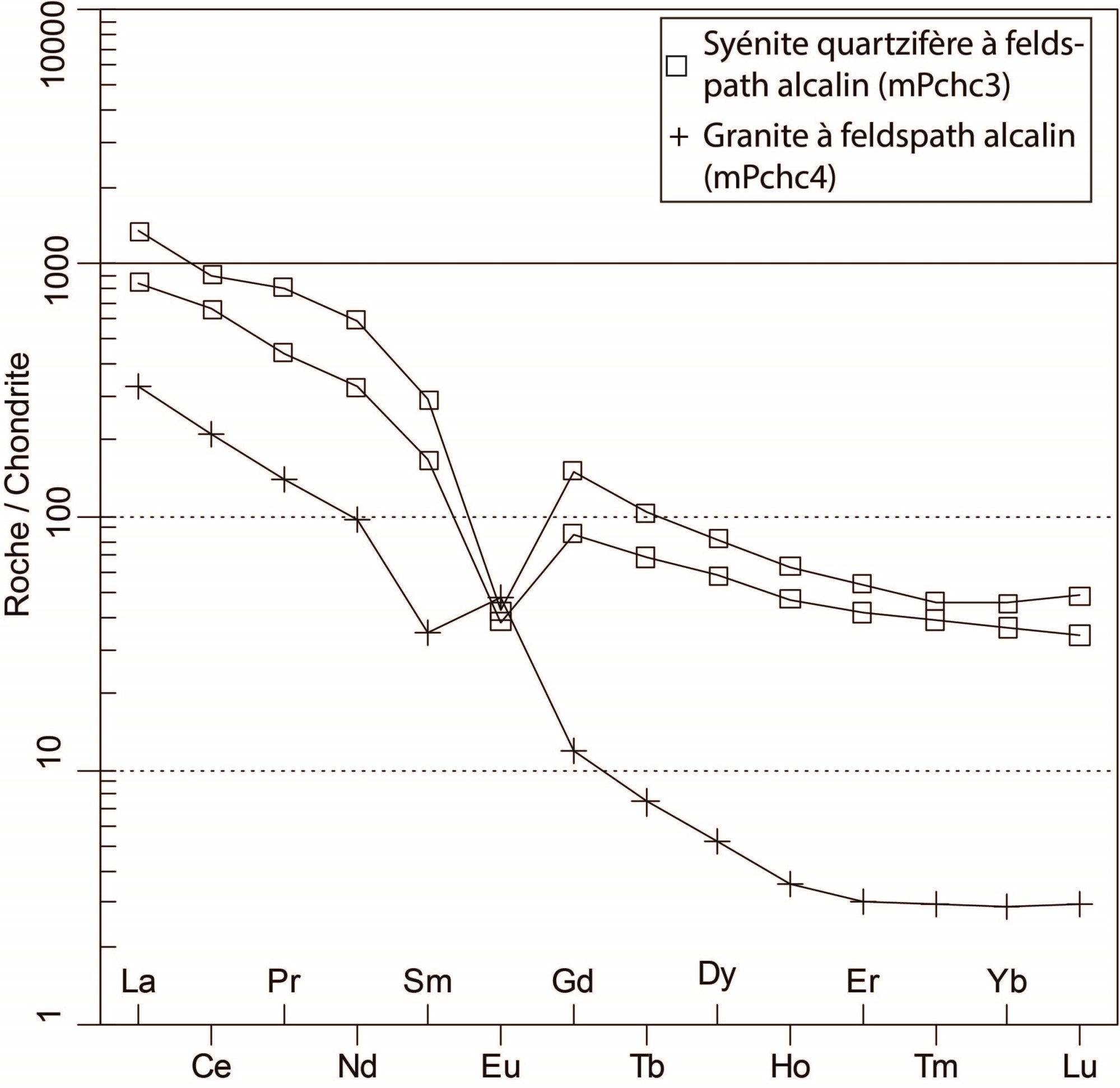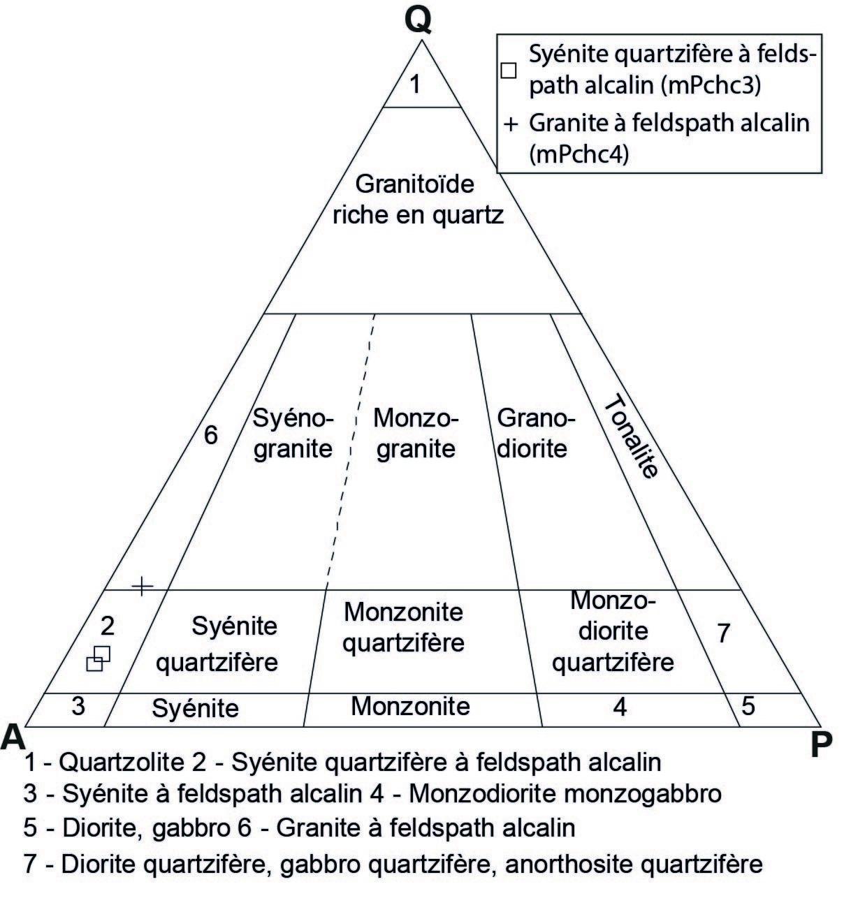 Syénite quartzifère à feldspath alcalin (mPchc3) Granite à feldspath alcalin (mPchc4) |