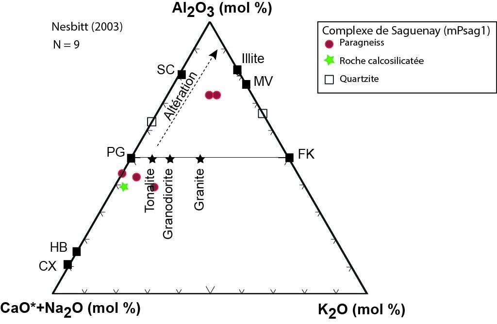 Roches sédimentaires dérivées de la croûte supérieure (tonalite). Généralement, les roches métasédimentaires sont faiblement à moyennement altérées. Quelques niveaux de paragneiss à biotite et graphite montrent localement une altération plus prononcée. |