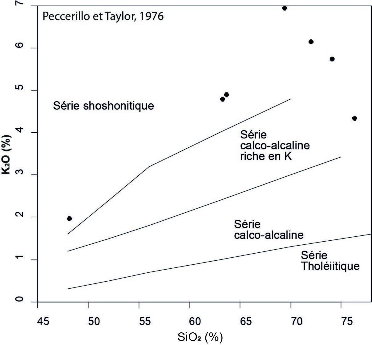 Séries calco-alcaline, calco-alcaline riche en K et surtout shoshonitique |