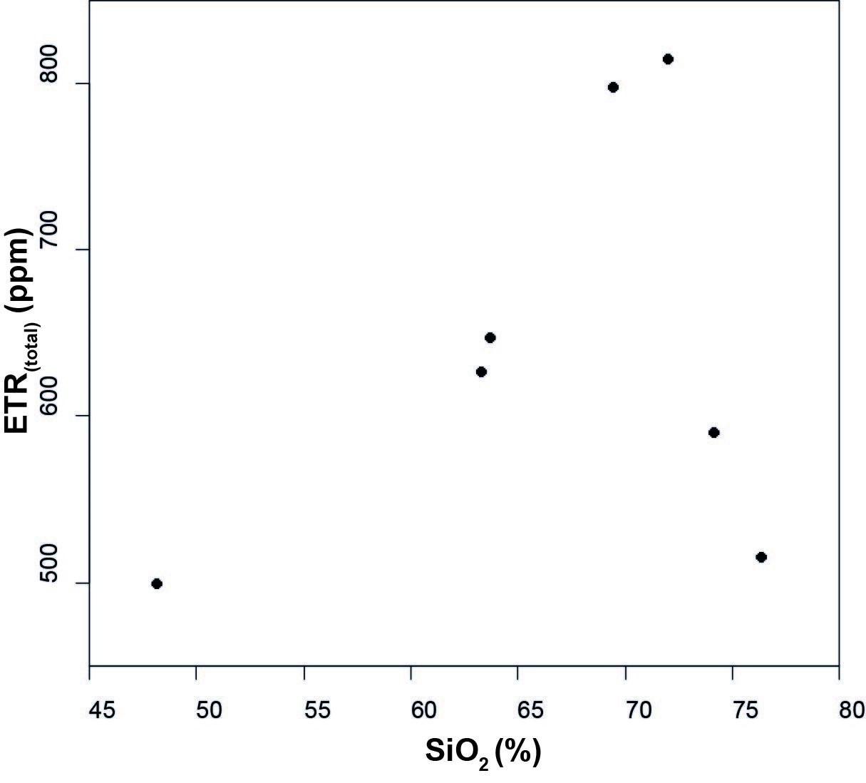 11,58 < (La/Yb)N < 64,63 2,14 < (La/Sm)N < 6,02 1,93 < (Gd/Yb)N < 5,51 00,14 < Eu/Eu* <0,86 |