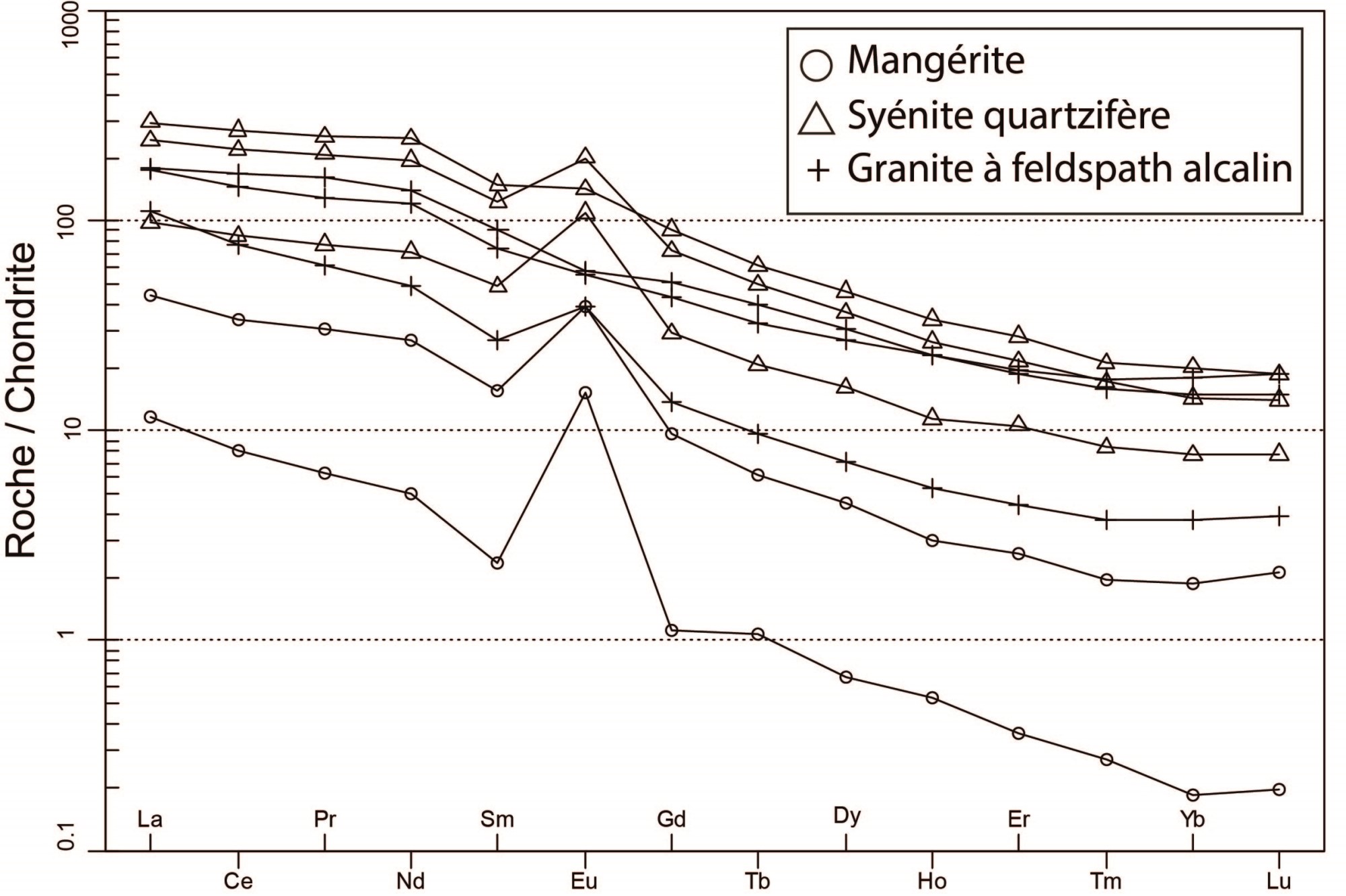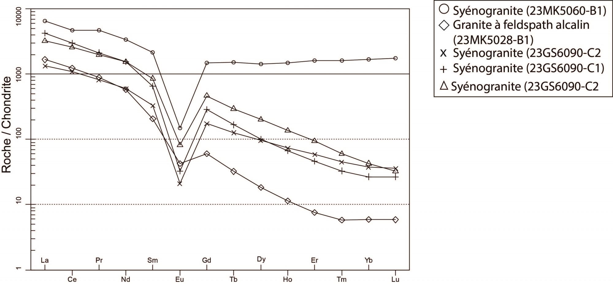 Les échantillons analysés sont à grain grossier à pegmatitique et ne reflètent pas la composition chimique totale de la roche. Les 5 échantillons proviennent des affleurements à haute teneur en ETR (1517 ppm < ETR(total) < 8422 ppm) |