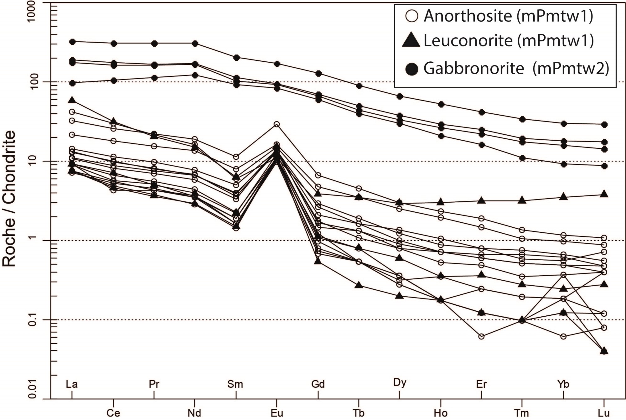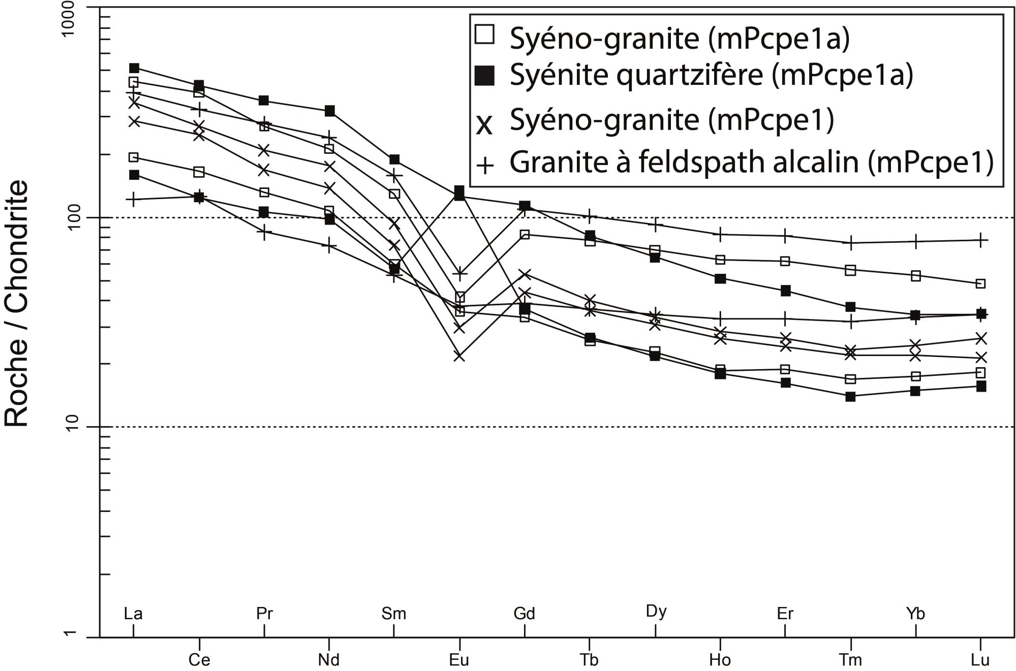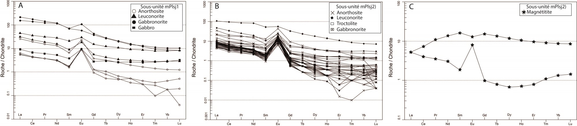 mPlsj1 3,28 < (La/Yb)N < 38,80 2,17 < (La/Sm)N < 3,89 1,00< (Gd/Yb)N < 7,01 1,13 < Eu/Eu* < 7,05 mPlsj2 3,77 < (La/Yb)N < 191,94 1,48 < (La/Sm)N < 6,91 1,48 < (Gd/Yb)N < 29,12 2,96 < Eu/Eu* < 17,25 mPlsj3 (La/Yb)N = 15,77 et 115,22 (La/Sm)N = 2,09 et 3,22 (Gd/Yb)N = 2,44 et 4,69 Eu/Eu* = 0,87 et 1,05