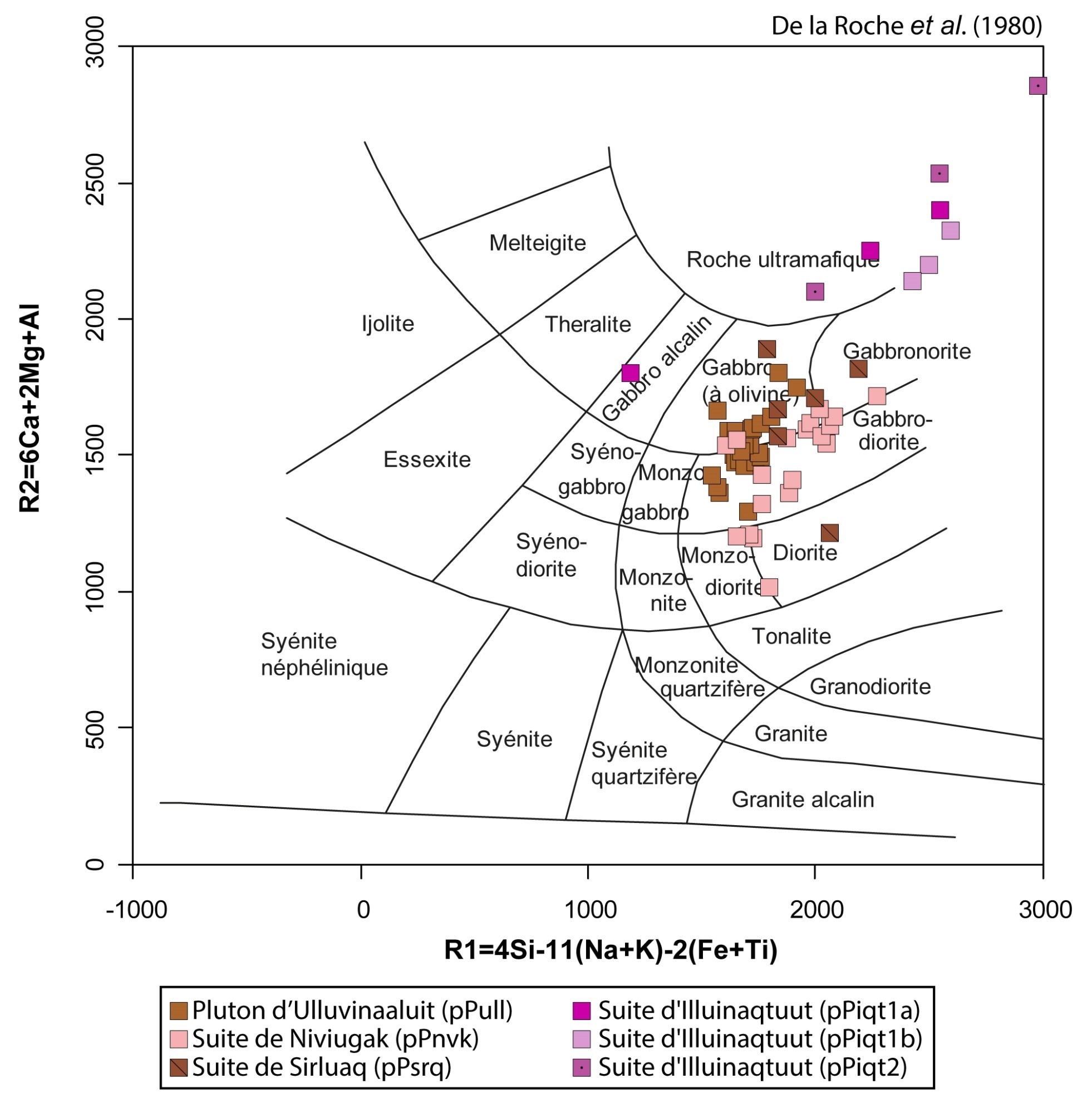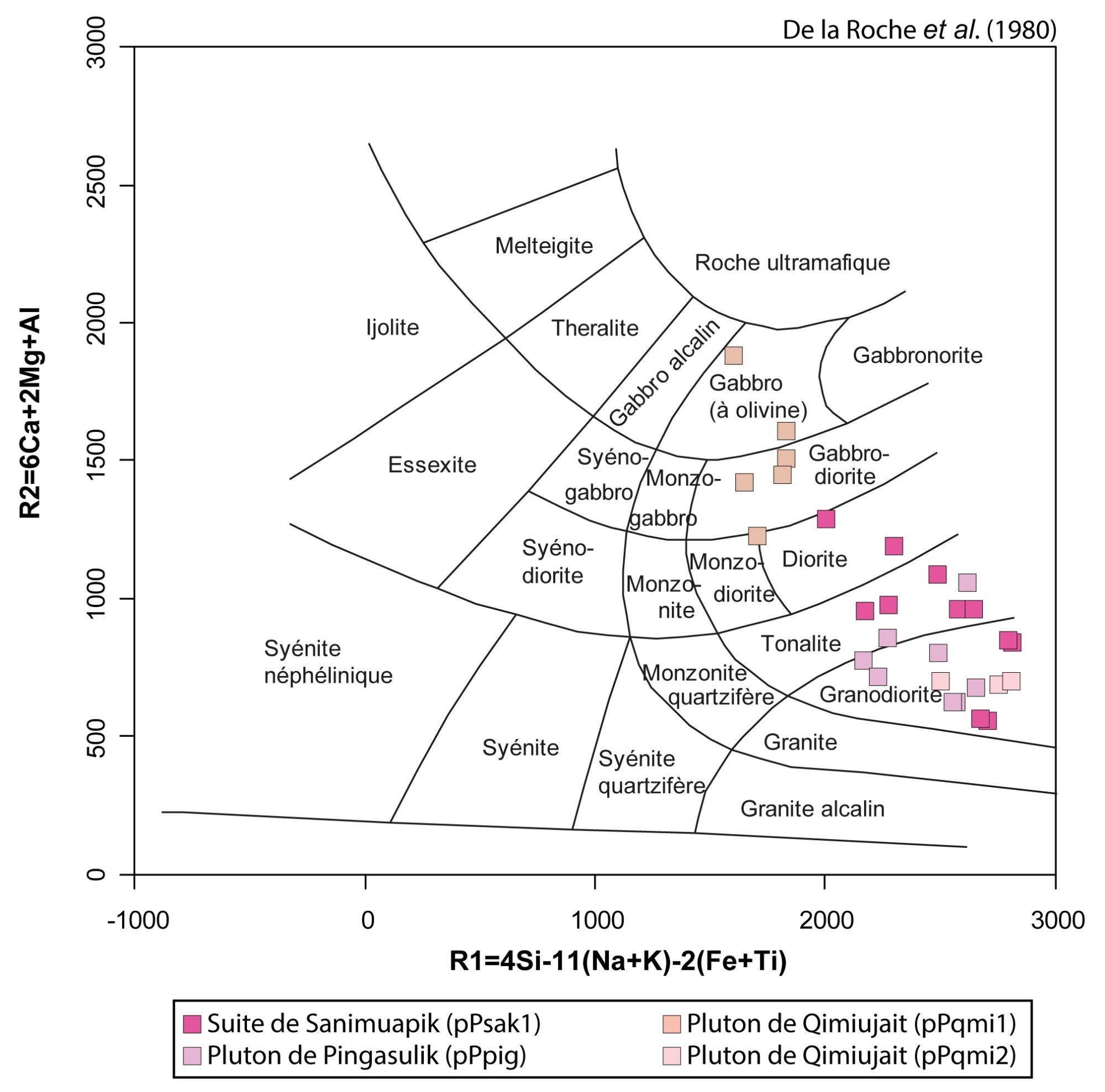 DE LA ROCHE, H., LETERRIER, J., GRANDCLAUDE, P., MARCHAL, M., 1980. A classification of volcanic and plutonic rocks using R1-R2 diagrams and major element analyses – its relationships with current nomenclature. Chemical Geology; volume 29, pages 183-210. doi.org/10.1016/0009-2541(80)90020-0.