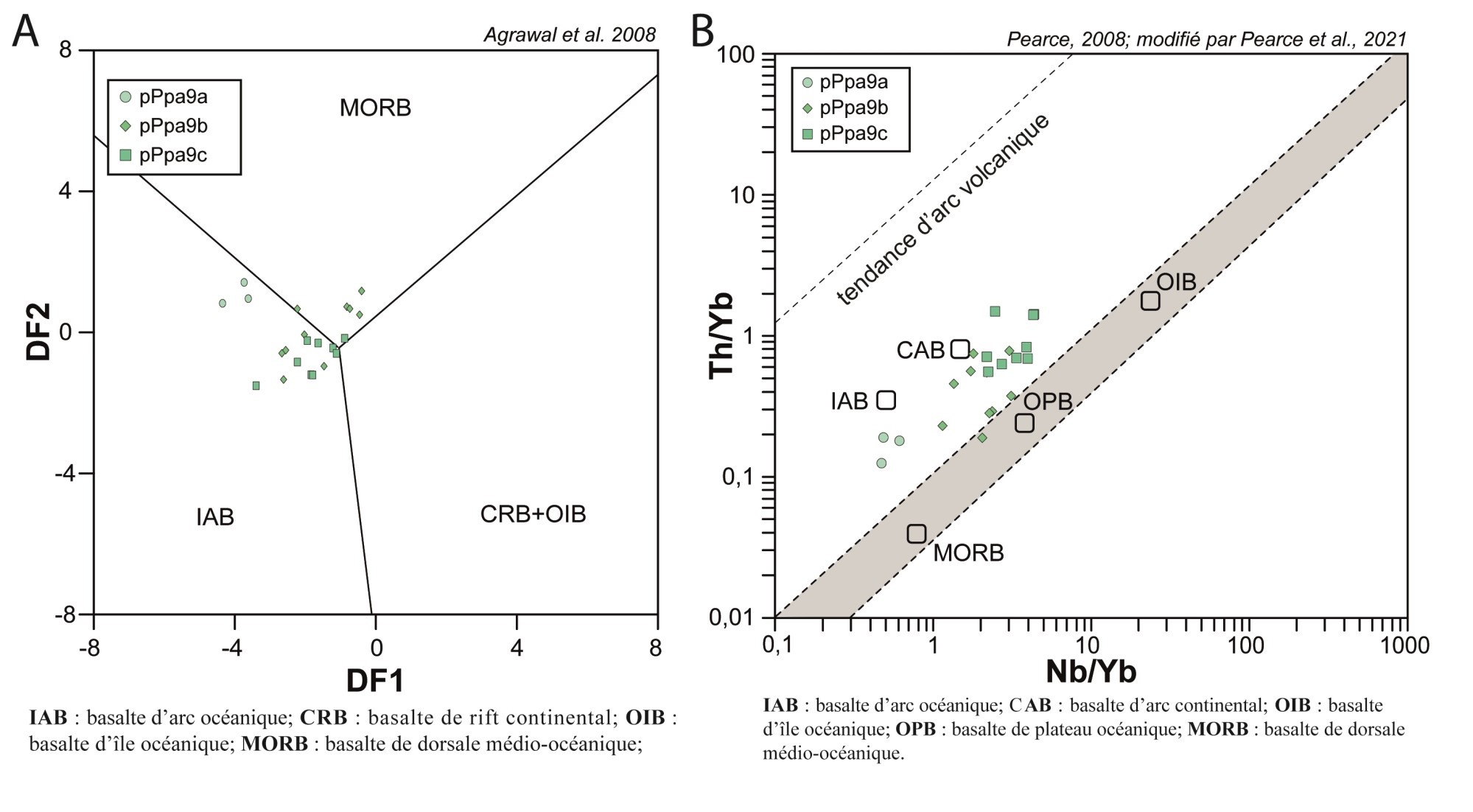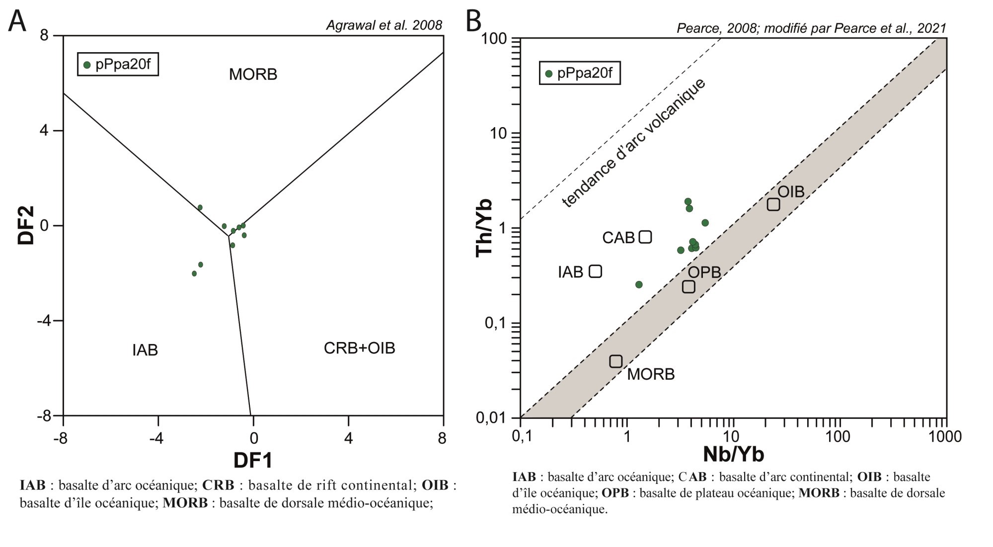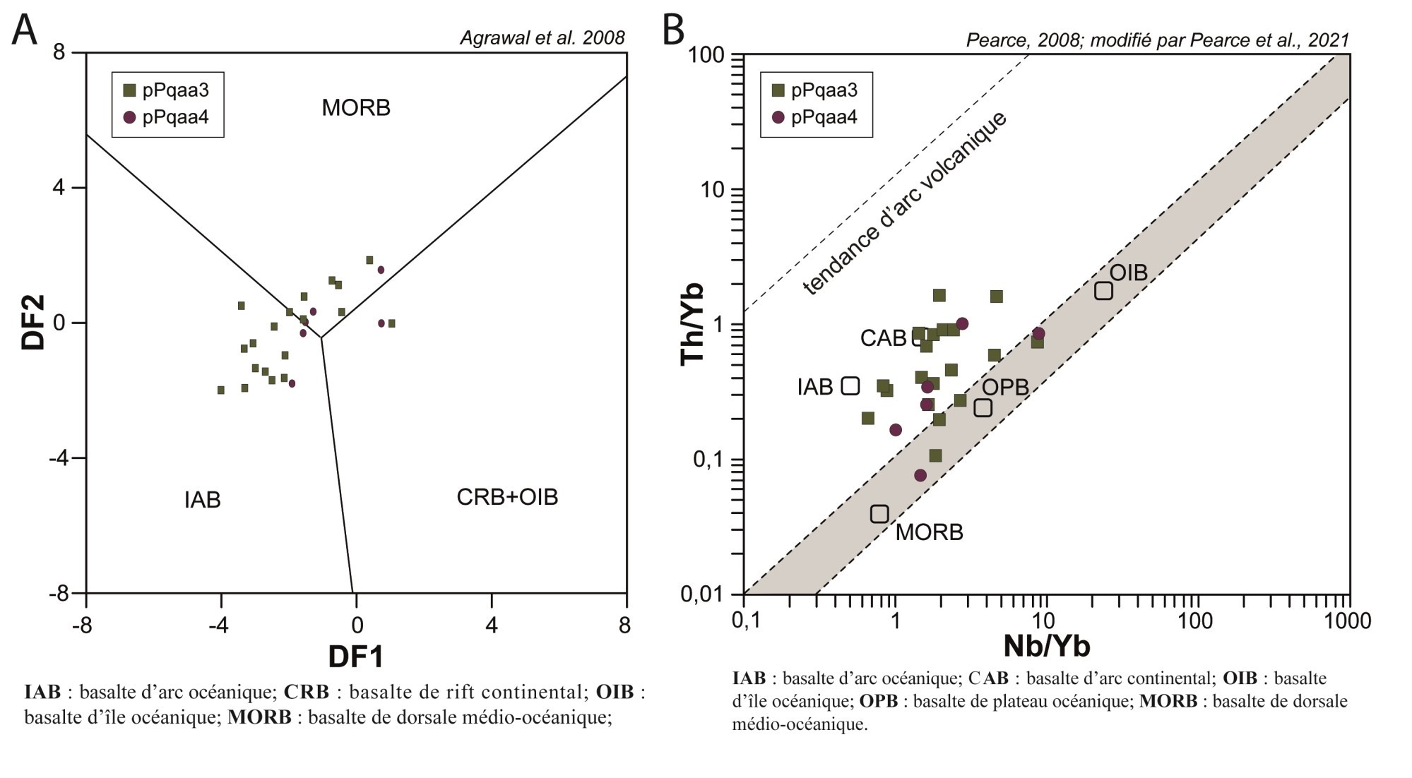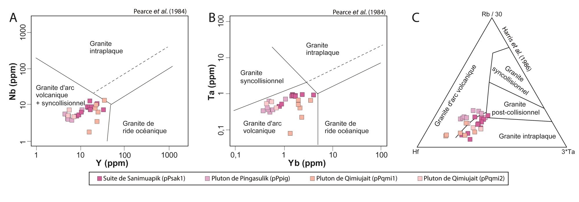 Granite d’arc volcanique (Pearce et al., 1984); Granite d’arc volcanique et intraplaque (Harris et al., 1986) |