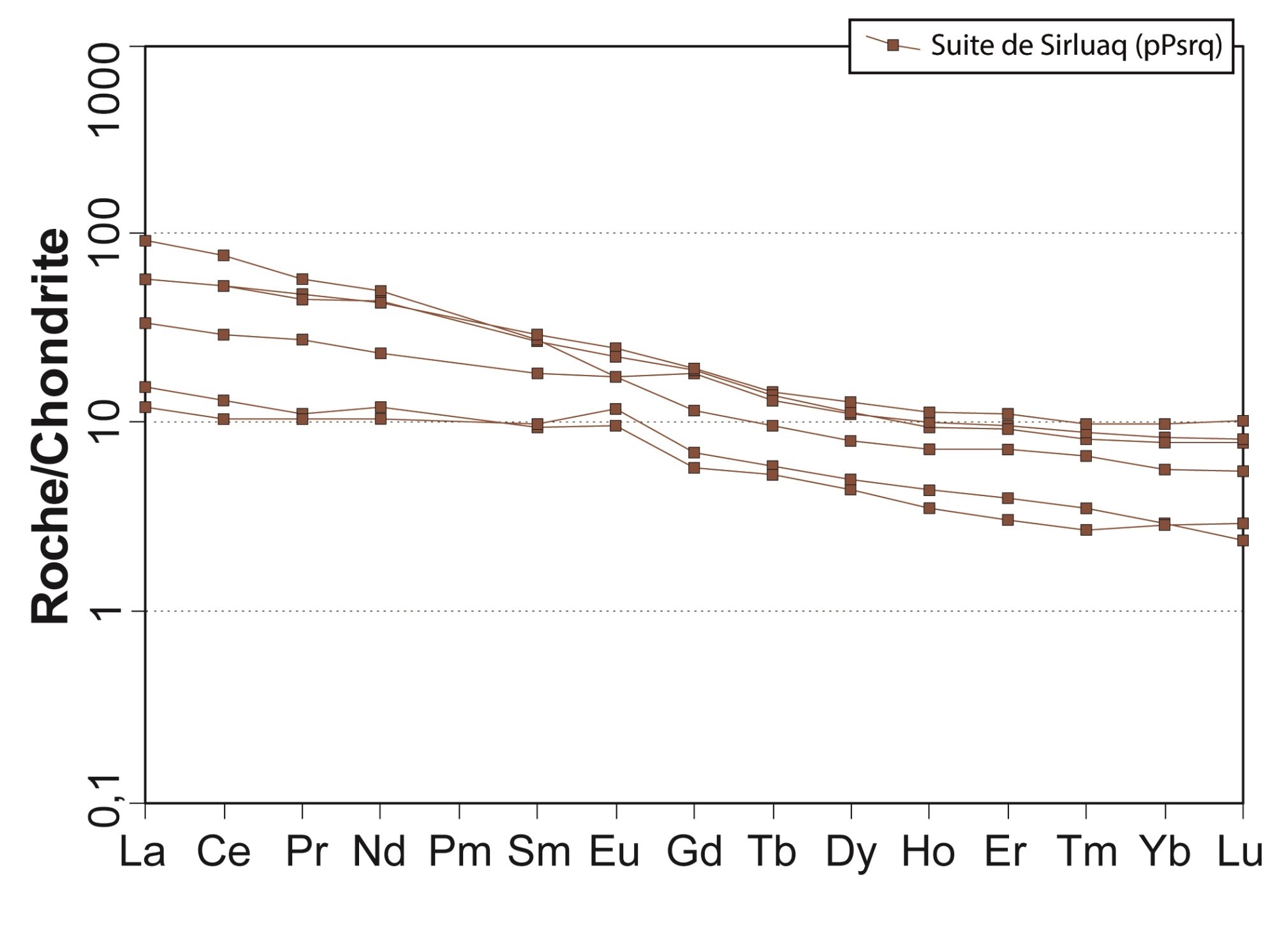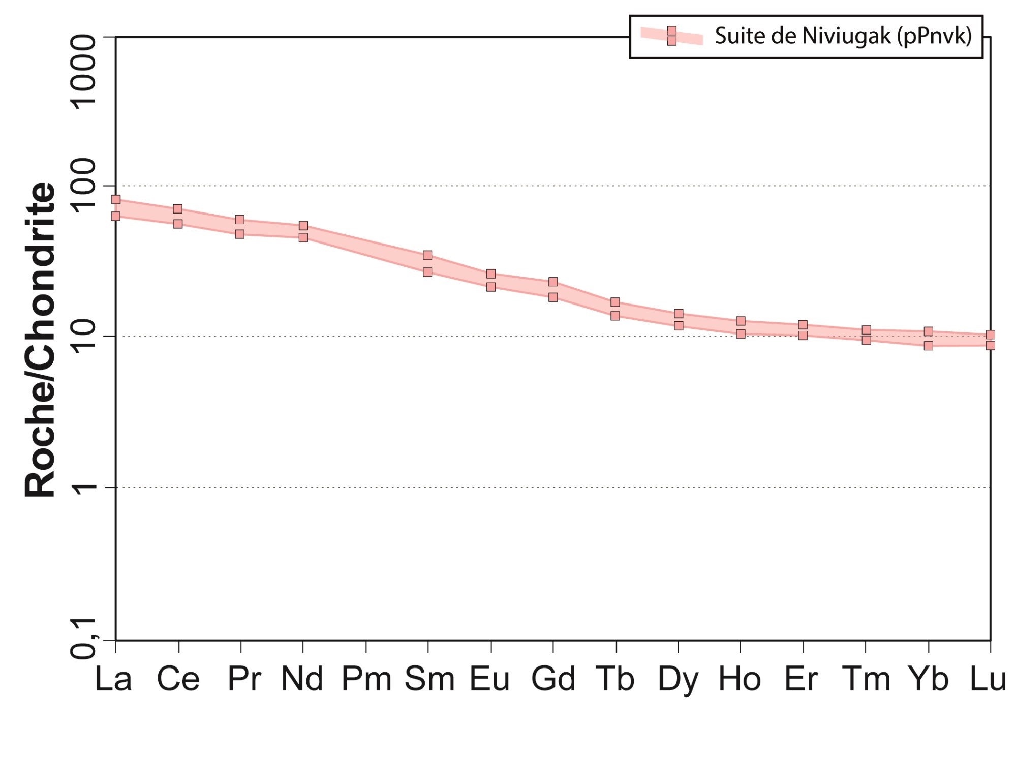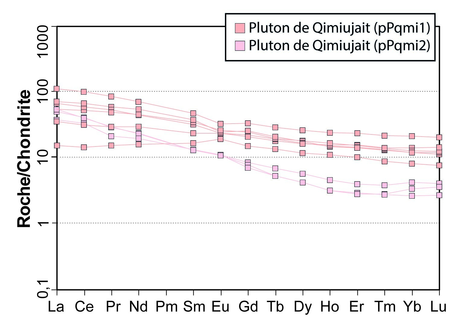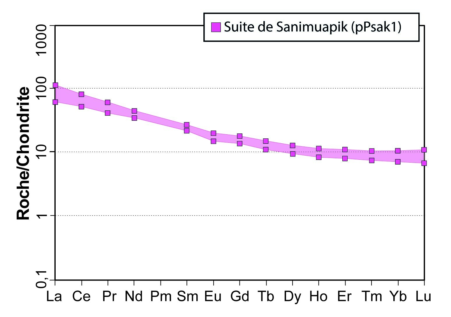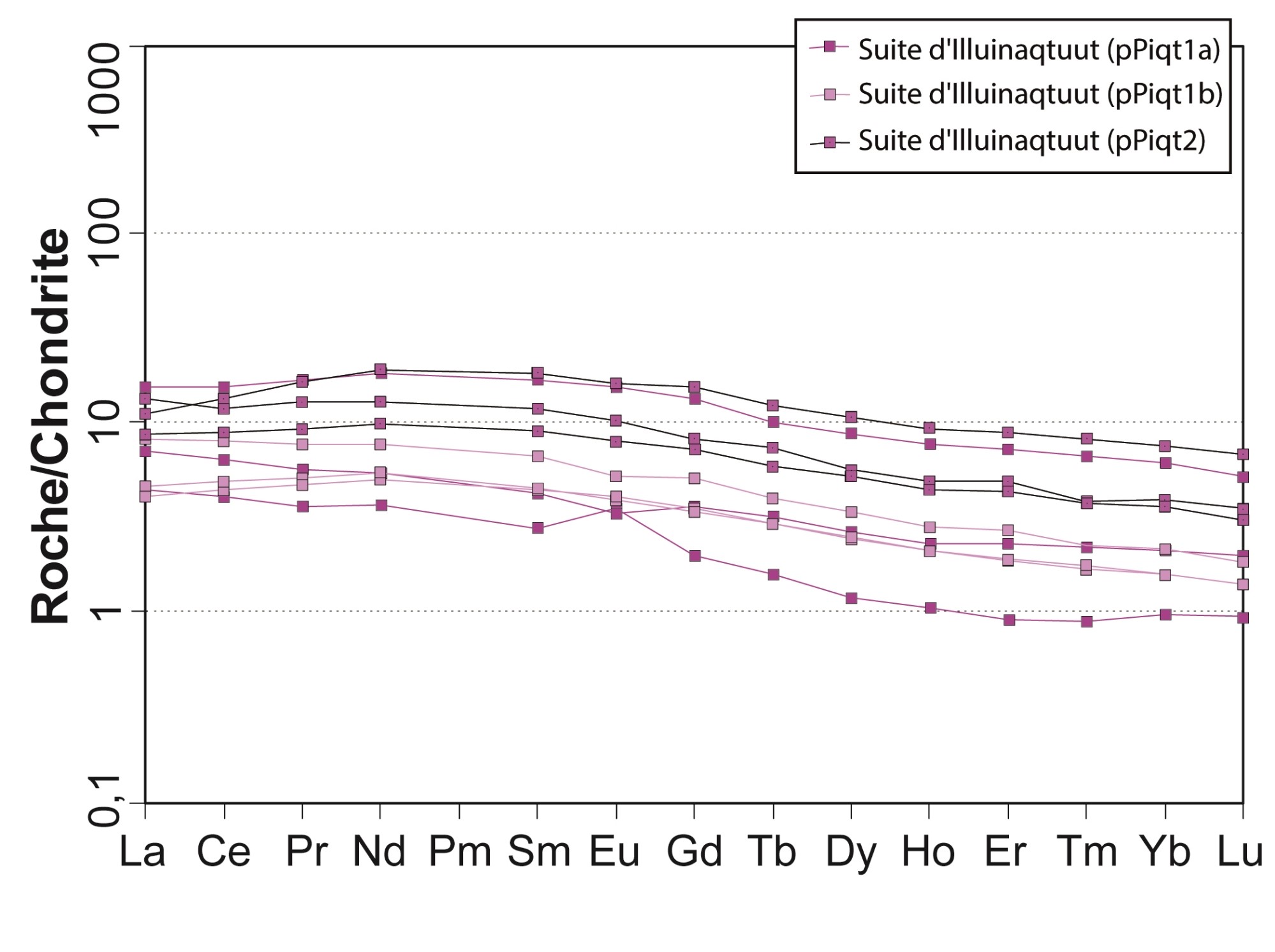 Les profils des spectres des terres rares et du diagramme multiéléments des roches de la Suite de Sanimuapik et du Pluton de Pingasulik sont très similaires, ce qui confirme l’appartenance de ce dernier dans la première. |