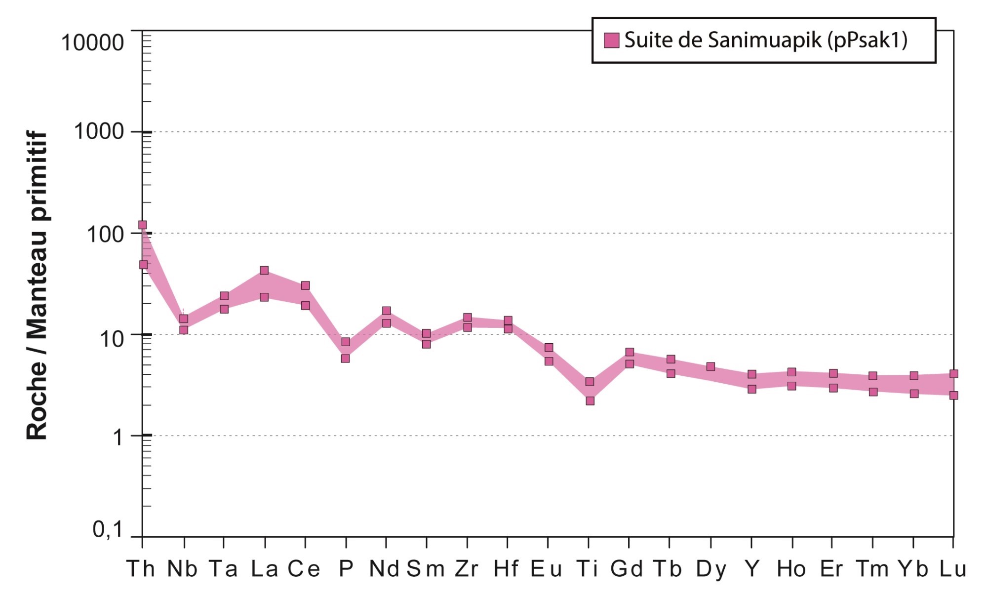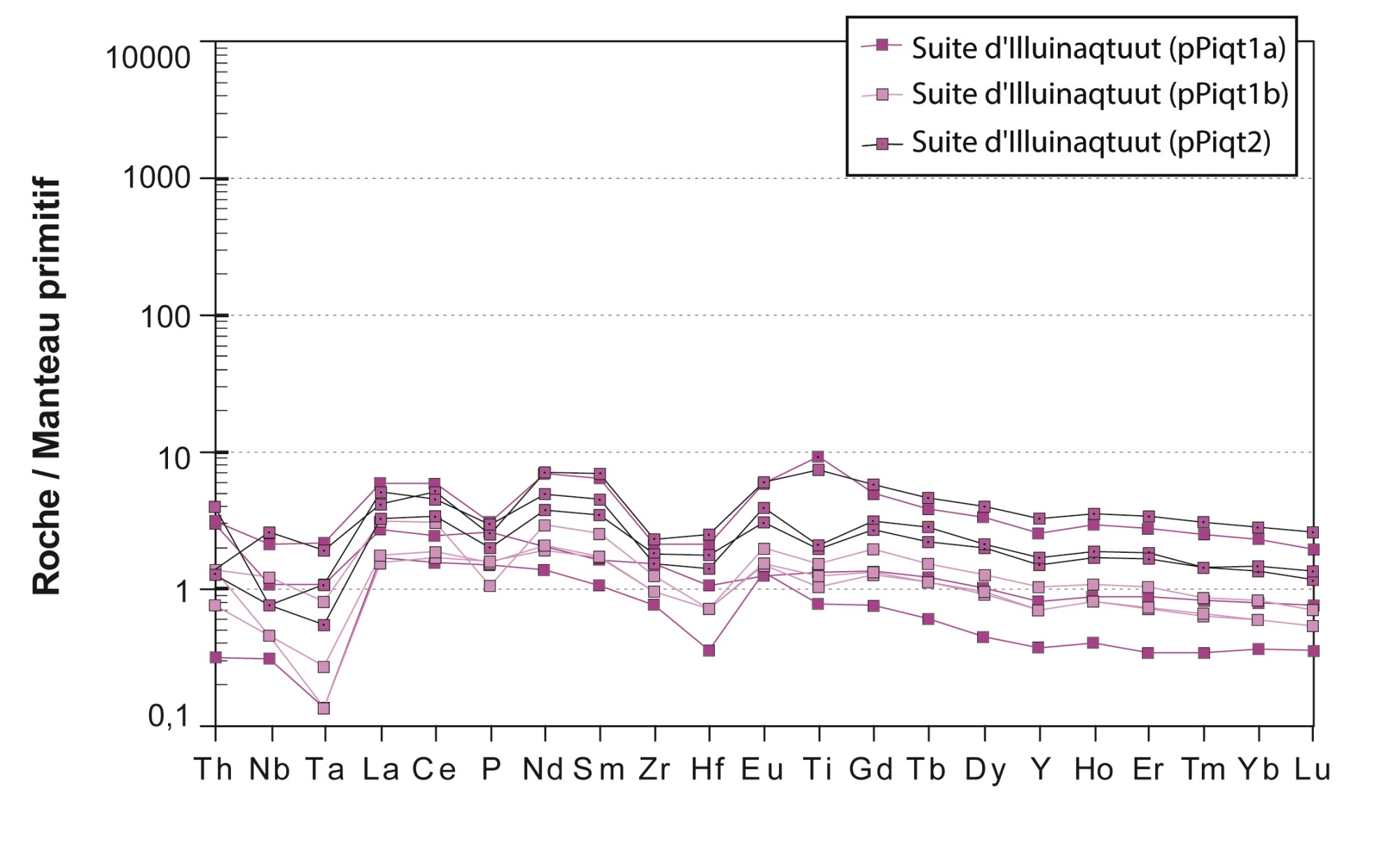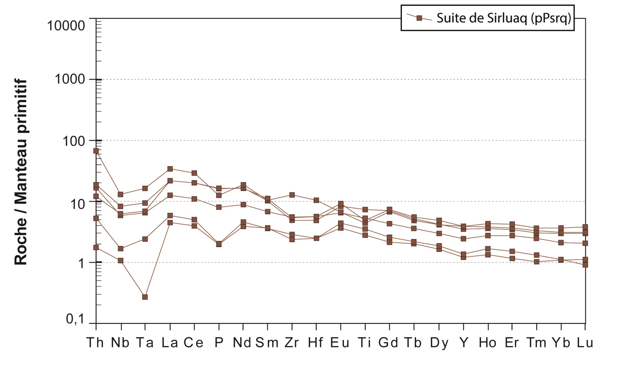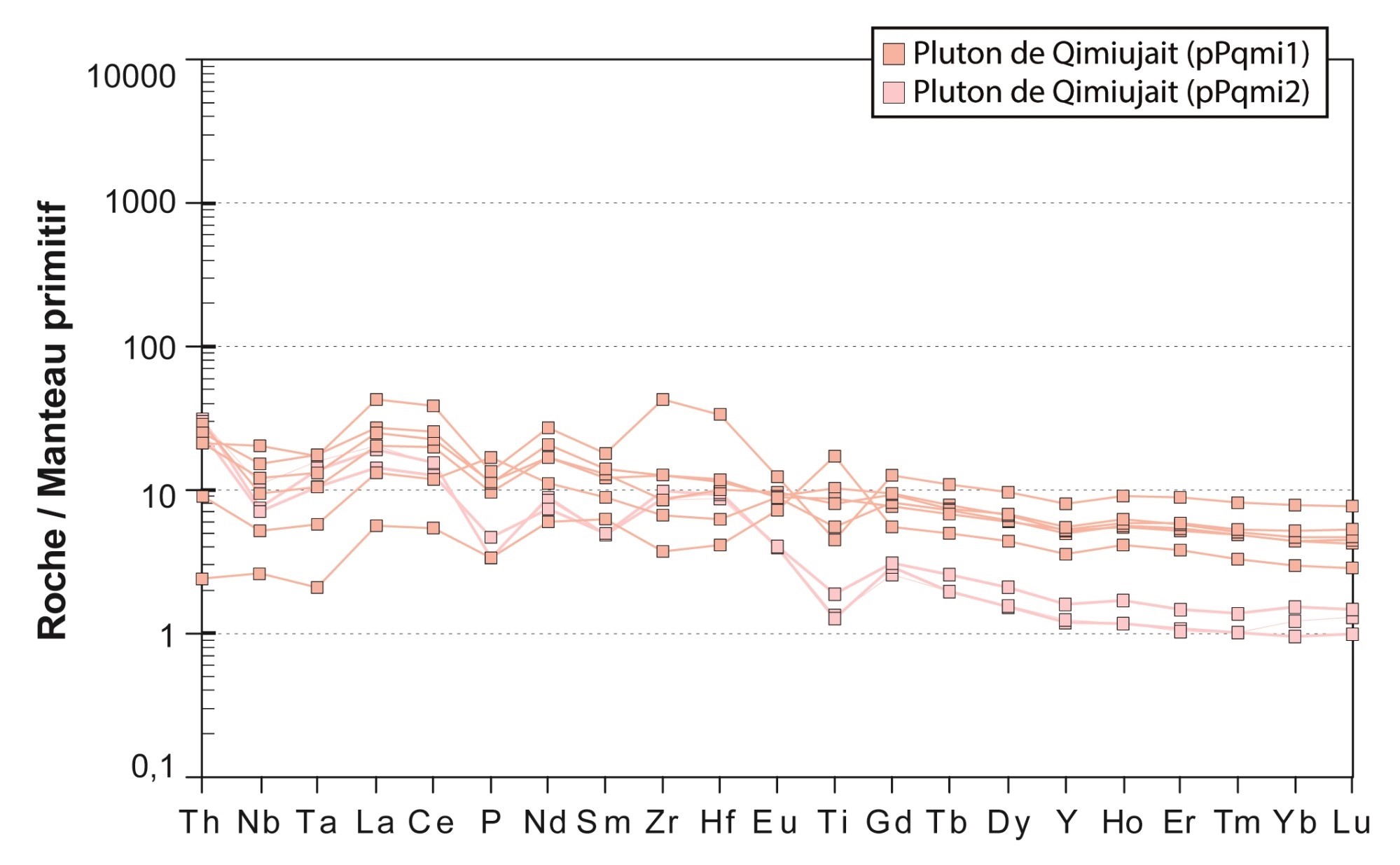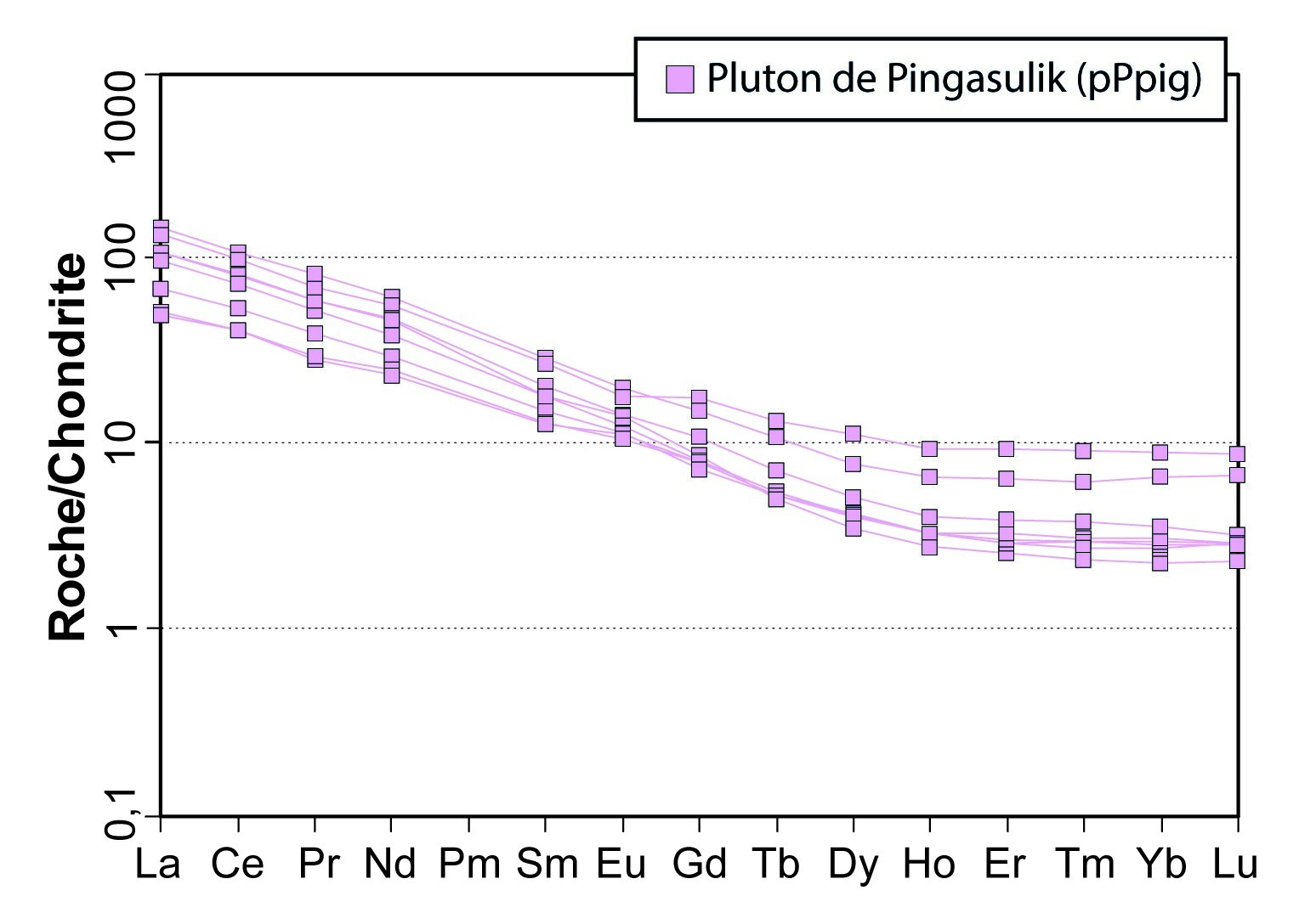 Les profils des spectres des terres rares et du diagramme multiéléments des roches de la Suite de Sanimuapik et du Pluton de Pingasulik sont très similaires, ce qui confirme l’appartenance de ce dernier dans la première. |