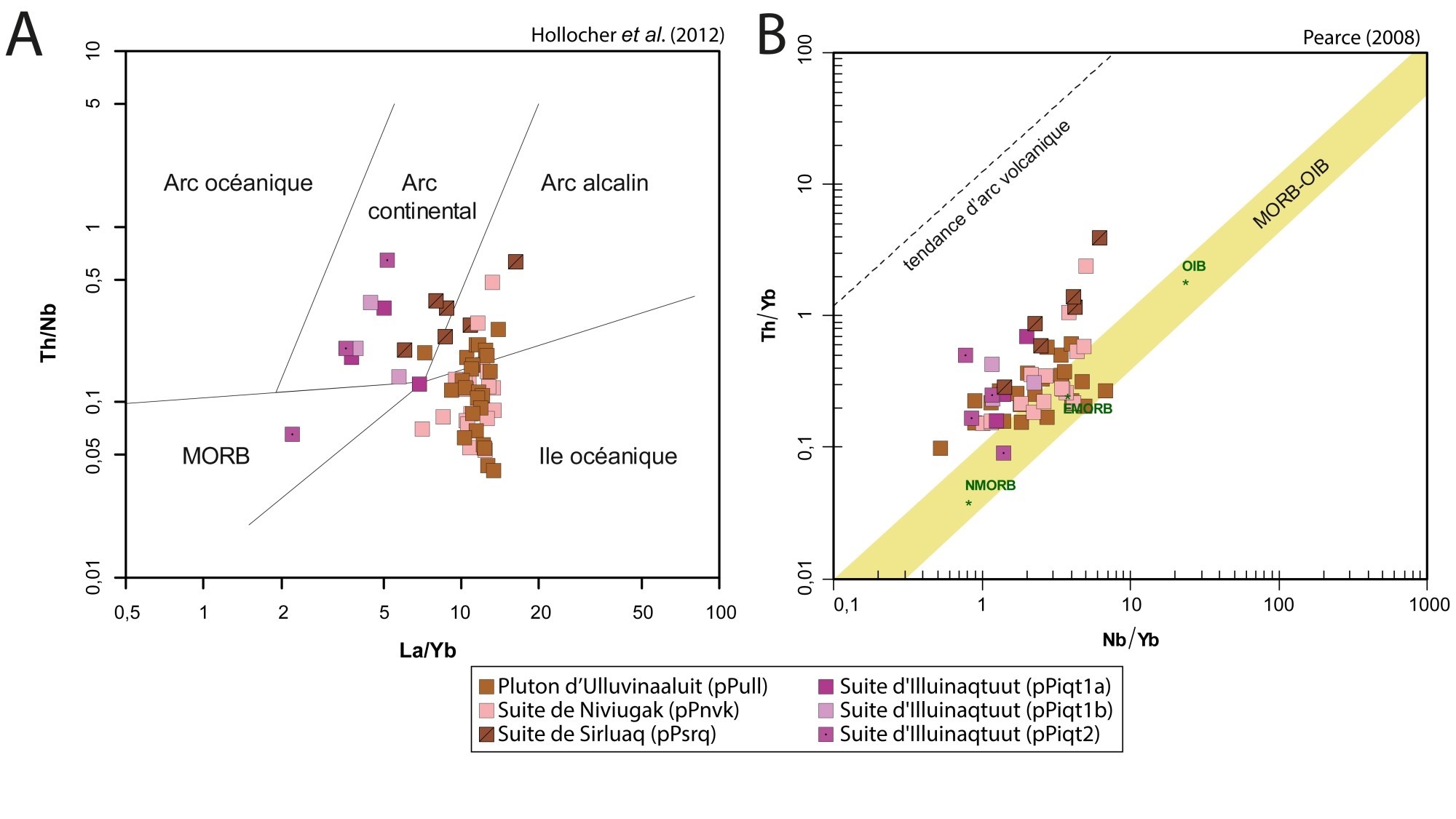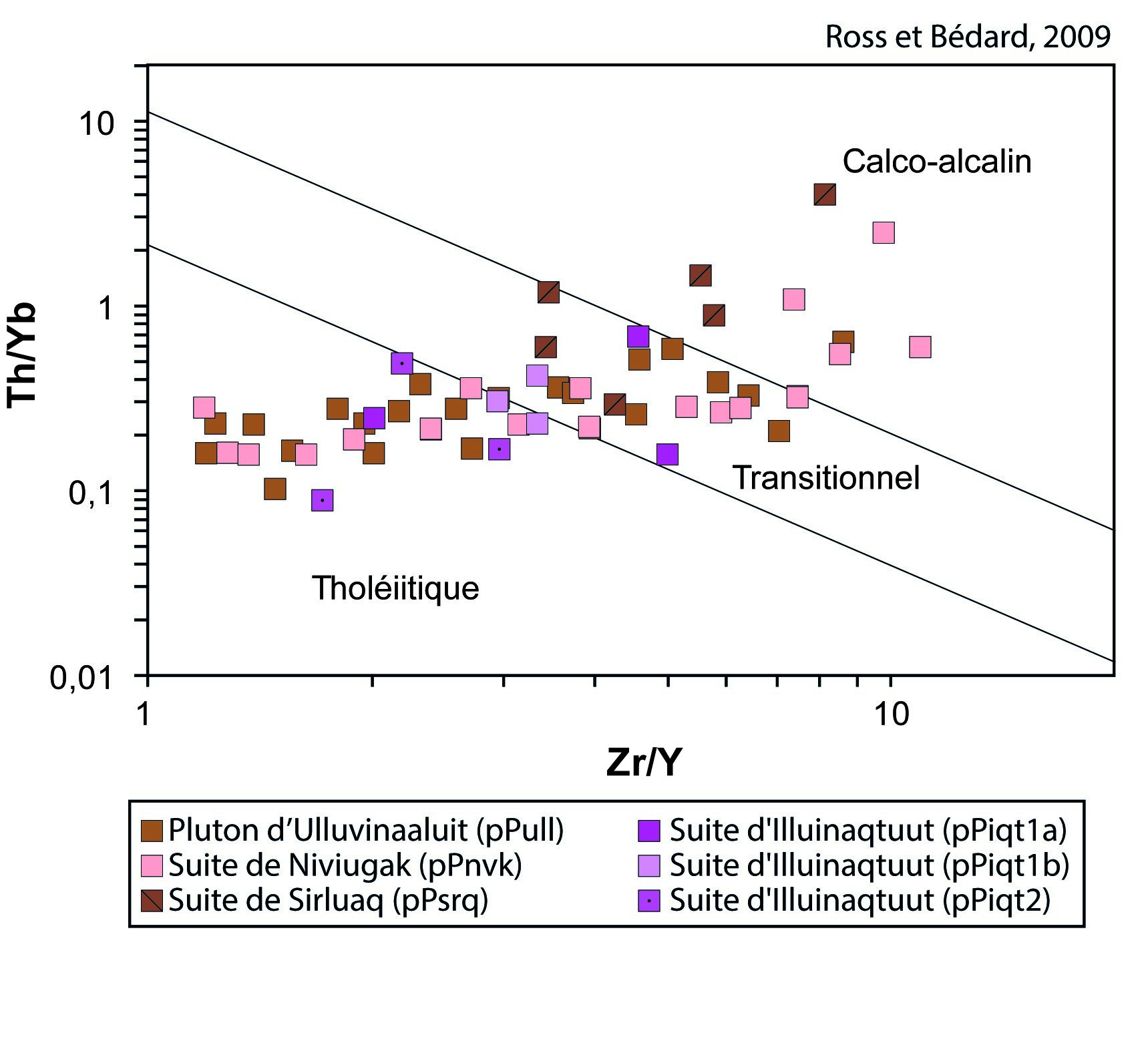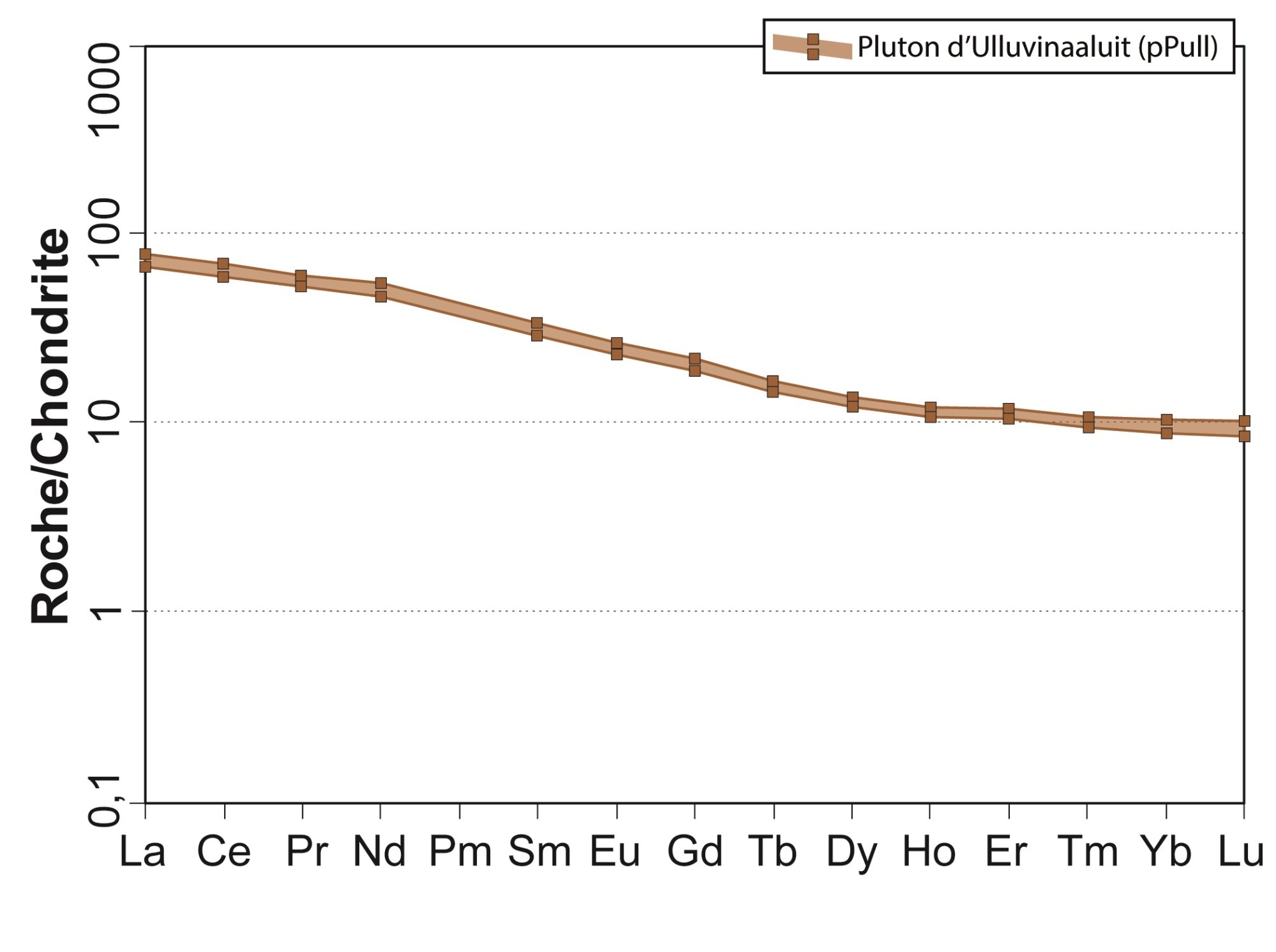 La similarité des diagrammes d’affinité magmatique, d’environnement tectonique, des spectres de terres rares du Pluton d’Ulluvinaaluit et de la Suite de Niviugak indique une origine commune. |