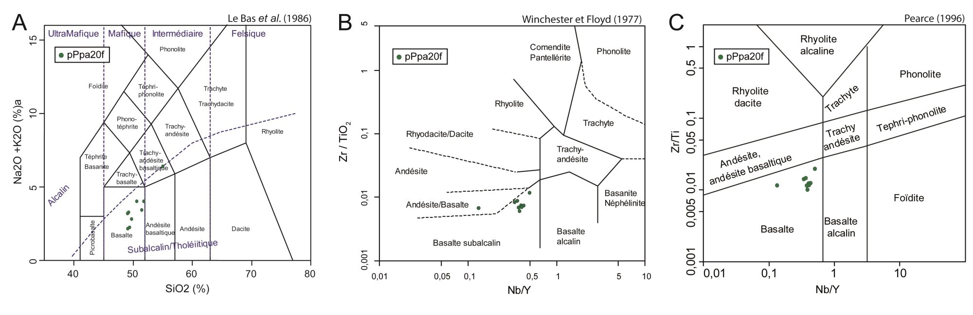 LE BAS, M.J., LE MAITRE, R.W., STRECKEISEN, A., ZANETTIN, B., 1986. A chemical classification of volcanic rocks based on the total alkali–silica diagram. Journal of Petrology; volume 27, pages 745-750. doi.org/10.1093/petrology/27.3.745