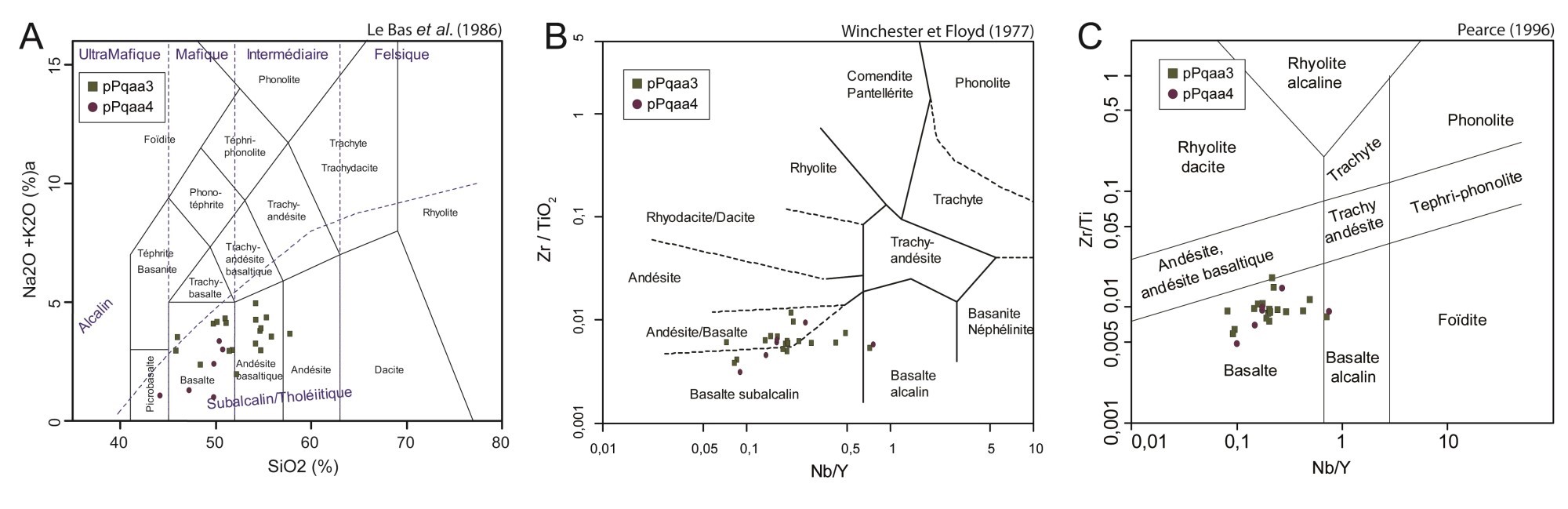 Basalte subalcalin, basalte andésitique, andésite et trachyandésite basaltique |
