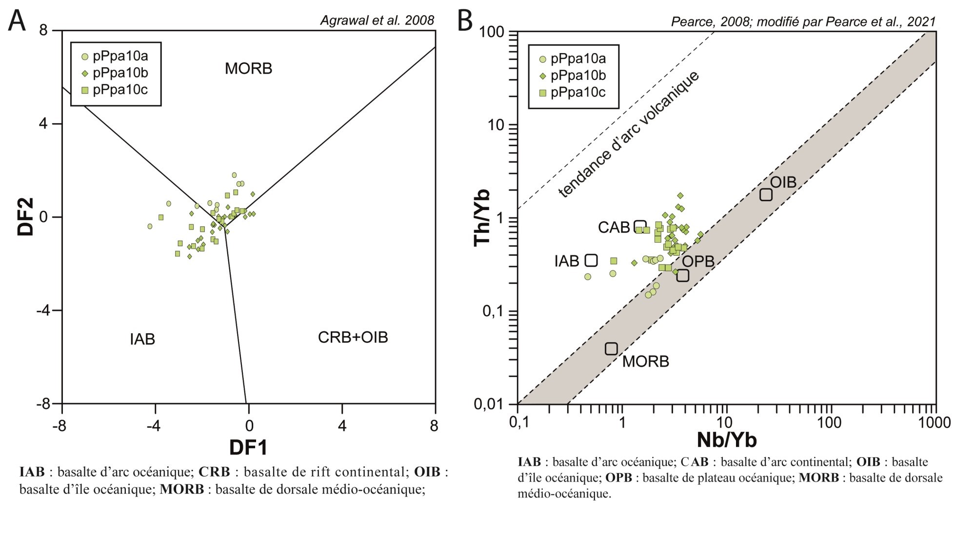 Tholéiitique à transitionnel (Diagramme); Magnésien, calcique à calco-alcalin et métalumineux (type I) |