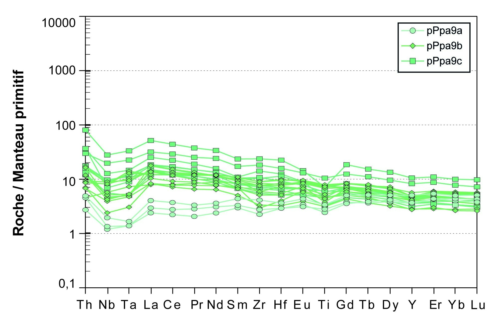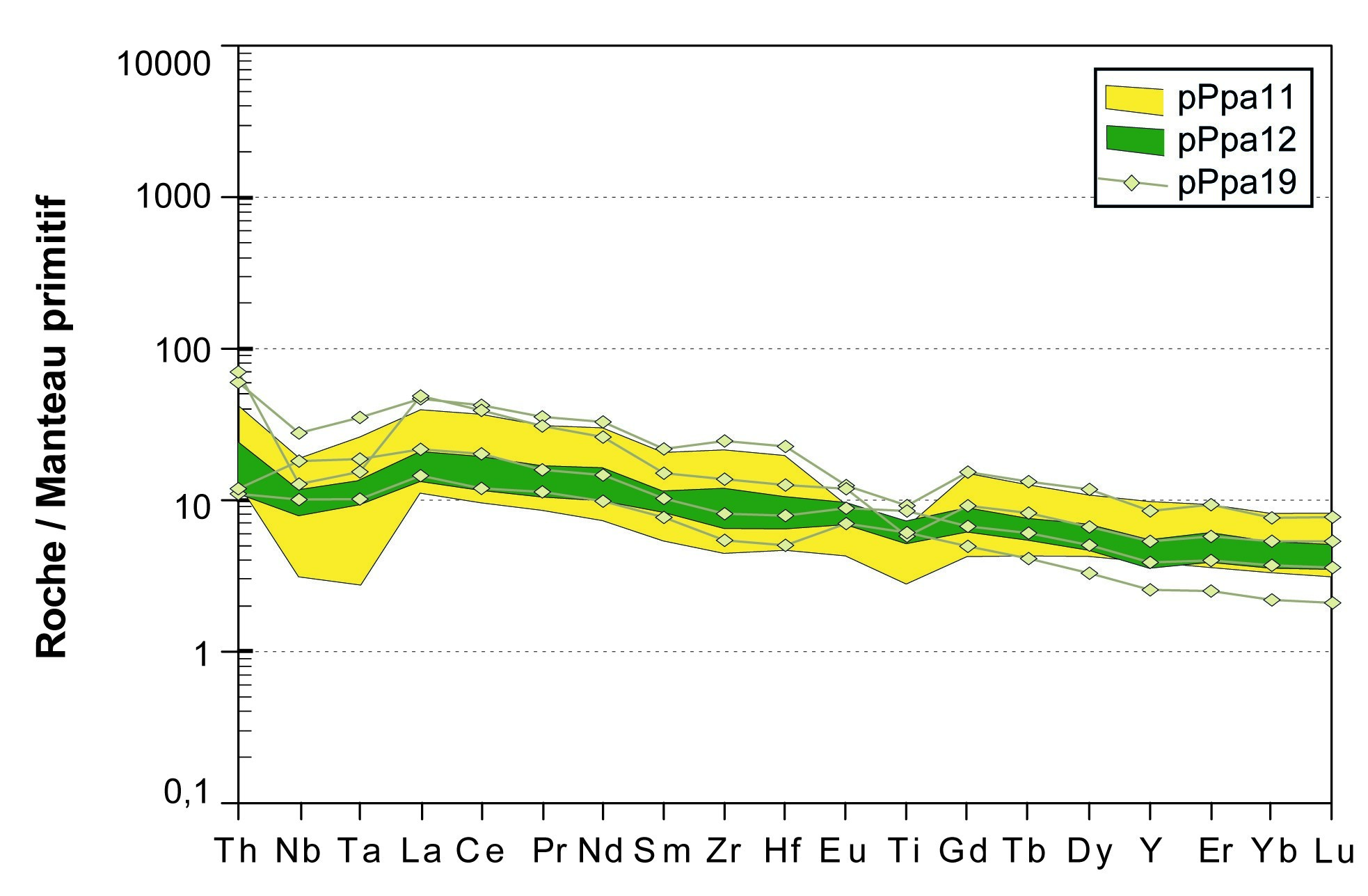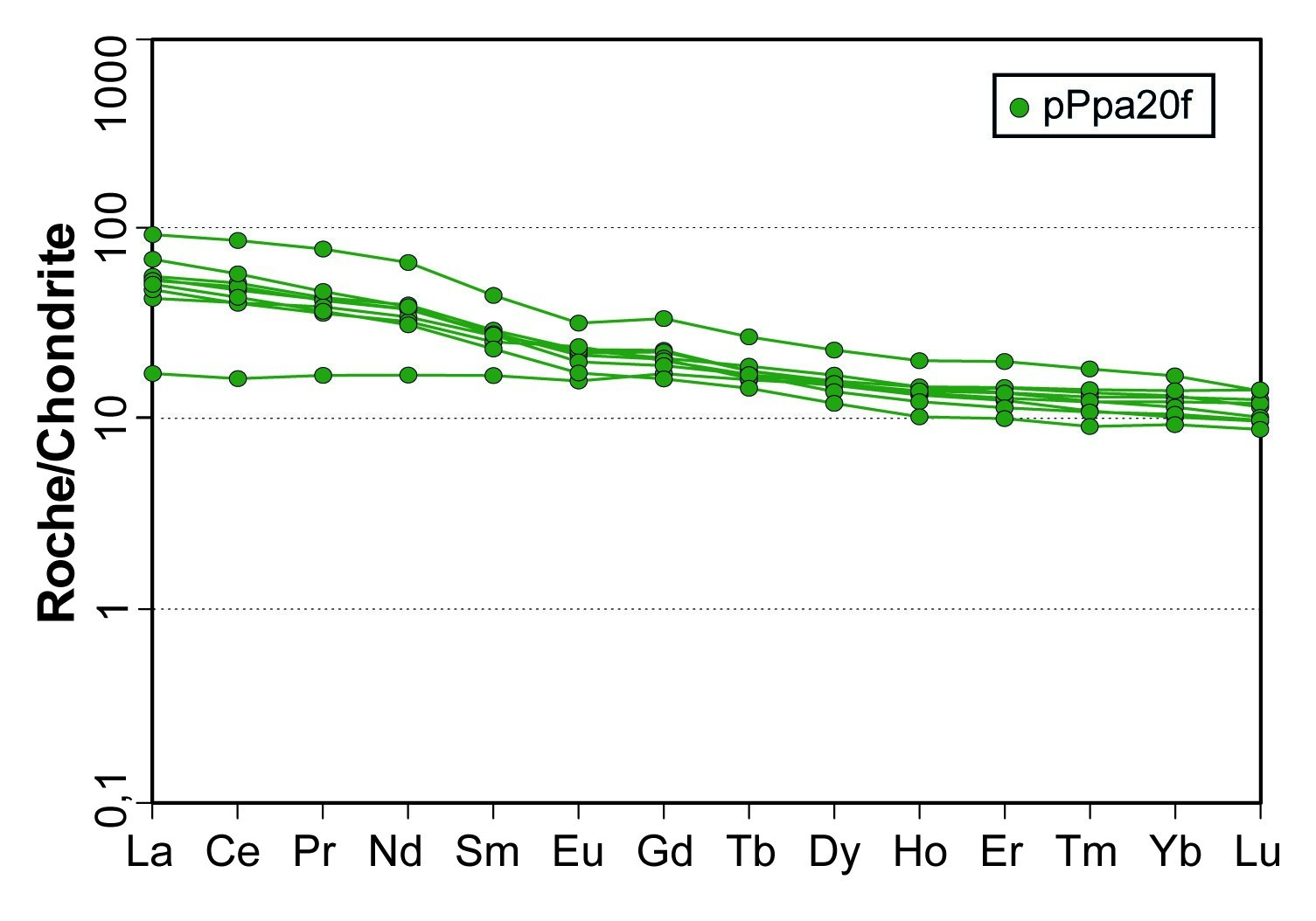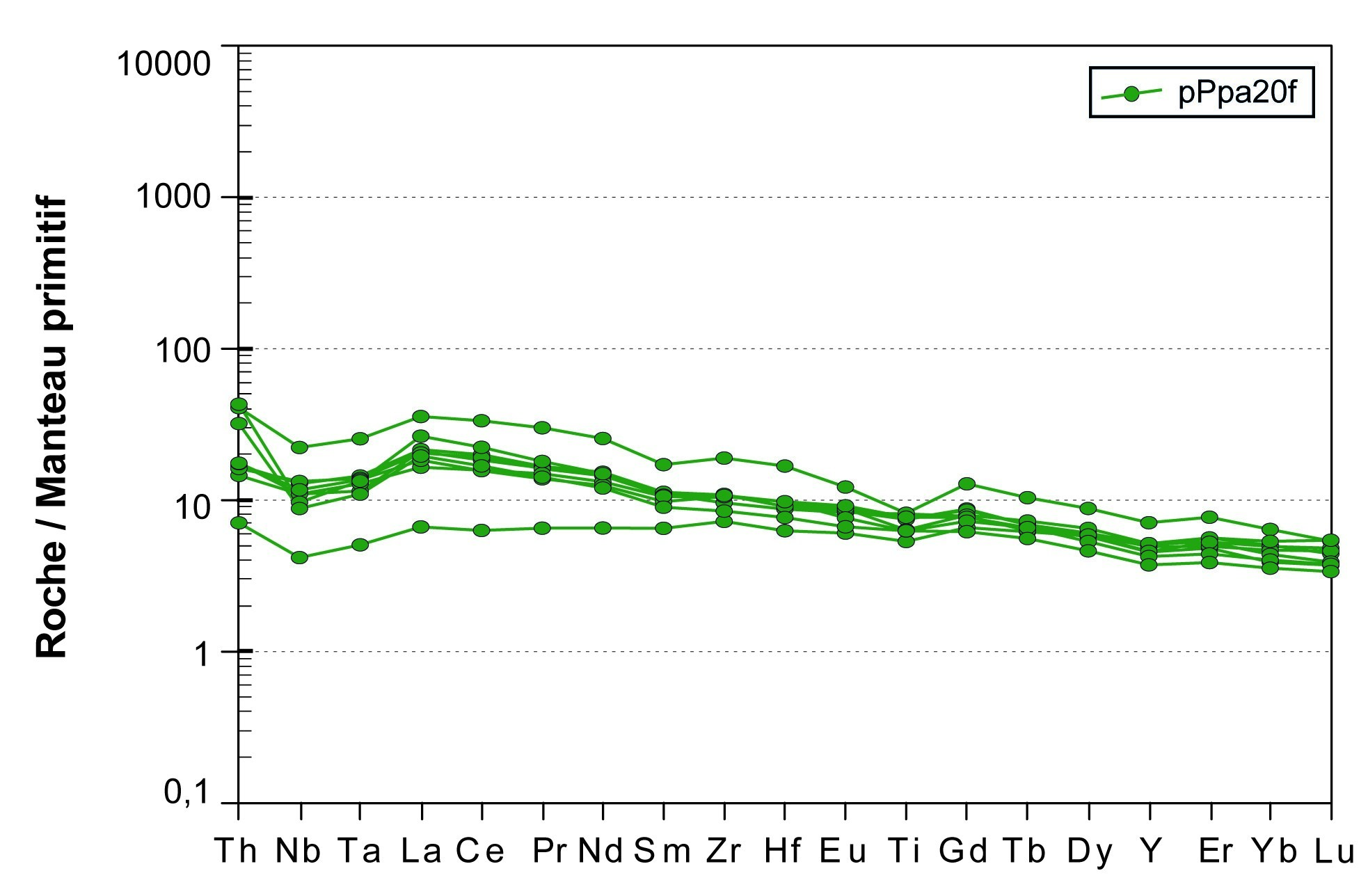 Très similaire à pPpa12 et pPpa10c; Pente modérément négative; Enrichissement des terres rares légères par rapport aux terres rares lourdes; Forte anomalie négative en Nb et Ta pouvant résulter d’une contamination crustale |