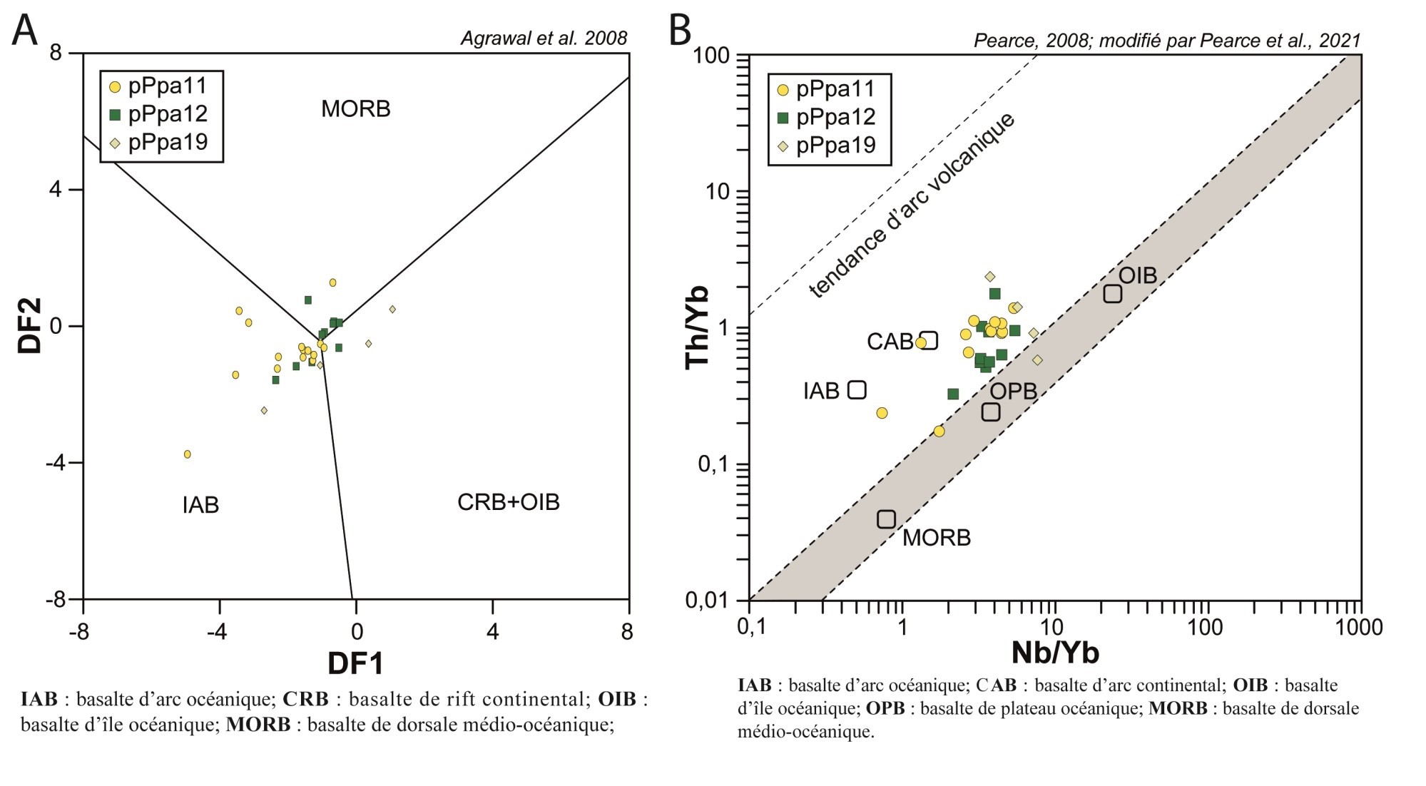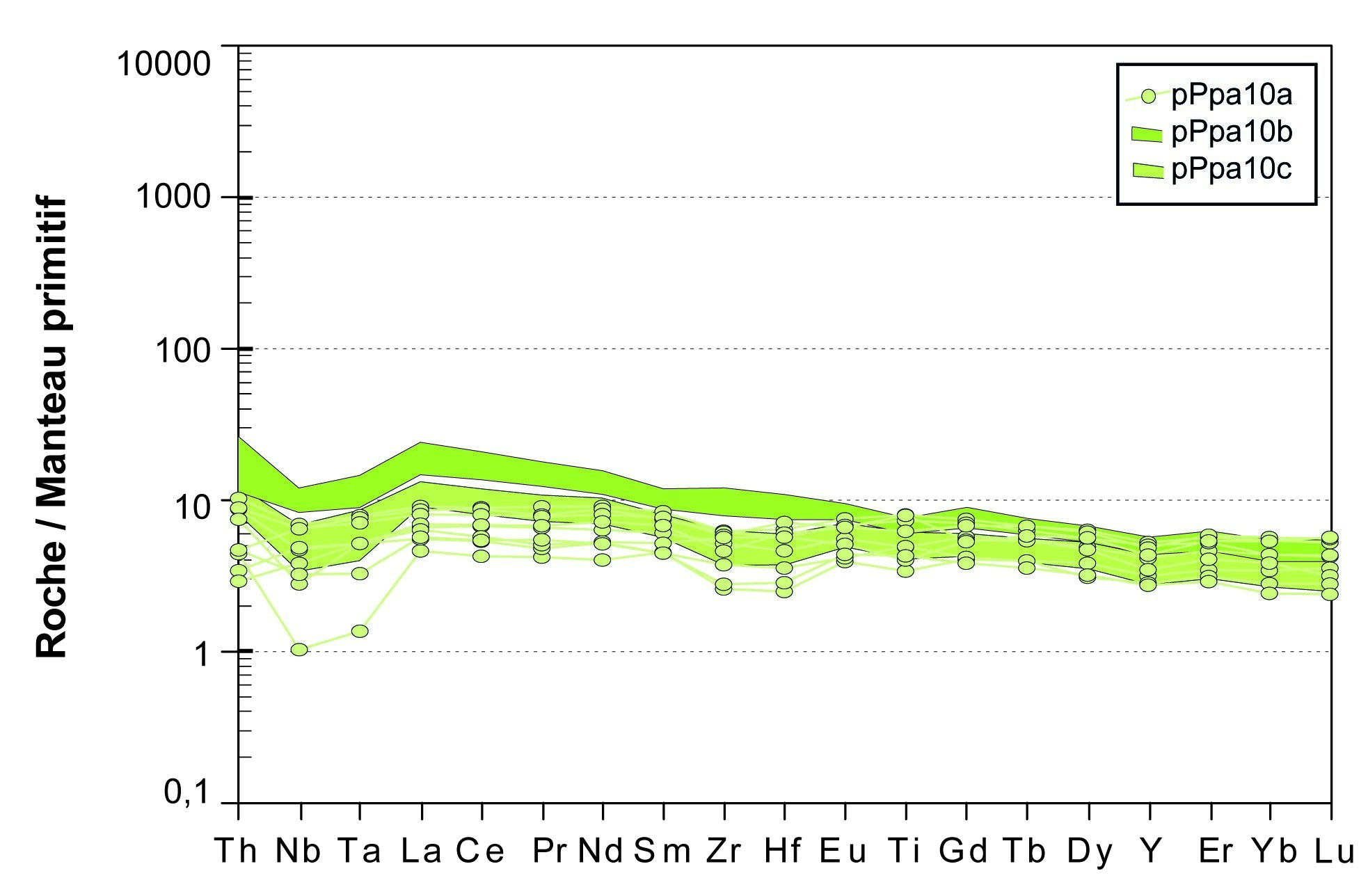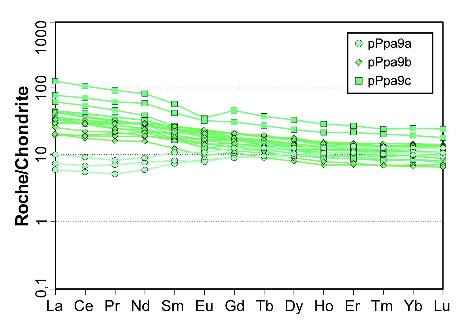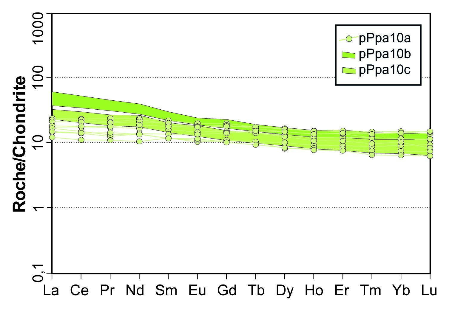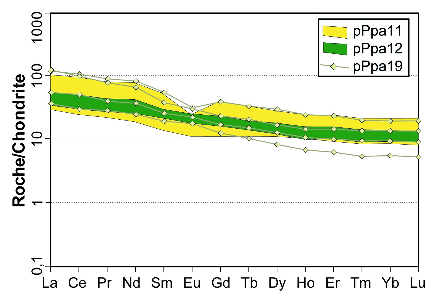 Très similaire à pPpa12 et pPpa10c; Pente modérément négative; Enrichissement des terres rares légères par rapport aux terres rares lourdes; Forte anomalie négative en Nb et Ta pouvant résulter d’une contamination crustale |