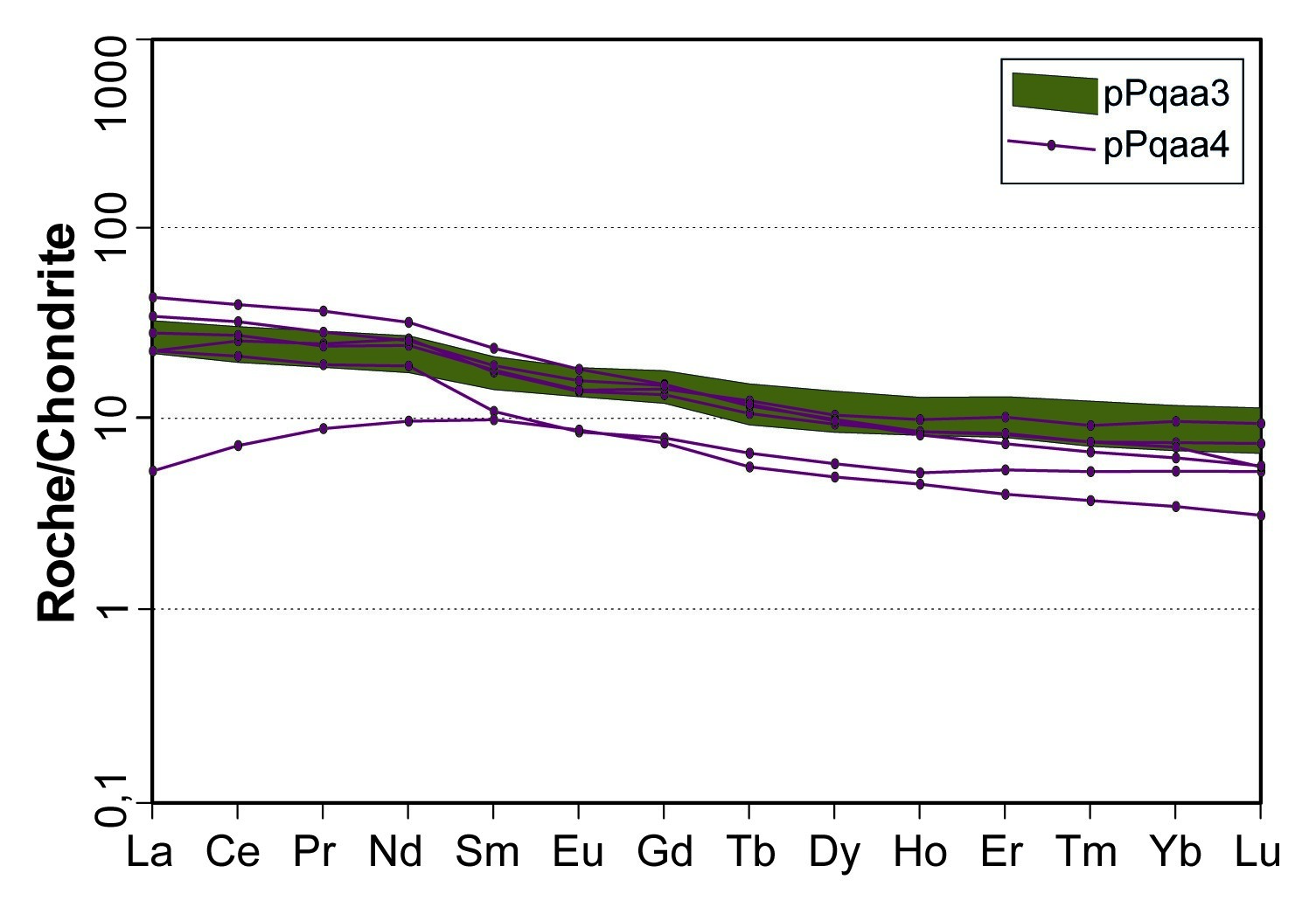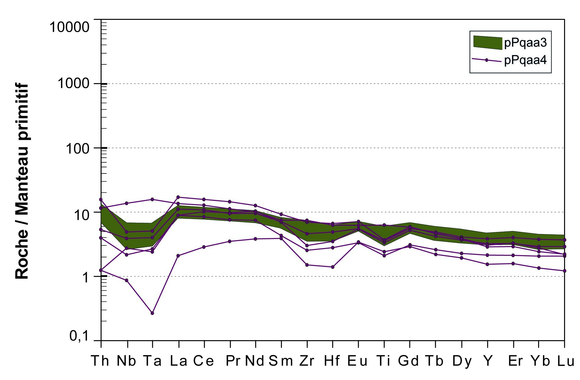 Pour les unités géologiques comprenant plus de 10 analyses, les profils des éléments de terres rares et multiéléments sont regroupés pour constituer des enveloppes comprenant les 25e et 75e percentiles de la population. Cette procédure a été retenue pour simplifier la visualisation d’un grand nombre de profils. Les enveloppes ainsi présentées sont donc données à titre indicatif.