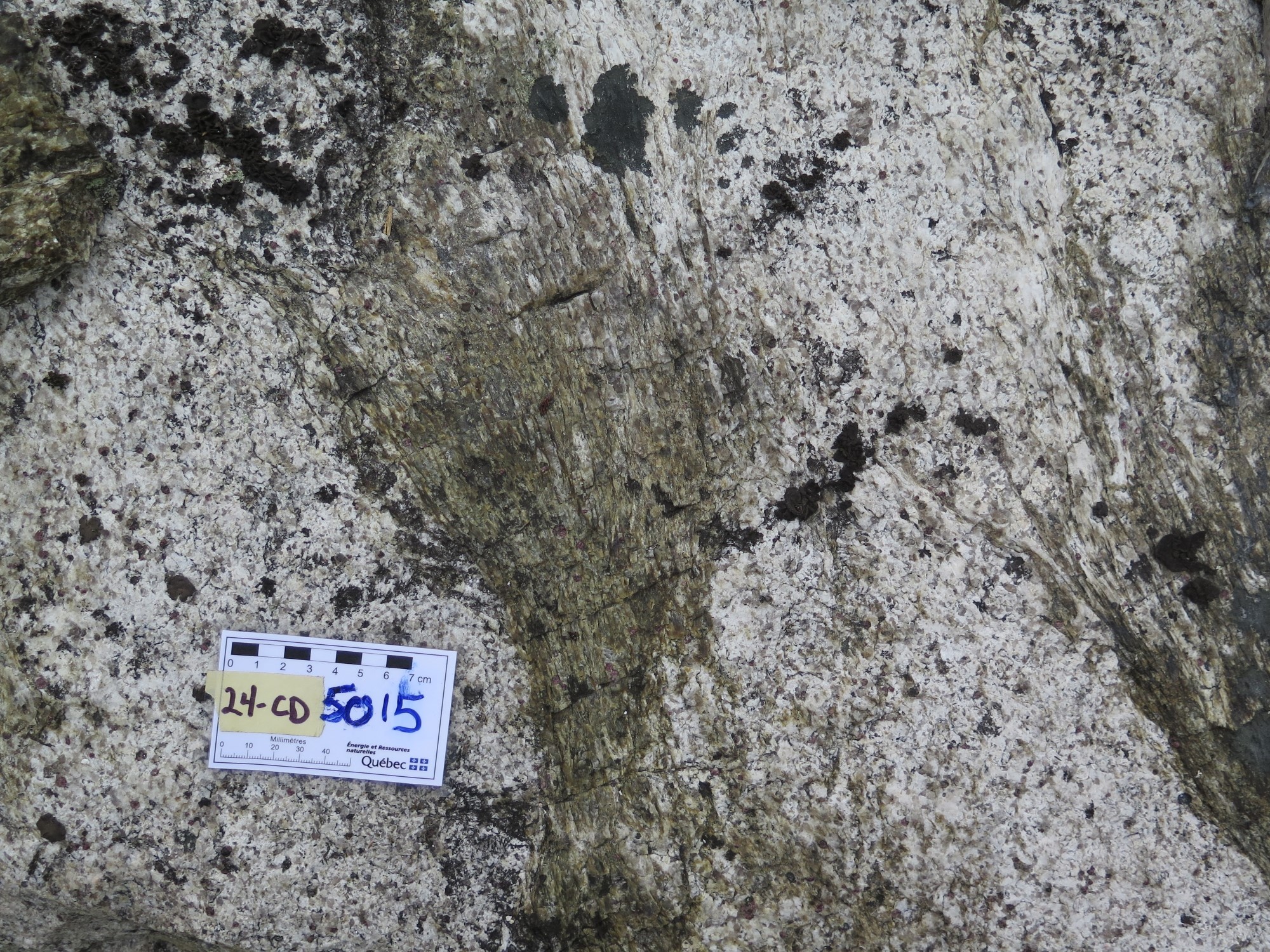 Plusieurs valeurs significatives et anomales, ainsi que des valeurs indicielles en lithium, césium et béryllium (zone minéralisée de Licé) ont également été obtenues dans du paragneiss, du quartzite et des roches métasomatiques de la Formation de Voirdye et de l’amphibolite basasaltique, des roches volcaniques felsiques à intermédiaires et des roches métasomatiques du Groupe de Tichégami. Ainsi, des valeurs comprises entre 30 et 2000 ppm Li, 8 à 32 ppm Ta et 5 à 977 ppm Cs ont été obtenues dans des roches autres que de la pegmatite granitique. Sur la carte (voir carte interactive), ces analyses sont réparties le long d’un niveau coïncidant grossièrement avec la Zone de cisaillement de la Marée qui coupe les roches volcano-sédimentaires de la ceinture du Lac des Montagnes.