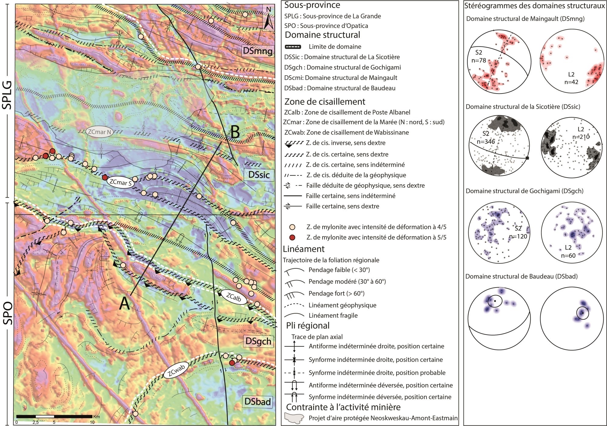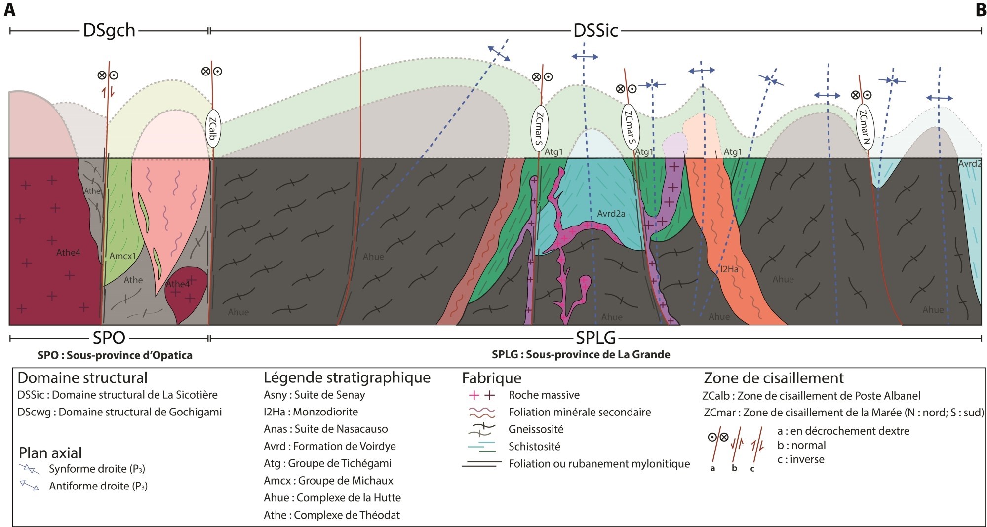 La carte structurale illustre ces domaines et zones de cisaillement, tandis que l’interprétation des relations en profondeur est présentée sur la coupe structurale.