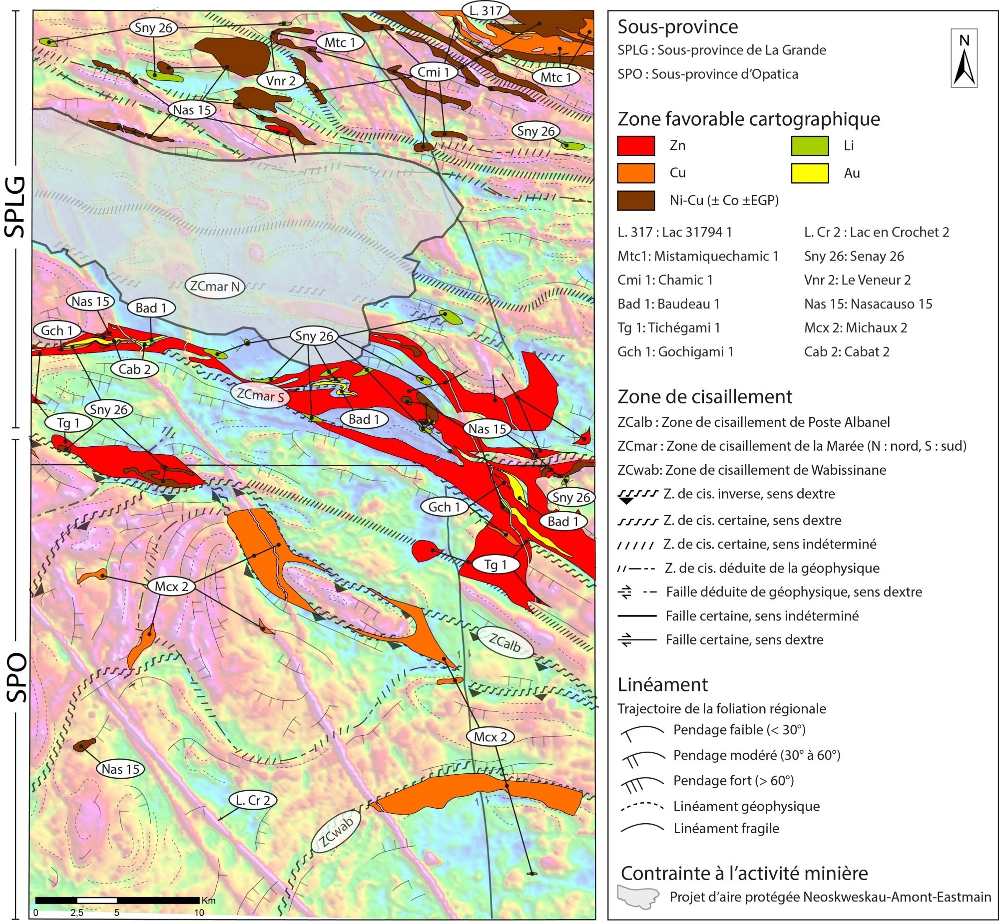 - Le secteur NE de la région du lac Chamic se distingue nettement du reste de la région par une susceptibilité magnétique élevée, un faciès métamorphique plus élevé (faciès des granulites dans toutes les roches) et des structures réorientées d’E-W vers le NW-SE. La carte tectonostratigraphique de Cleven et al. (2020) suggère que ce secteur corresponde à un domaine métasédimentaire transitionnel entre le La Grande et l’Opatica. Nos travaux ont identifié de nouvelles unités de socle plutono-gneissique migmatitisées, fortement injectées d’intrusions mafiques-ultramafiques kilométriques et recouvertes de roches volcano-sédimentaires. Il est recommandé de poursuivre vers l’est la cartographie détaillée de ce domaine qui semble marquer la zone transitionnelle entre l’Opinaca, au nord, et le La Grande, au sud;