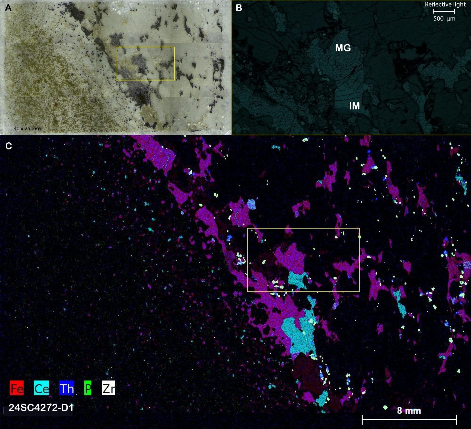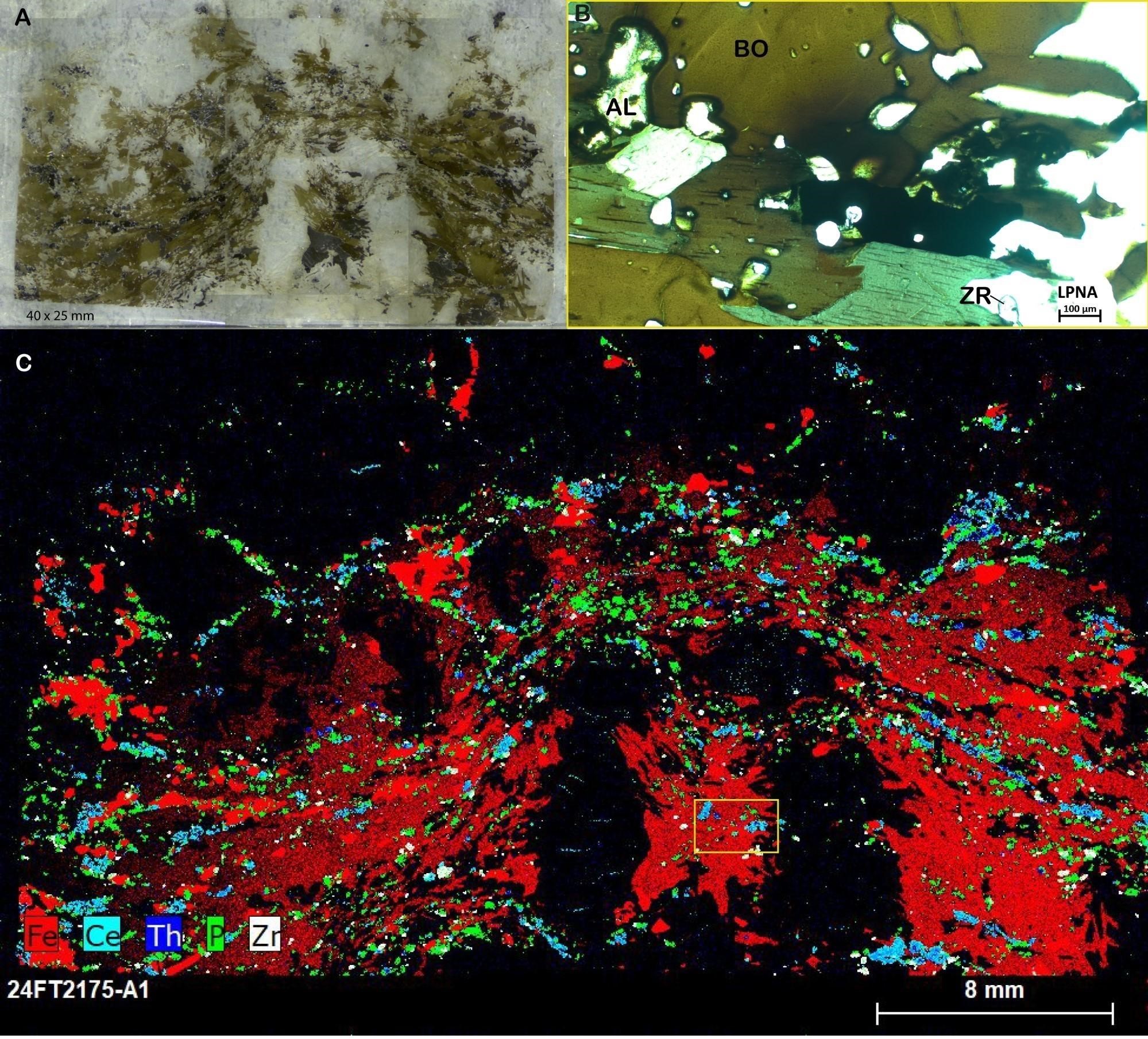 La zone minéralisée de Lac aux Brumes regroupe les affleurements 24-FT-2175 et 24-SC-4272. Sur le terrain, les mesures du rayonnement gamma (spectromètre RS-230) ont donné jusqu’à 4900 cps dans le cas de l’affleurement 24-FT-2175. Cette réponse est élevée dans les zones à forte proportion de biotite. L’observation de lame mince en lumière polarisée analysée montre que la minéralisation est portée par l’apatite, la thorite et le zircon. L’observation est confirmée par l’analyse de la carte de microdiffraction des rayons X réalisée à l’aide du microXRF de l’Université Laval, qui montre la répartition du cérium, du thorium, du phosphore, du zirconium et du fer. Deux échantillons choisis de ces roches ont livré des valeurs indicielles en ETR (8431 ppm ETR(total), dont 4100 ppm Ce et 1980 ppm La), 1730 ppm Th et 4193 ppm Zr pour un échantillon de syénite quartzifère (24-FT-2175A) et 1160 ppm Th dans un dyke décimétrique de syénogranite (24-SC-4272D).