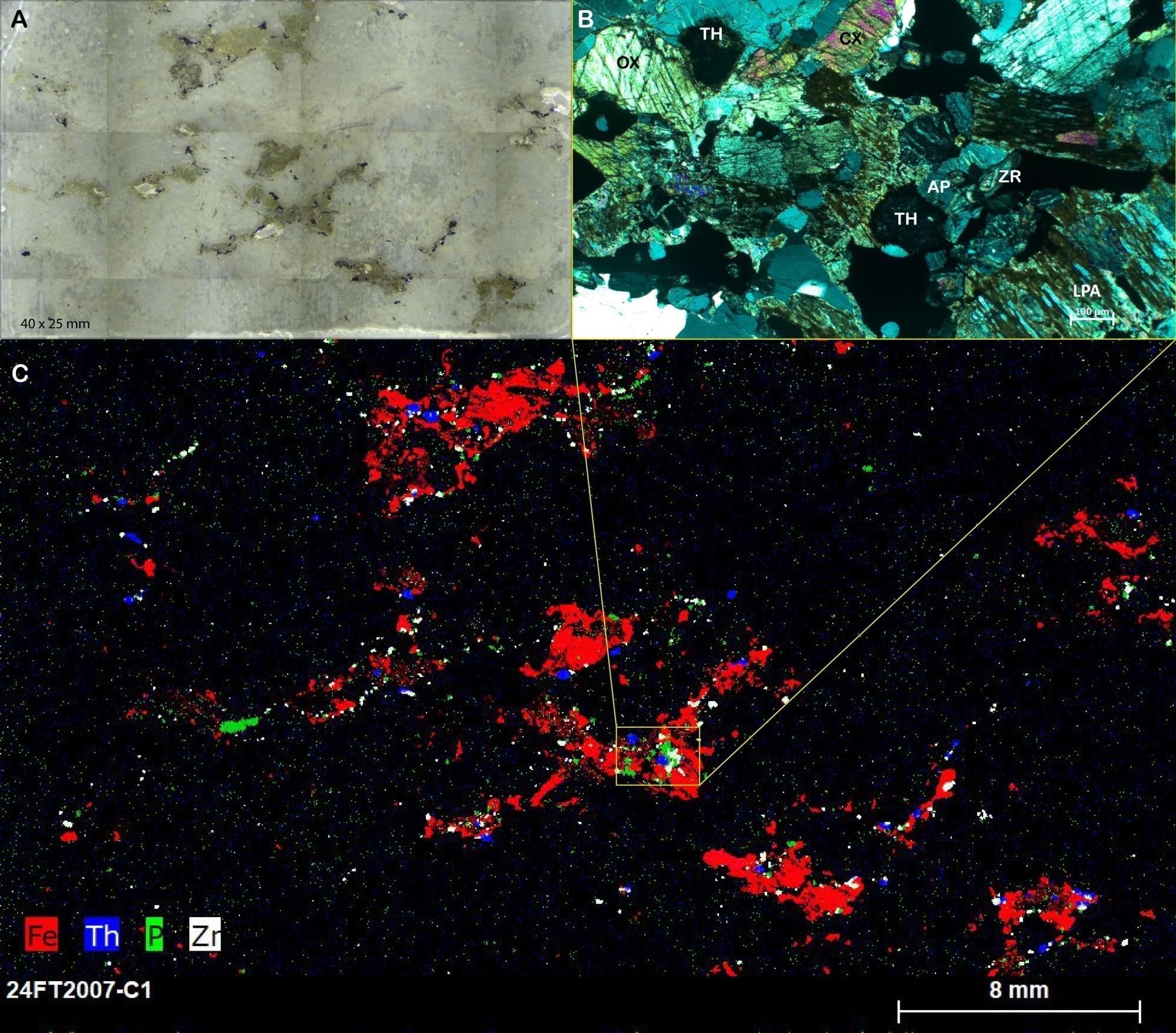 La zone minéralisée du Lac de l’Horloge est définie par l’affleurement 24-FT-2007. Un échantillon choisi (24-FT-2007C) d’un dyke de syénogranite atteignant jusqu’à 20 cm d’épaisseur et coupant une syénite quartzifère du Complexe gneissique de Cap à l’Est, avec des enclaves plissées de gabbronorite et de paragneiss du Complexe gneissique de Saguenay, a retourné une valeur indicielle de 567 ppm Th. L’analyse de la carte de microdiffraction des rayons X montrant la répartition du thorium, du phosphore, du zirconium et du fer fait ressortir la minéralisation qui est portée par l’apatite, la thorite et le zircon.