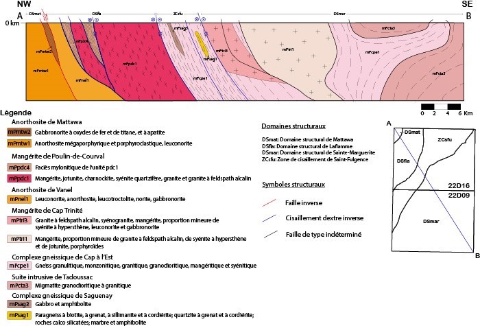 Afin de montrer les relations entre les différentes unités lithostratigraphiques de la région du lac Poulin-De Courval, une coupe structurale simplifiée dénotée AB a été réalisée selon une orientation NW-SE.