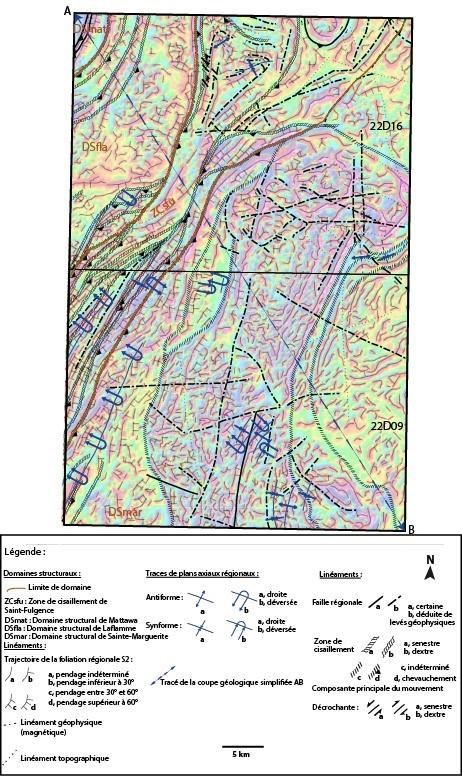 Dans la région cartographiée, les domaines structuraux et la Zone de cisaillement de Saint-Fulgence sont caractérisés de la façon suivante :
