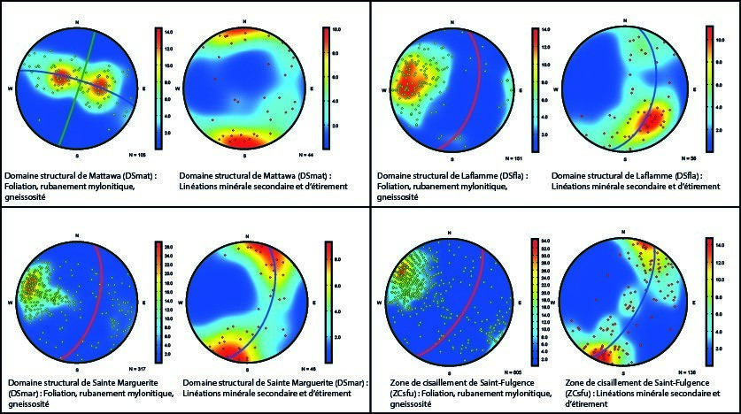 L’étude des caractéristiques structurales a permis de définir quatre domaines structuraux. La Zone de cisaillement de Saint-Fulgence sépare les domaines structuraux de Laflamme et de Mattawa, au NW, du Domaine structural de Sainte Marguerite, à l’est. Leurs descriptions détaillées sont données dans les fiches structurales de chacun des domaines, lesquelles sont accessibles en cliquant les hyperliens associés.