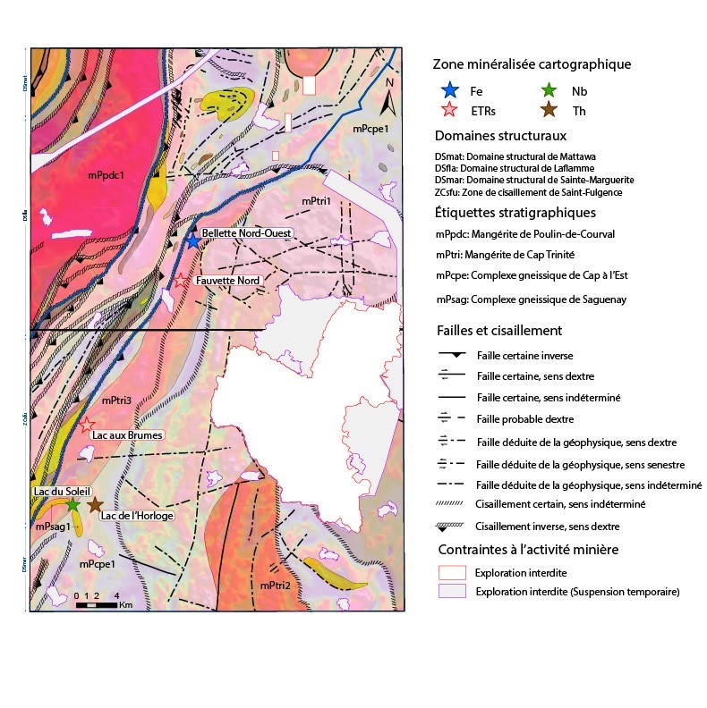 La nouvelle carte géologique à l’échelle 1/50 000 rehausse de manière notable les connaissances stratigraphiques, structurales et métallogéniques de la région du lac Poulin-De Courval. Cependant, la relation structurale et métamorphique entre la Zone de cisaillement de Saint-Fulgence et la mise en place des minéralisations en ETR reste à élucider.