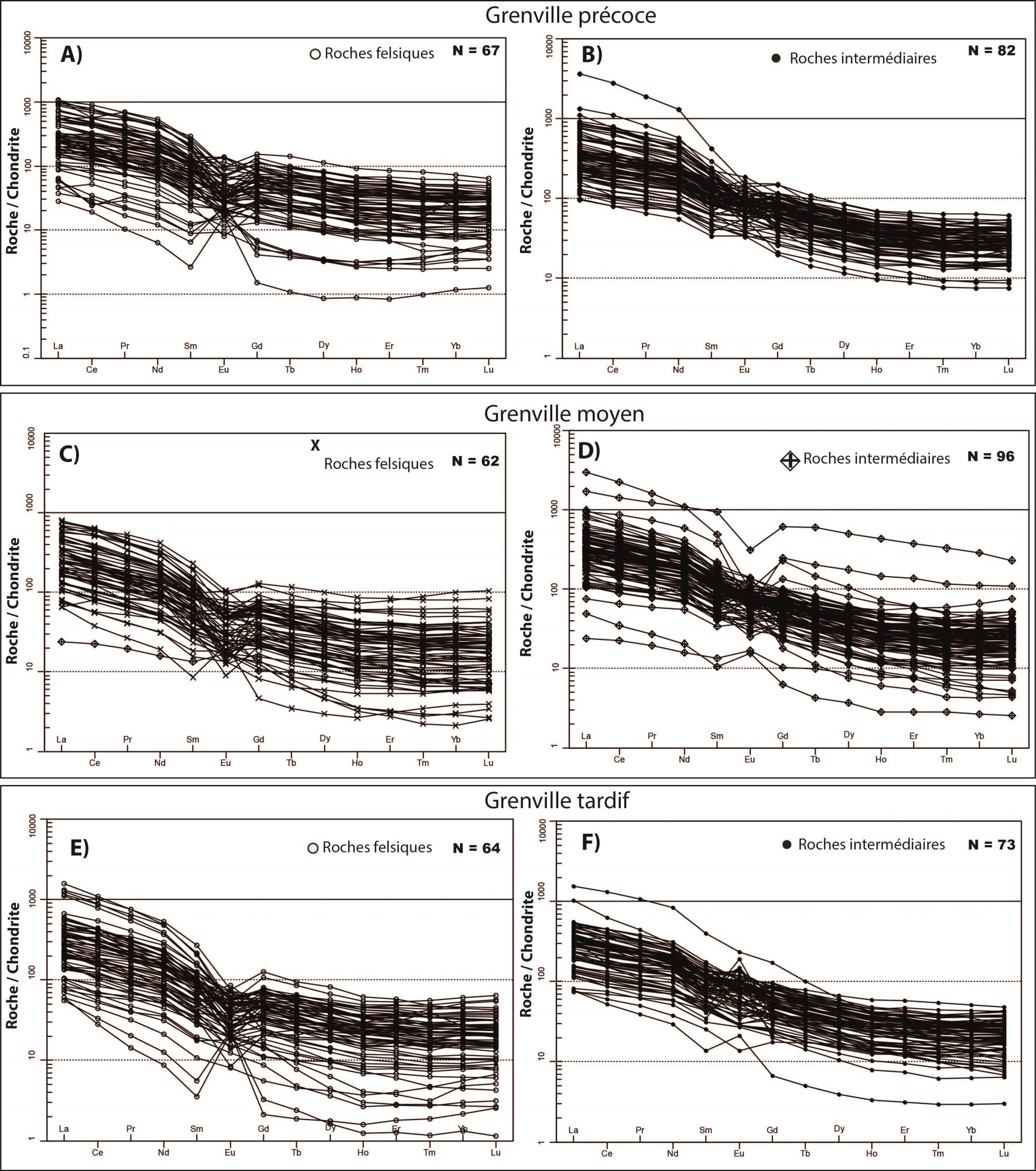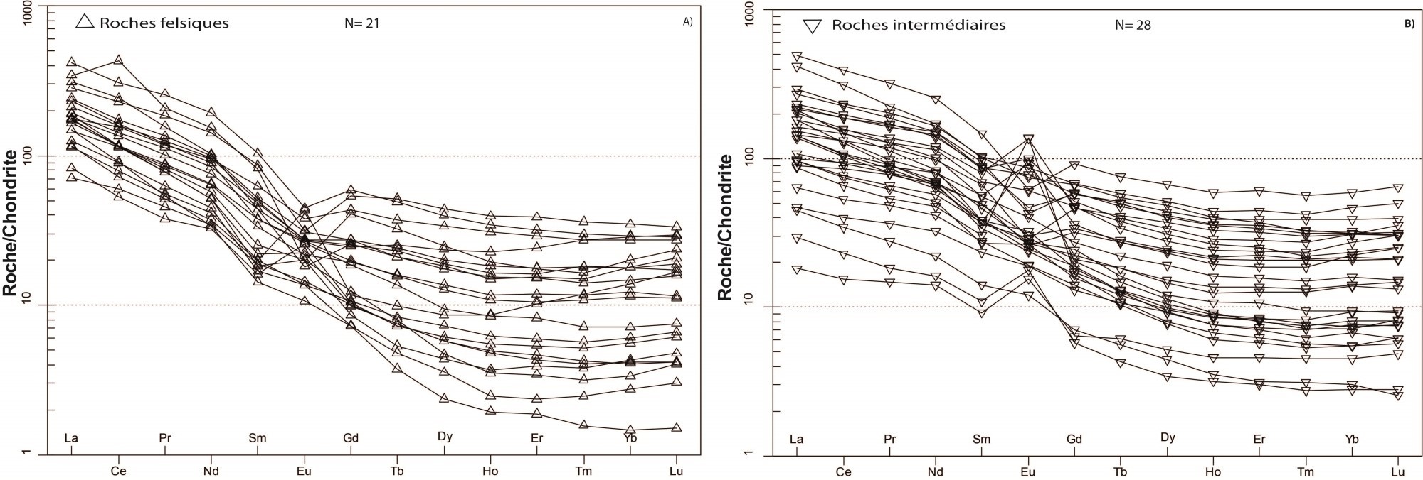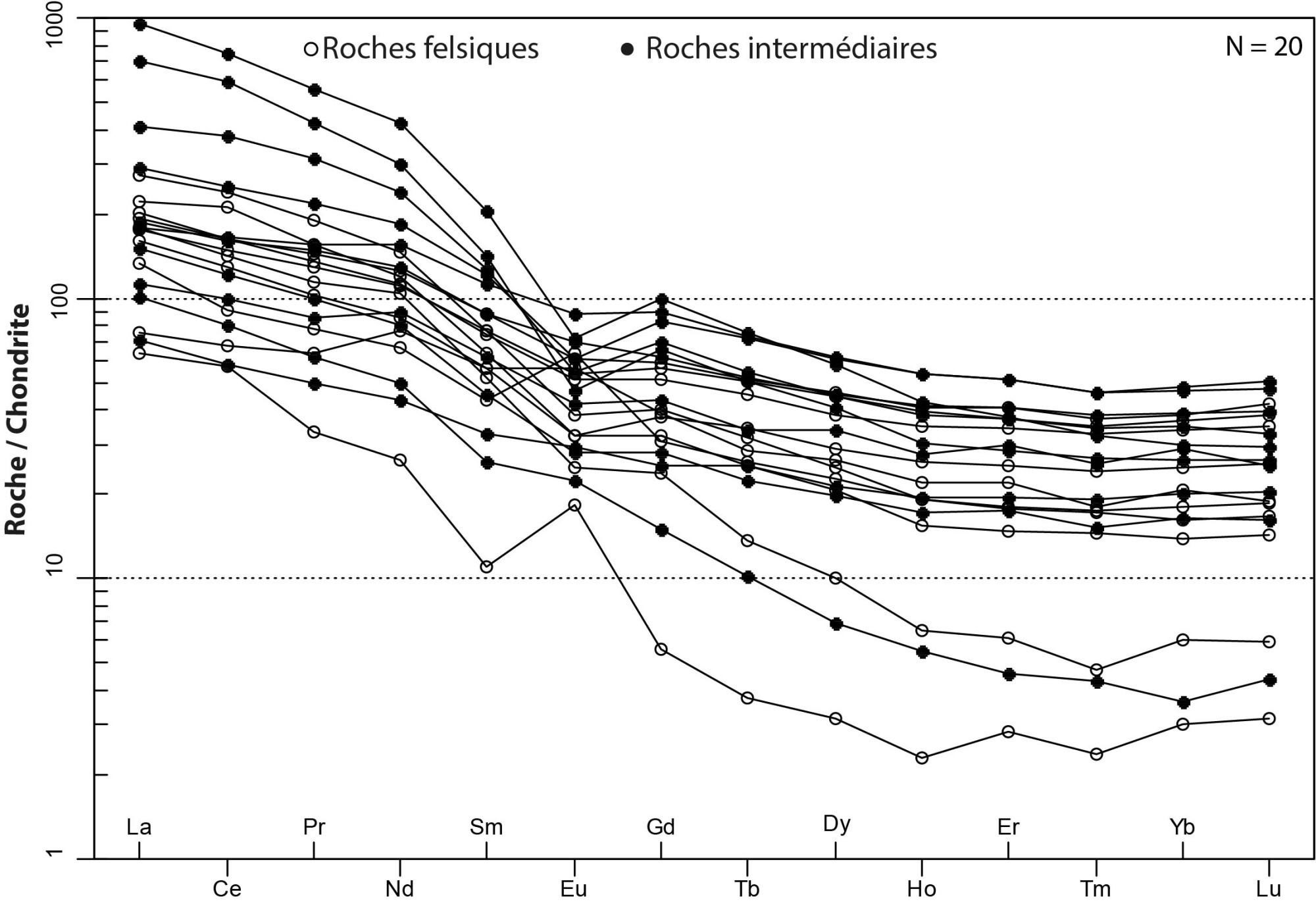 Profil à pente négative avec un léger enrichissement en ETR lourds 4,05 < (La/Yb)N < 85,87 1,75 < (La/Sm)N < 10,34 0,84 < (Gd/Yb)N < 4,94 0,34 < Eu/Eu* < 6,01 |