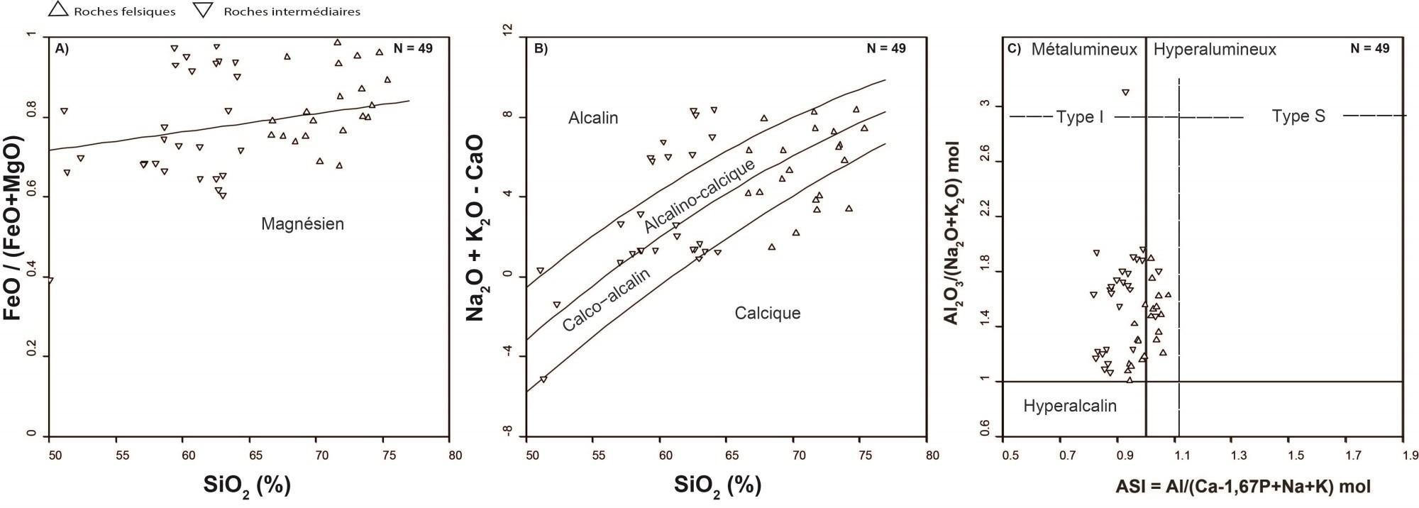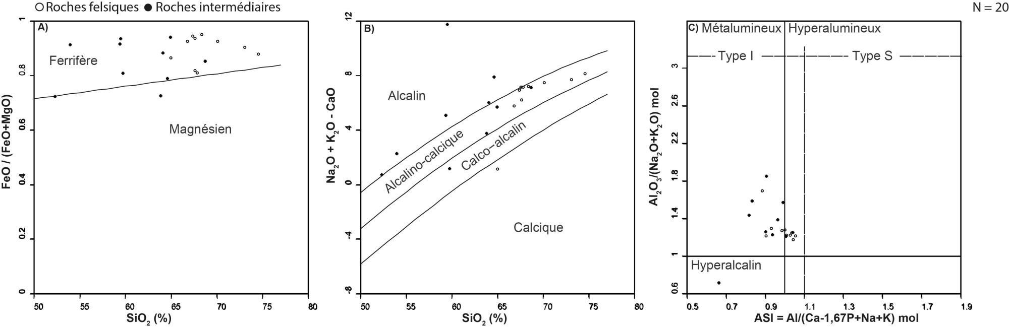 Magnésien et ferrifère, calcique à alcalin et métalumineux à hyperalumineux mais de type I | 1,58 à 60,72 |