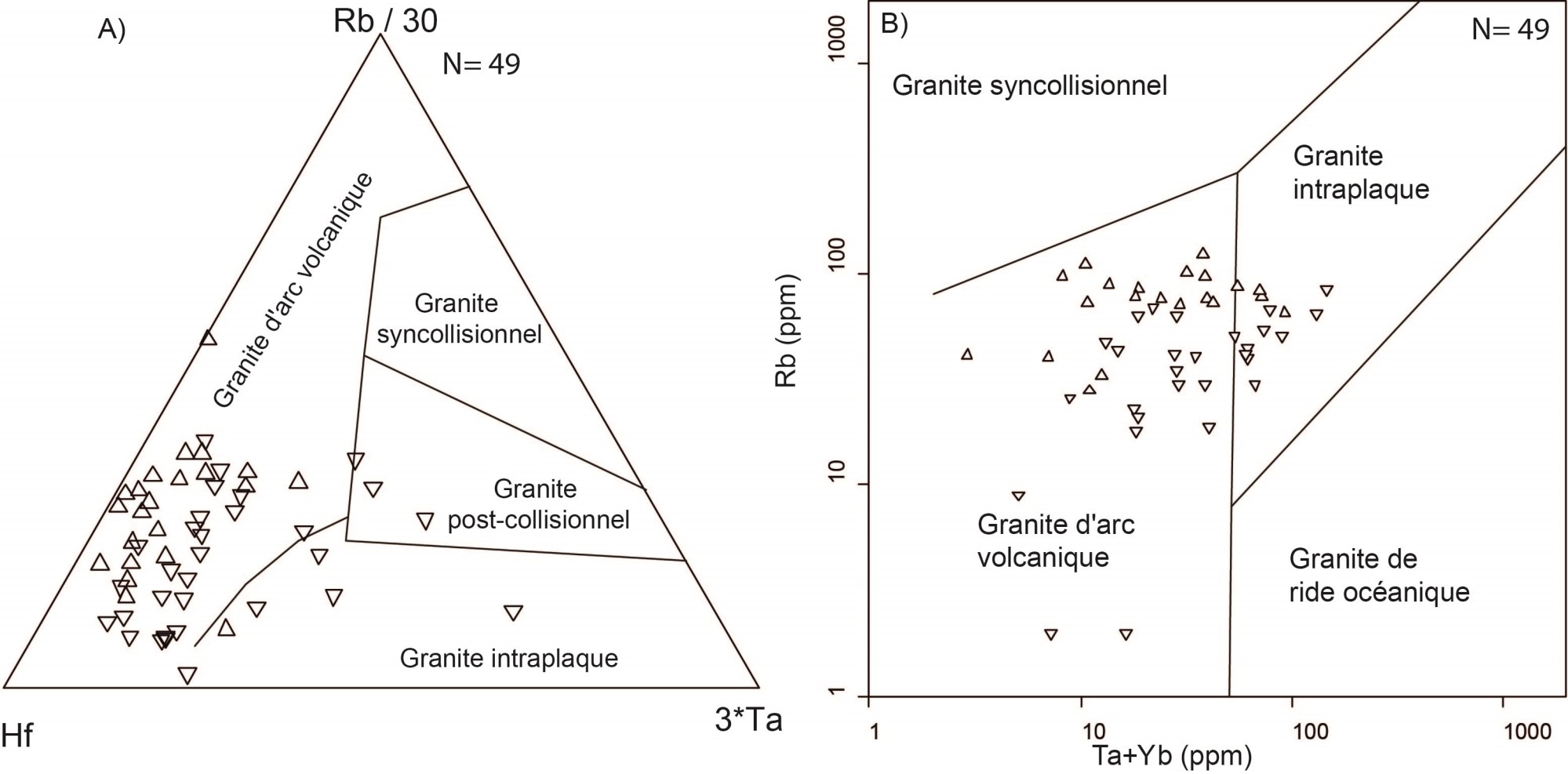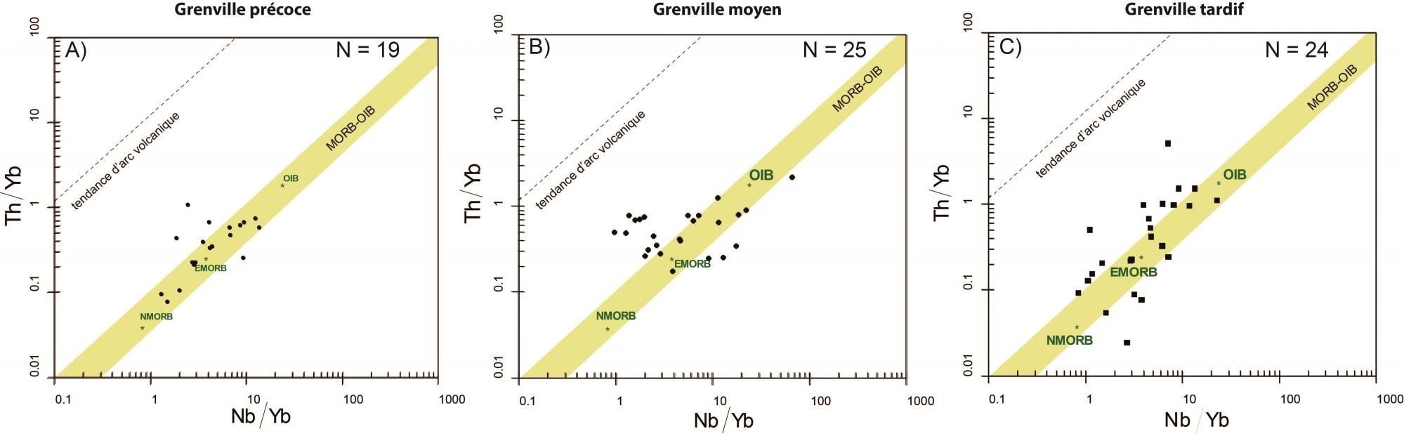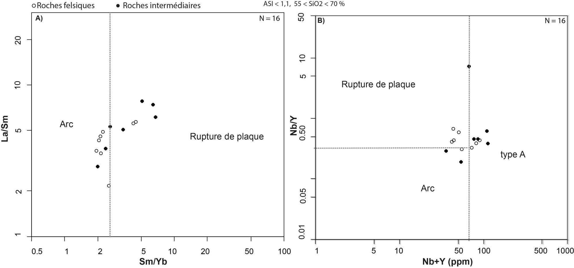 Généralement tendance d’arc volcanique et granite intraplaque |