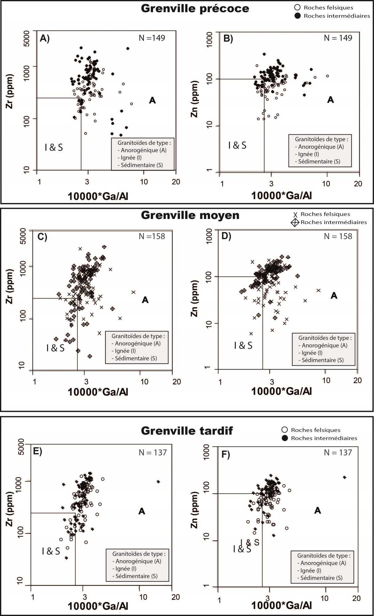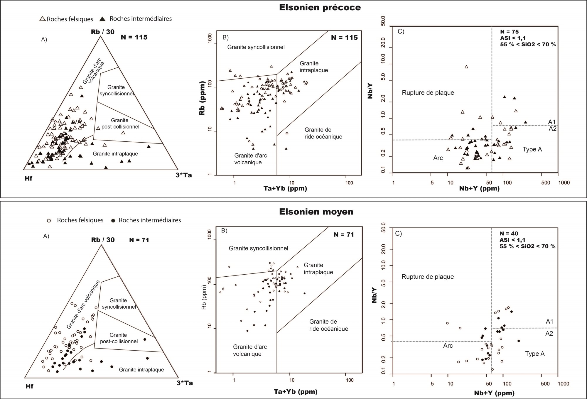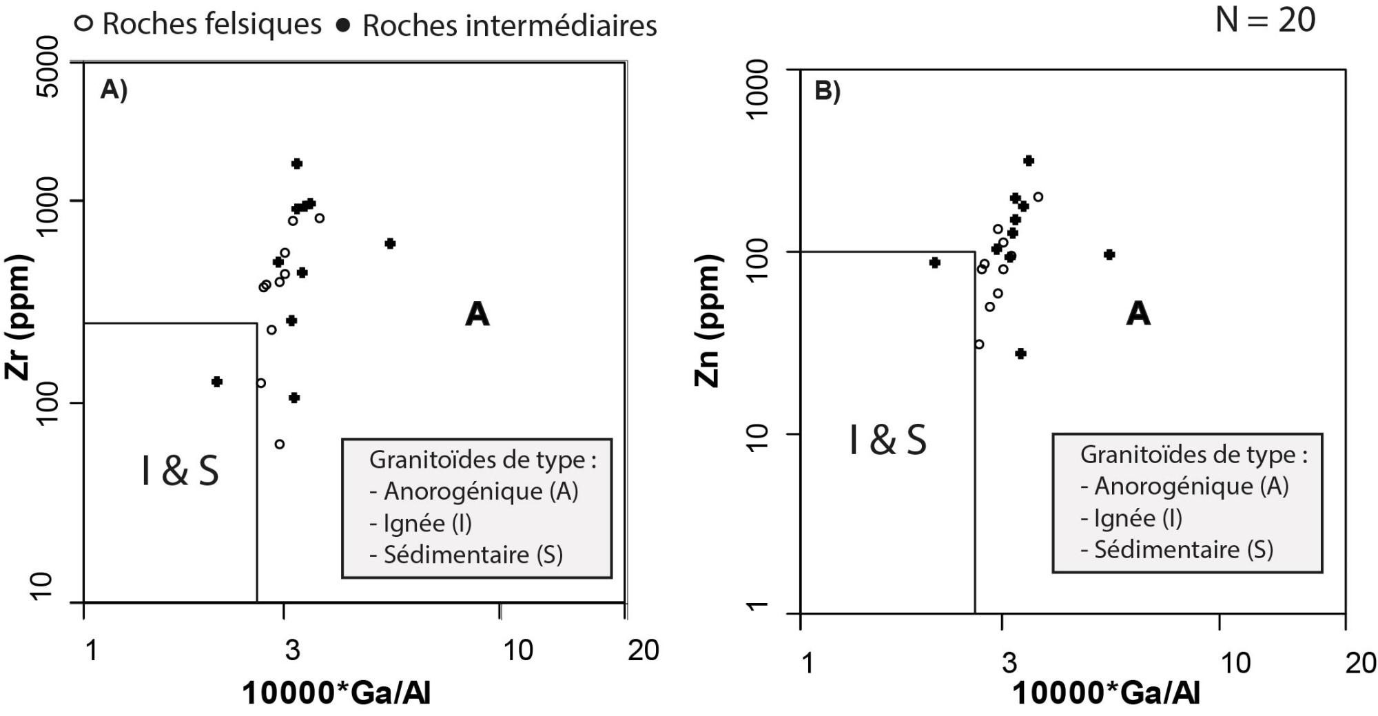 Généralement granite d’arc volcanique avec une tendance vers une rupture de plaque Surtout granite de type A |