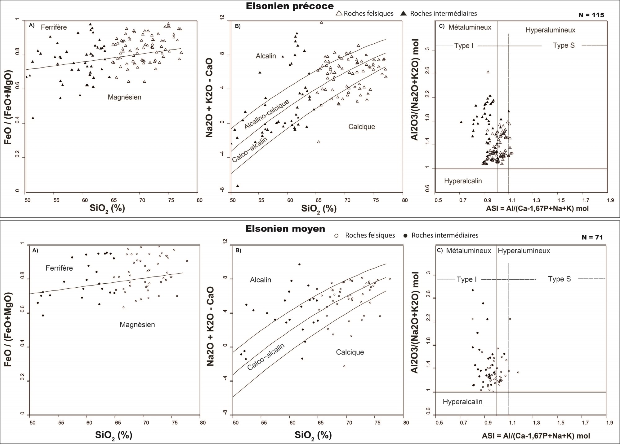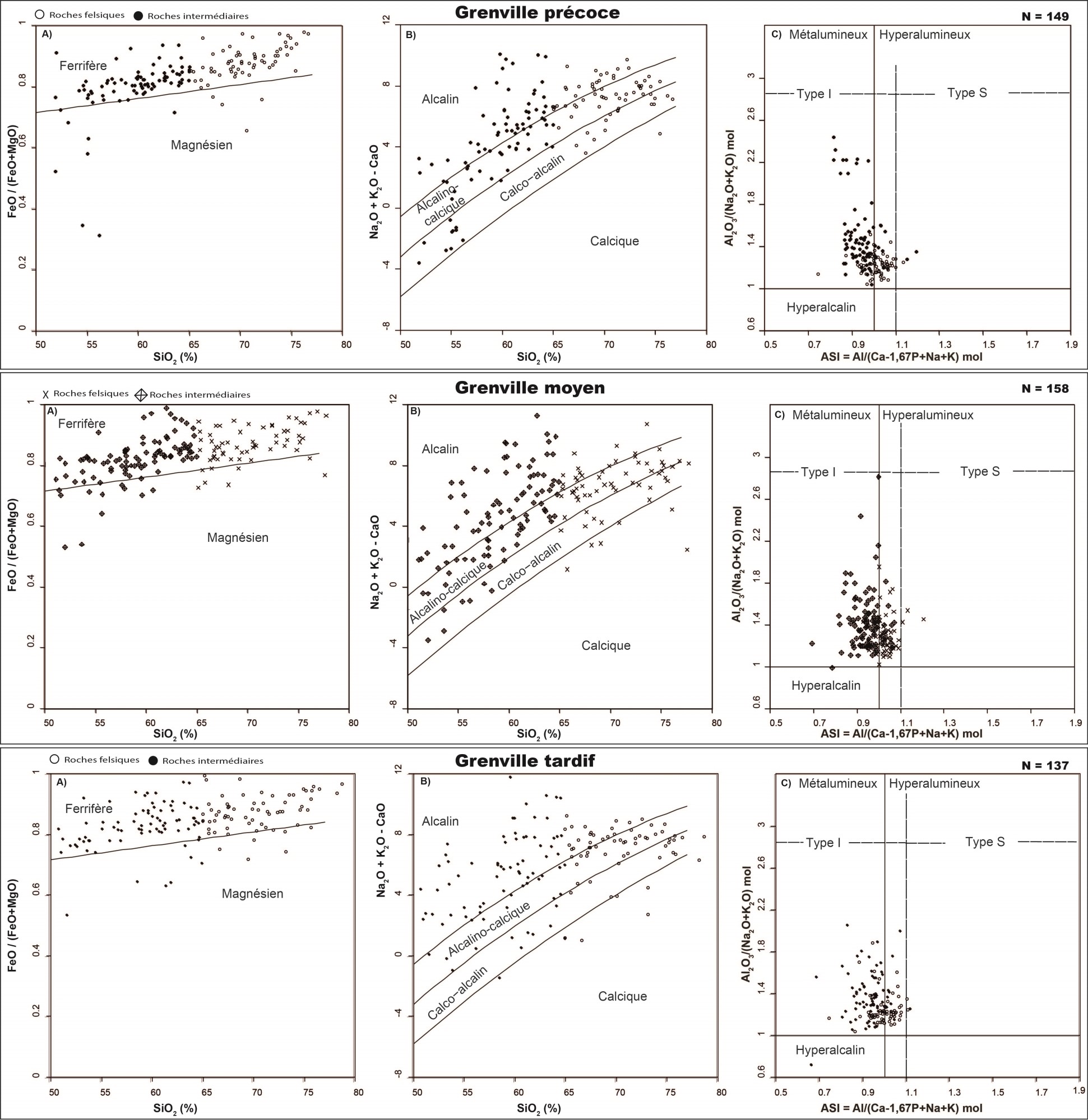 Surtout ferrifère, calco-alcalin à alcalin et surtout métalumineux (type I) |