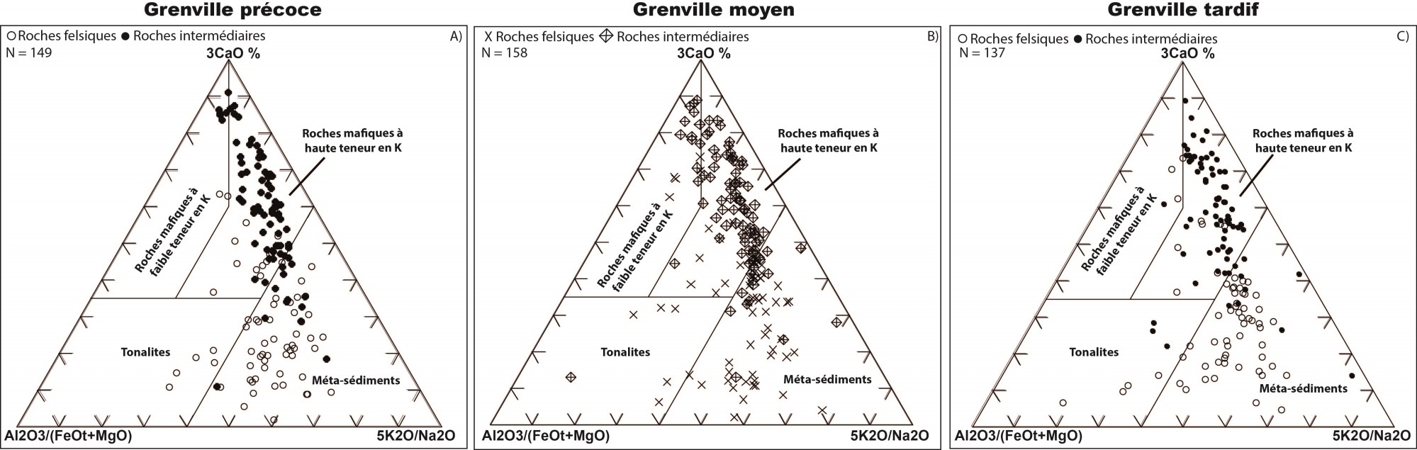 Sources métasédimentaires, roches mafiques à haute et faible teneur en potassium |