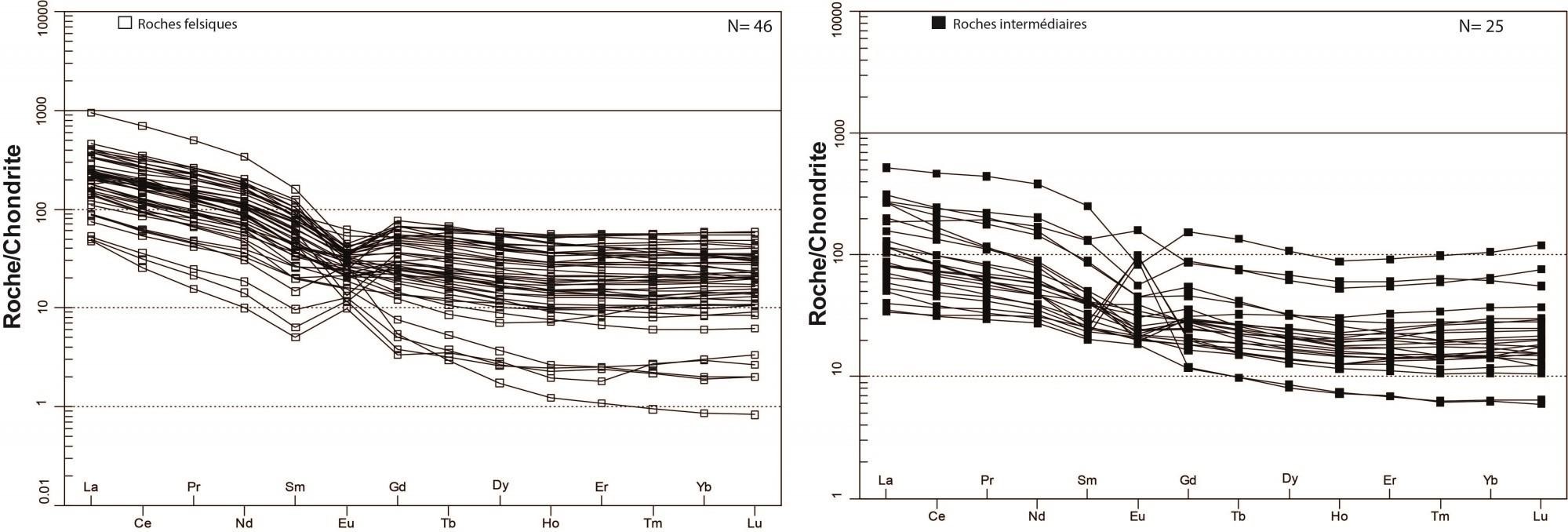 Profils plus ou moins plats avec un léger enrichissement en ETR légers vs ETR lourds 2,37 < (La/Yb)N < 25,26 1,05 < (La/Sm)N < 3,93 1,23 < (Gd/Yb)N < 4,74 0,37 < Eu/Eu* < 1,58 |
