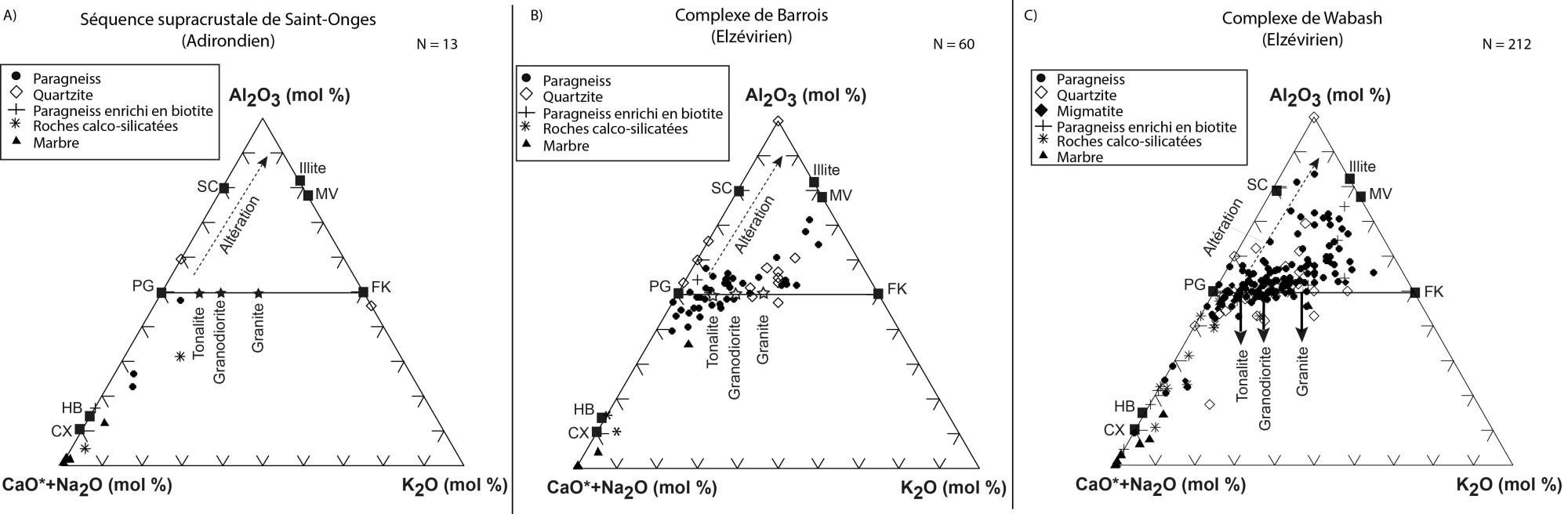 Roches sédimentaires dérivées de la croûte supérieure (tonalite, granodiorite, granite); généralement, les roches métasédimentaires sont faiblement altérées et le paragneiss à biotite et graphite montre une altération plus prononcée |