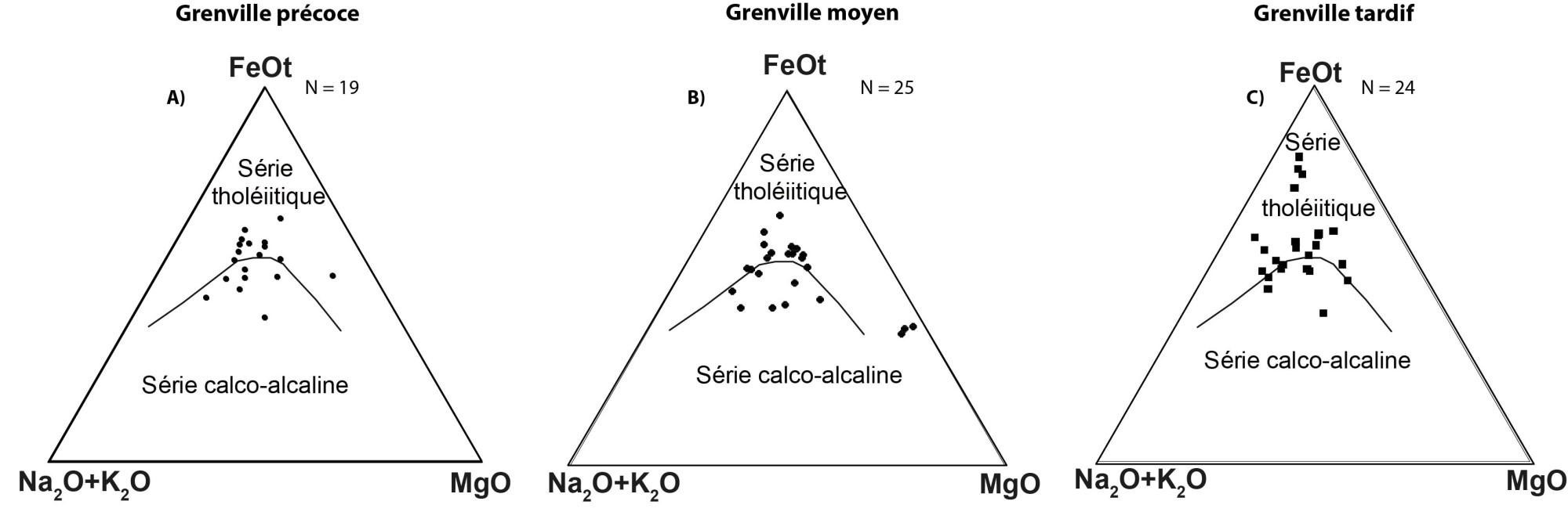 Les échantillons analysés sont majoritairement à grain moyen à grossier et leur chimie ne représente pas vraiment la composition globale du protolite. Ils peuvent contenir quelques traces de sulfures. Un échantillon du Grenville moyen est enrichi en potassium (lamprophyre mafique, SGDAC 2021081210) |