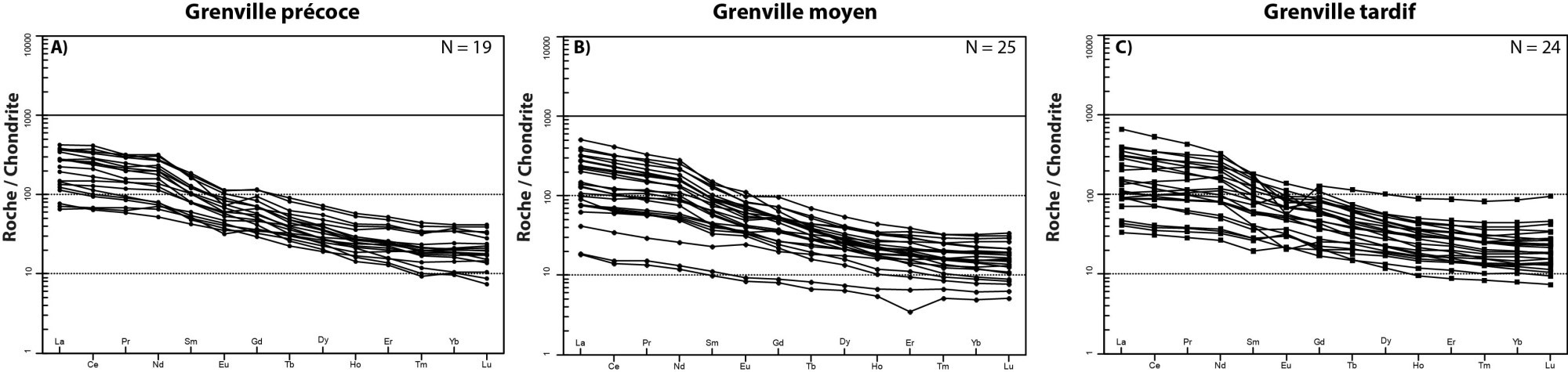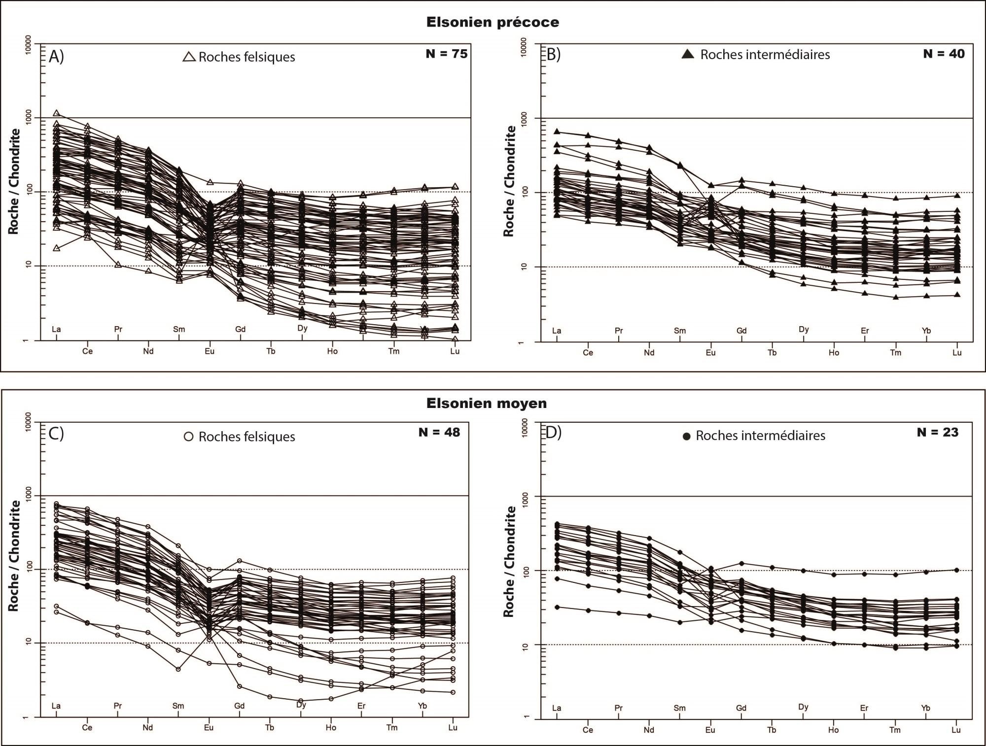 Profils plus ou moins plats avec un léger enrichissement en ETR légers vs ETR lourds 2,68 < (La/Yb)N < 53,53 1,55 < (La/Sm)N < 3,63 1,28 < (Gd/Yb)N < 6,84 0,81 < Eu/Eu* < 1,17 |