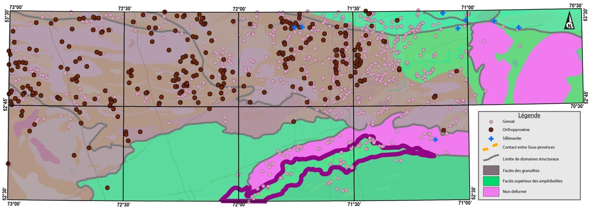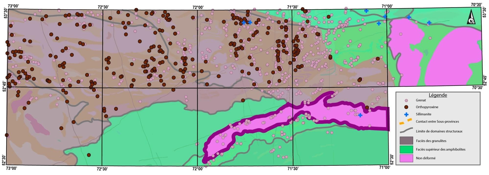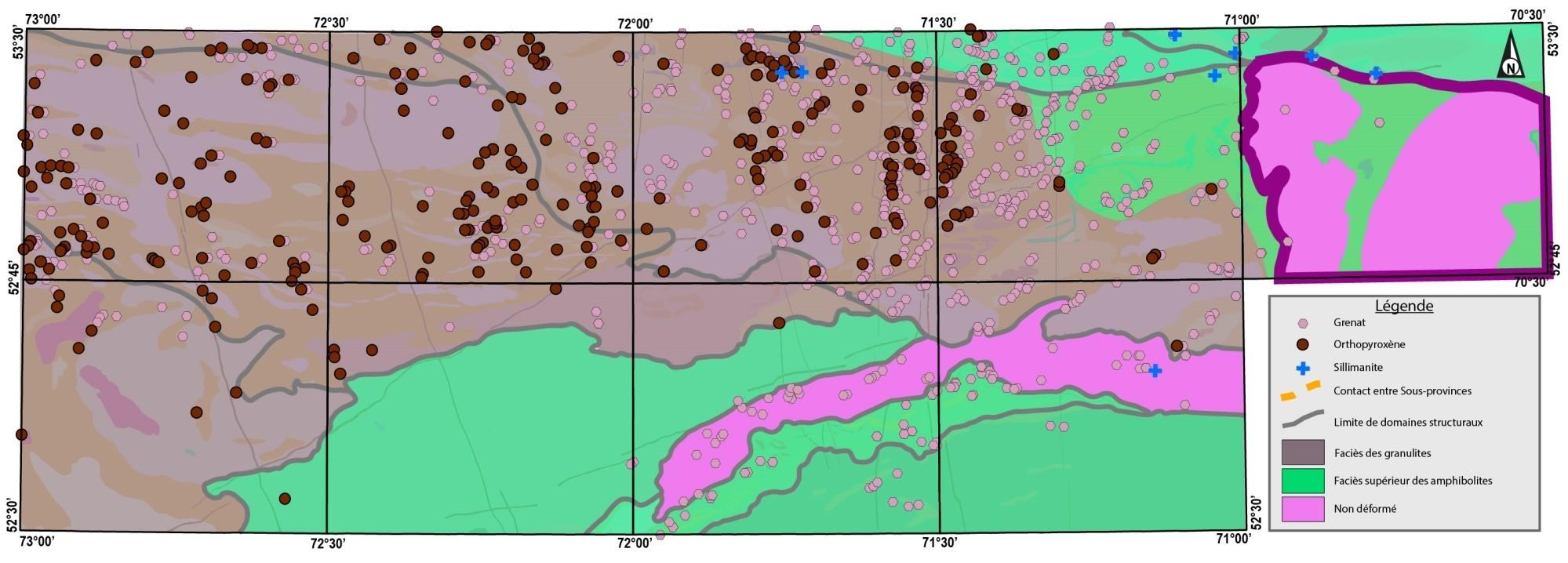 La carte des minéraux associés au métamorphisme ci-dessus permet de définir des zones associées à divers faciès métamorphiques. Les transitions entre ces zones correspondent généralement aux contacts des sous-provinces, mais pas partout. Le faciès des amphibolites est présent dans le secteur est du Complexe de Laguiche (feuillets 23D14 et 23D15), une unité communément métamorphisée au faciès des granulites. Dans la partie nord de la région cartographiée, quelques porphyroblastes d’orthopyroxène au sein des roches métasédimentaires migmatitisées de la Formation de la Rivière Salomon (Sous-province de La Grande) ont été observés. Ceci implique que le faciès granulitique s’étend au-delà de la Sous-province d’Opinaca jusque dans le La Grande.