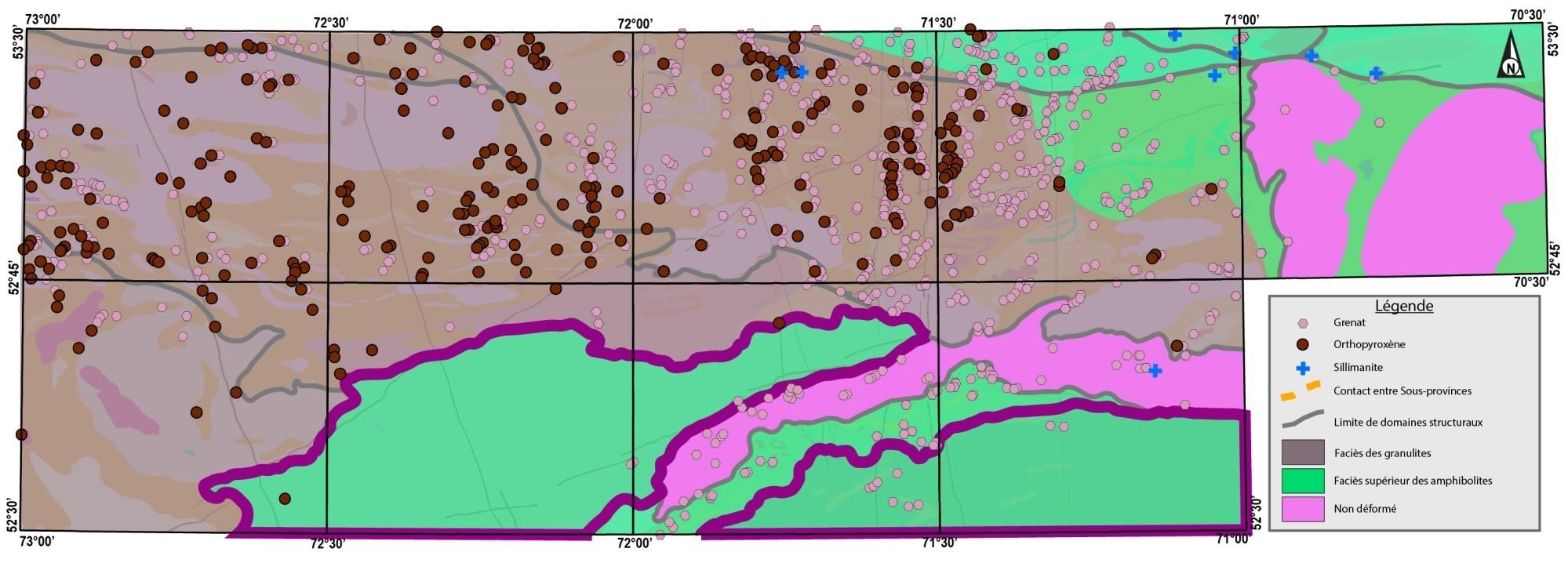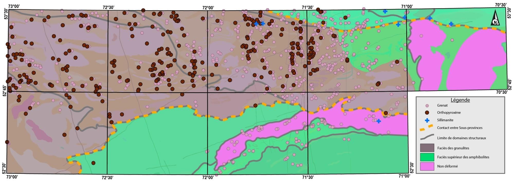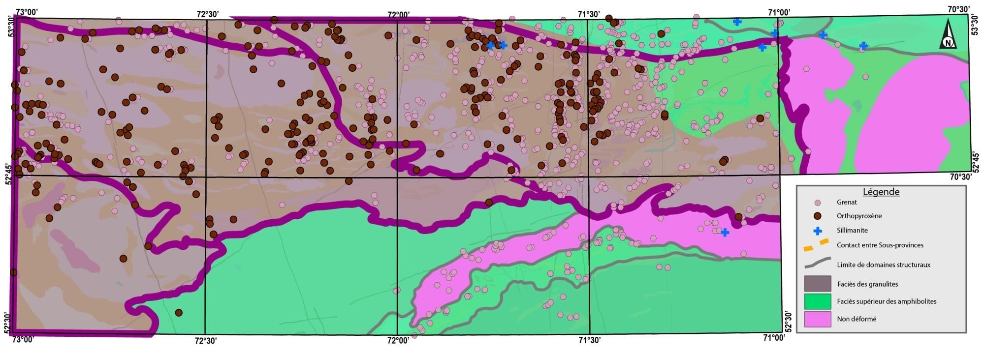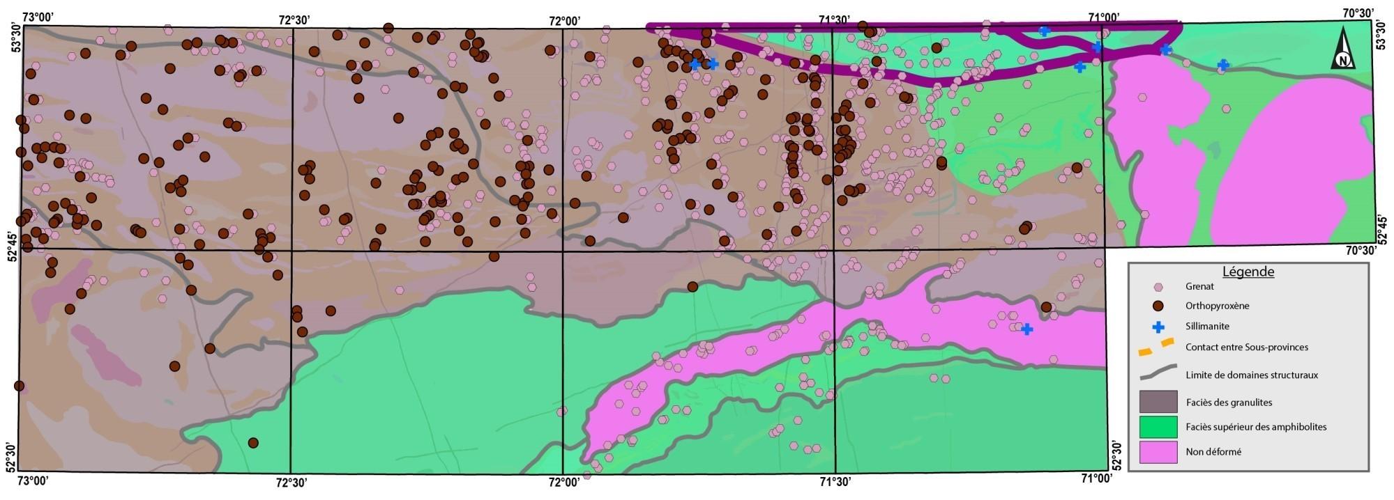 La carte des minéraux associés au métamorphisme ci-dessus permet de définir des zones associées à divers faciès métamorphiques. Les transitions entre ces zones correspondent généralement aux contacts des sous-provinces, mais pas partout. Le faciès des amphibolites est présent dans le secteur est du Complexe de Laguiche (feuillets 23D14 et 23D15), une unité communément métamorphisée au faciès des granulites. Dans la partie nord de la région cartographiée, quelques porphyroblastes d’orthopyroxène au sein des roches métasédimentaires migmatitisées de la Formation de la Rivière Salomon (Sous-province de La Grande) ont été observés. Ceci implique que le faciès granulitique s’étend au-delà de la Sous-province d’Opinaca jusque dans le La Grande.