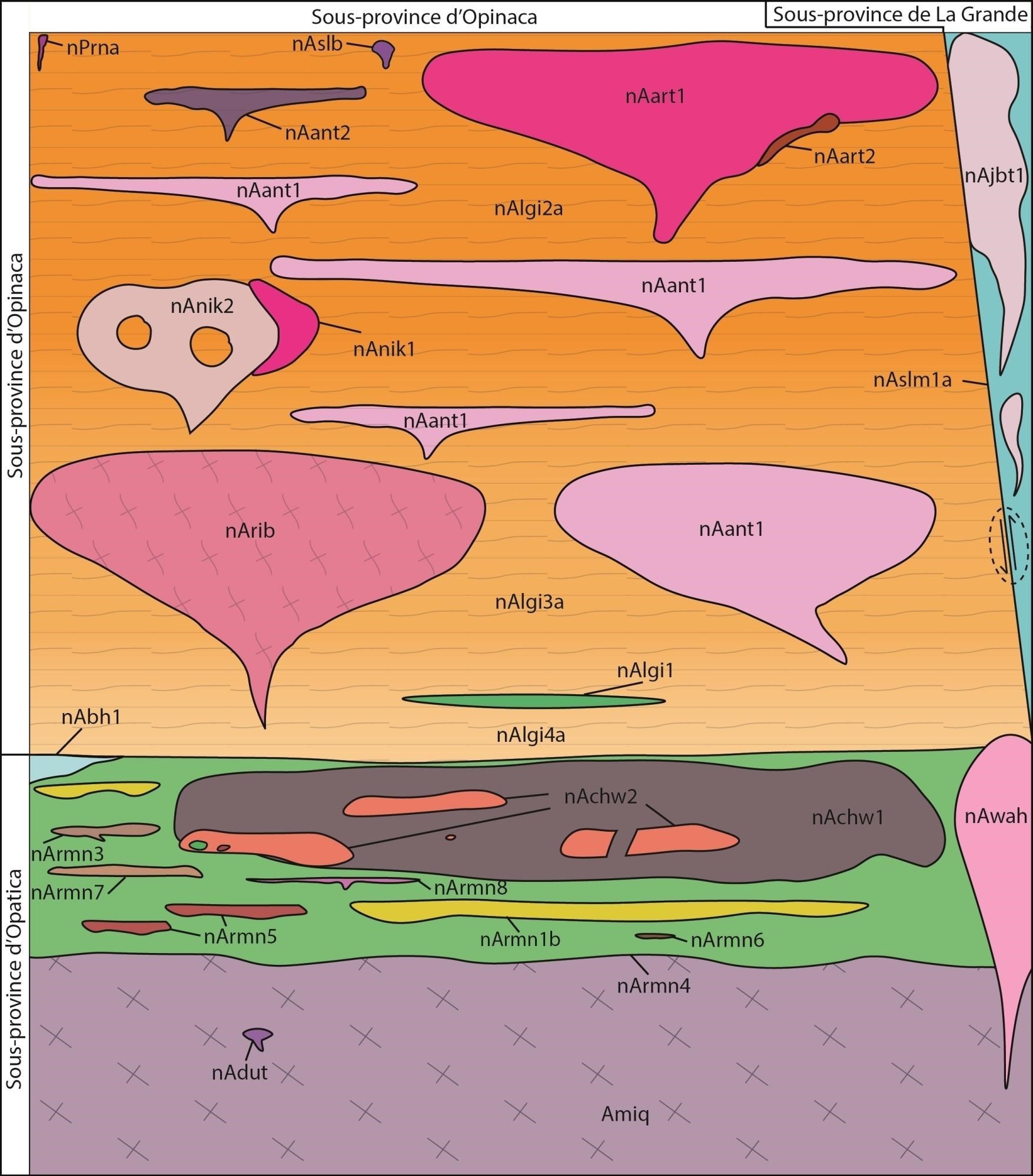Le contact entre les sous-provinces d’Opatica et d’Opinaca est masqué par des intrusions syntectoniques à post-tectoniques. À l’ouest, dans le feuillet 33A10, ce contact est injecté par les roches de la Suite de Nikos. Plus à l’est, le Pluton de Ribera traverse le nord du feuillet 33A09 et 23D12 et sépare le Complexe de Misasque du Complexe de Laguiche. Enfin, les intrusions de la Suite de Wahemen se sont introduites le long du contact Opatica-Opinaca dans le feuillet 23D11.