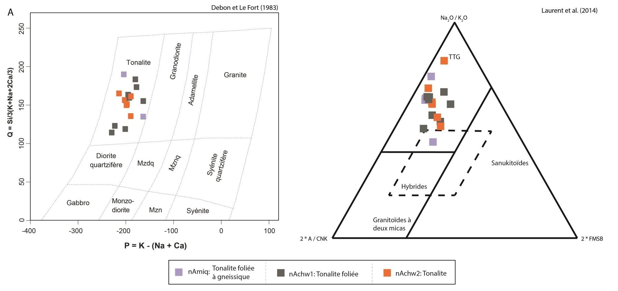 - Les échantillons de roches analysés du pluton se projettent tous dans le champ TTG du diagramme géochimique ternaire 2*A/CNK-Na2O/K2 O-2*FMSB de Laurent et al. (2014).