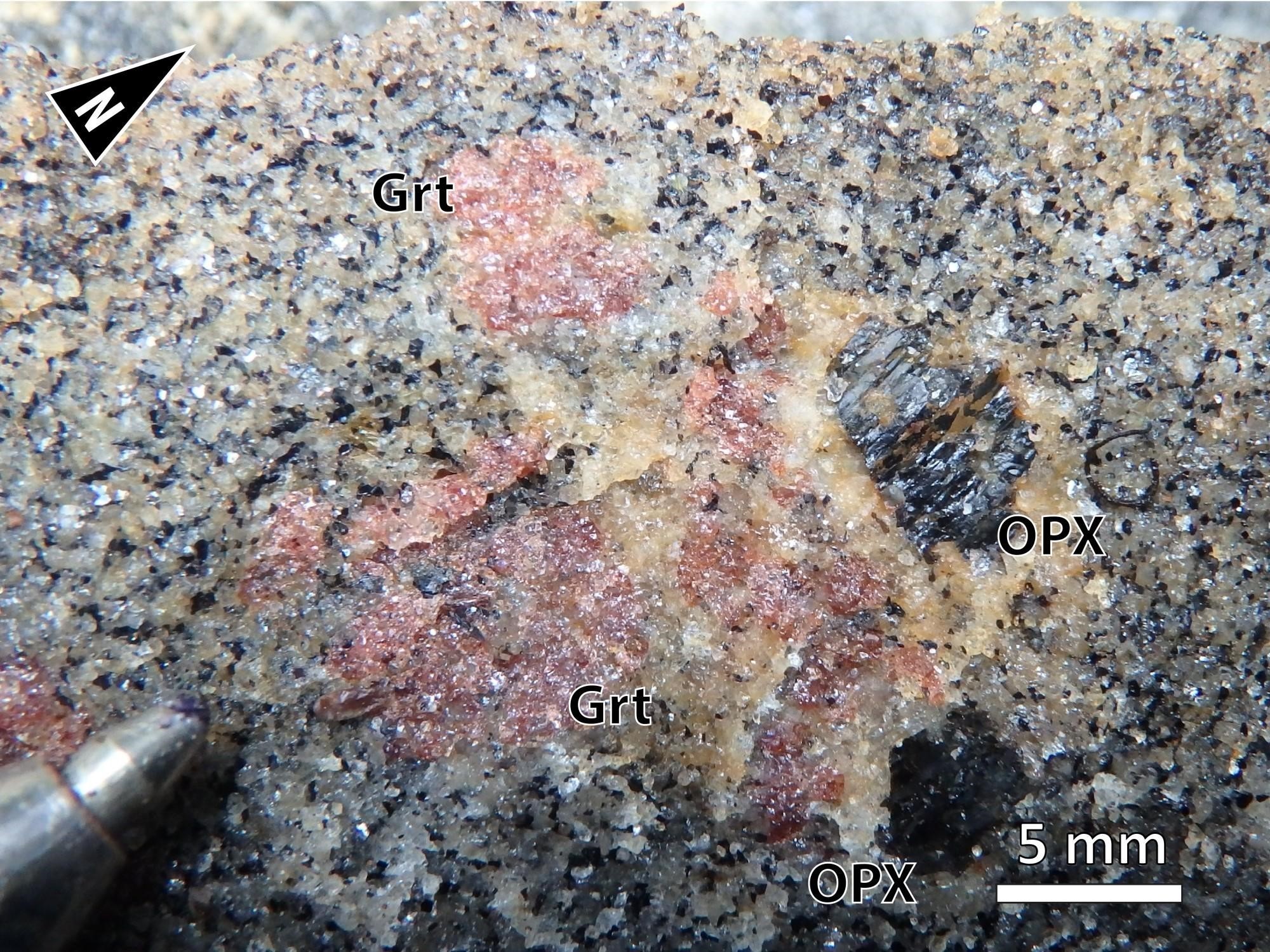 Le grenat et l’orthopyroxène sont présents à la fois dans la matrice (mésosome) et dans le mobilisat, mais ils sont plus grenus et abondants dans le mobilisat. Généralement, le mésosome contient des petits cristaux néoformés de grenat et/ou d’orthopyroxène (0,5 à 1 cm). Le leucosome est plutôt caractérisé par de gros pœciloblastes (1 à 8 cm) hypidiomorphes à idiomorphes, présents au sein du mobilisat à structure stromatique affecté par le plissement. Cela implique que la migration de liquide de fusion à l’échelle granulaire s’est produite durant la déformation régionale.