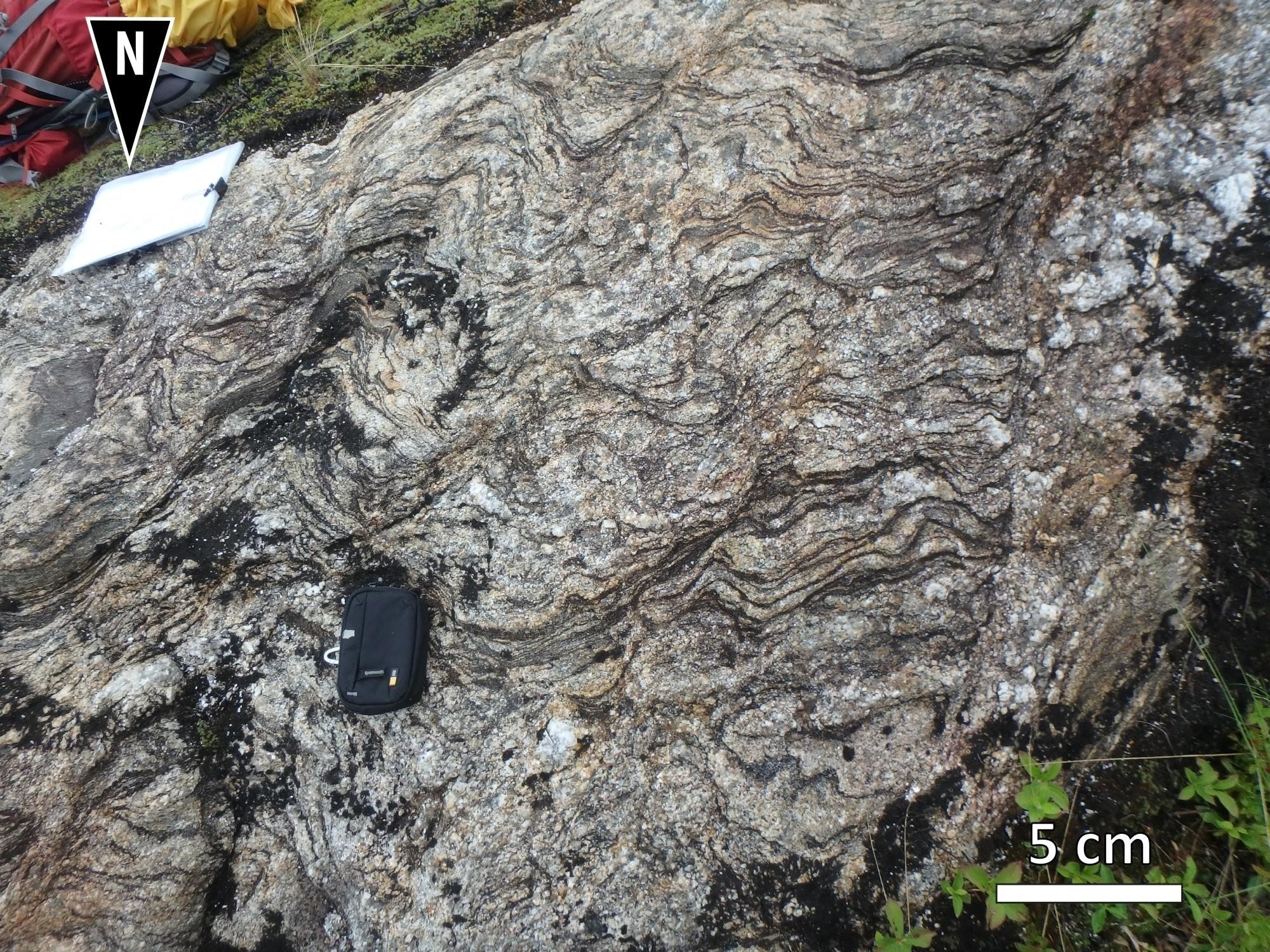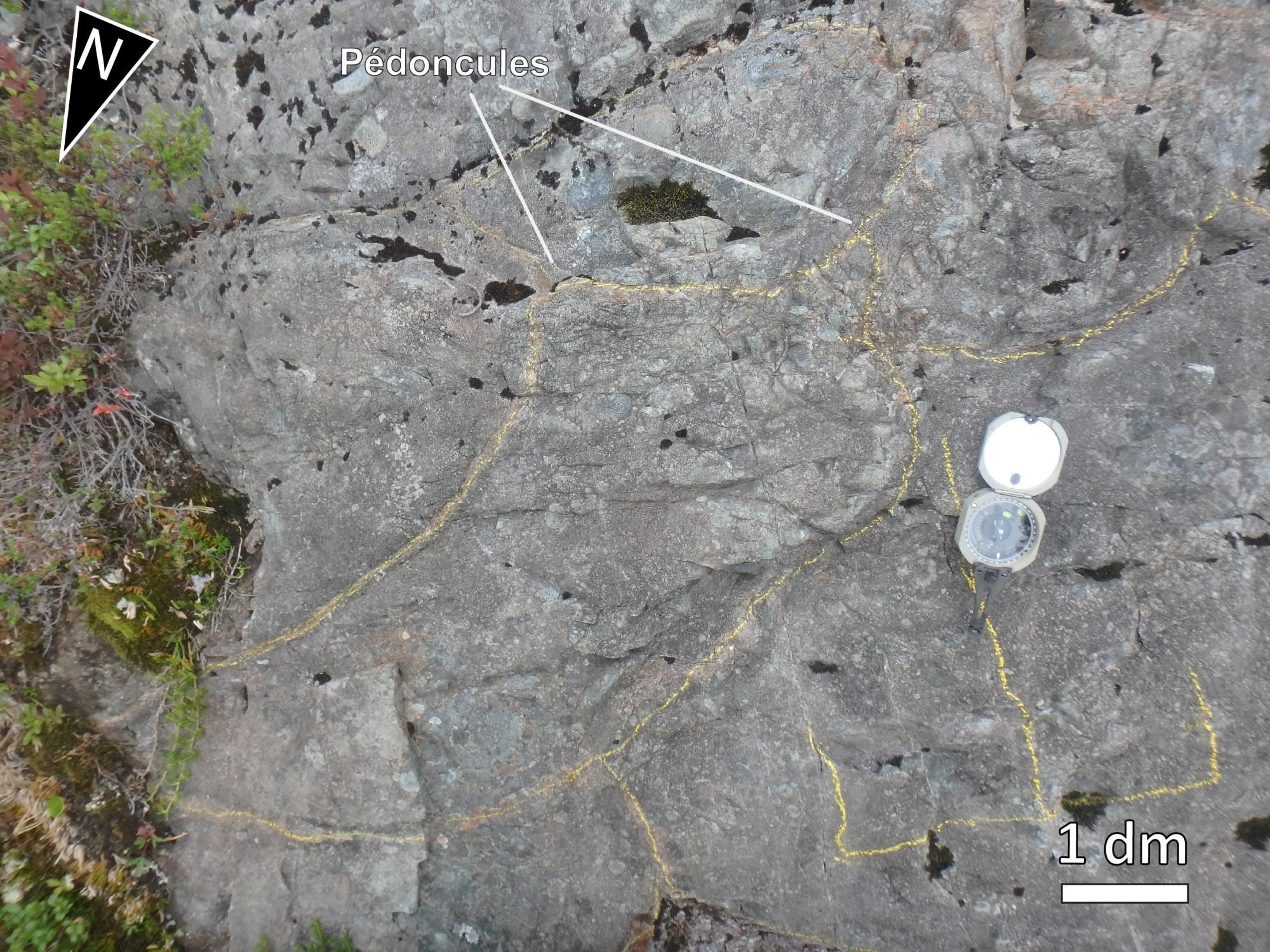 Les roches de la région ont enregistré au moins trois phases de déformation archéenne ductile-fragile suivies d’épisodes de déformation fragile. Une première phase de déformation S n-1, subparallèle au litage (S0), est visible dans la charnière des plis Pn dans les basaltes schisteux de la CRVHE. La fabrique principale Sn, généralement E-W, est observée de façon systématique sur les affleurements où elle définit une schistosité ou une gneissossité. Elle est marquée par l’alignement préférentiel des micas et/ou des amphiboles, le plan d’étirement des coussins dans les basaltes et l’orientation des fragments et des clastes dans les roches volcanoclastiques et les conglomérats. Le rubanement migmatitique est aussi communément subparallèle à la fabrique Sn. L’épisode de déformation Dn est associé à une compression ou à une transpression associées à des contraintes grossièrement N-S. La structure communément stromatique des métatexites, associée à des niveaux de mobilisat parallèles à la schistosité principale, semble indiquer que cet épisode de déformation serait lié à l’épisode métamorphique à l’origine de la fusion partielle dans les roches métasédimentaires, dont l’âge est estimé à 2663 Ma (Morfin et al., 2013). L’âge minimal du métamorphisme correspond à l’âge de cristallisation du Pluton d’Artigny (2589 ±4 Ma), unité non affectée par la déformation et le métamorphisme (Davis et Sutcliffe, 2018a). La déformation D n+1 est peu présente; elle a surtout été observée dans les basaltes schisteux sous la forme d’un clivage de crénulation. Des kink bands et des microplis asymétriques en « Z » sont aussi associés à cette phase de déformation.