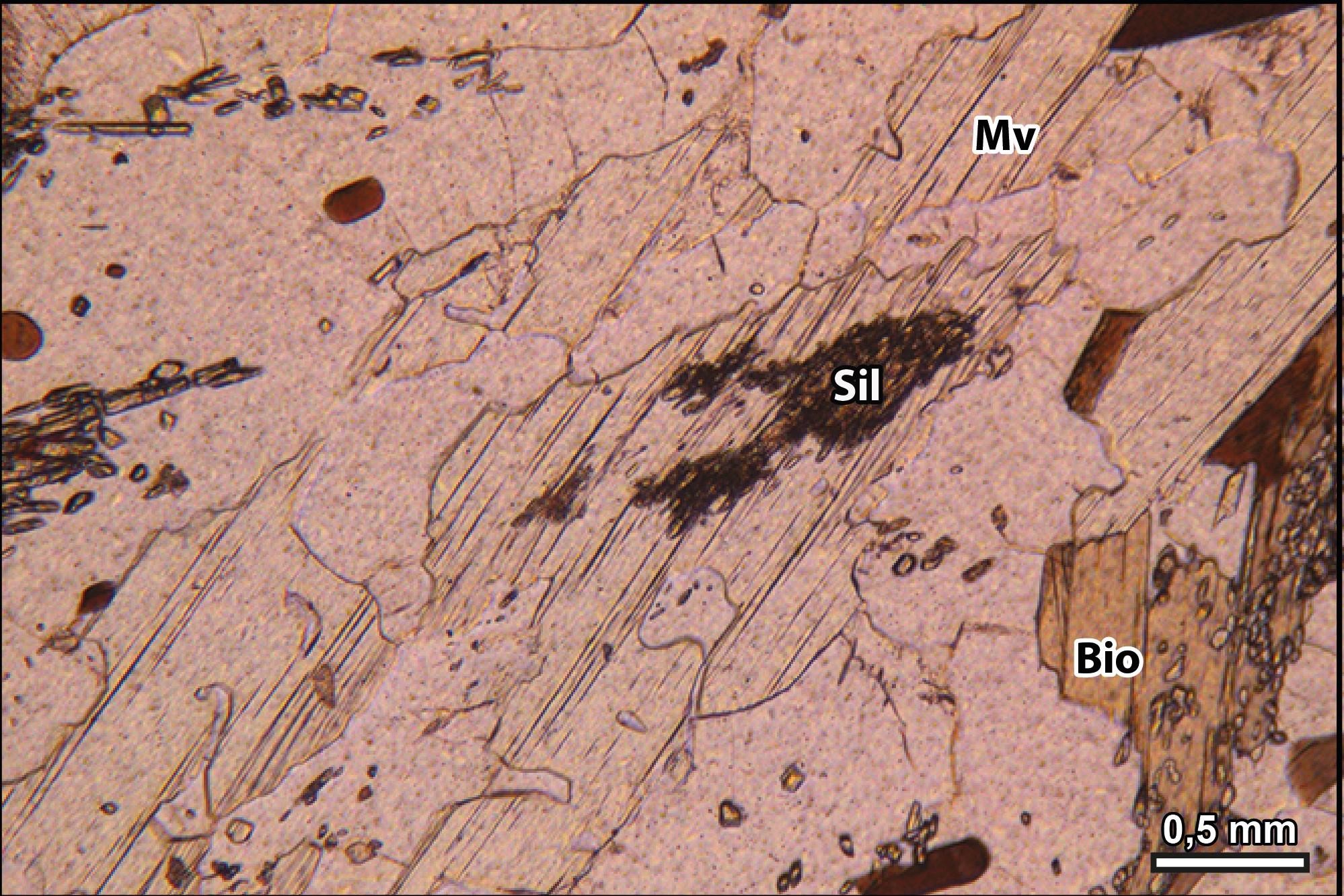 Dans ces domaines structuraux, les paragneiss sont granoblastiques et présentent l’assemblage quartz-plagioclase-biotite ± feldspath potassique ± orthopyroxène ± grenat ± cordiérite, avec des proportions mineures d’amphibole. En lames minces, les textures primaires des roches métasédimentaires ont été totalement oblitérées. On observe communément des myrmékites, des perthites et des grains de quartz à extinction roulante. La biotite est prograde et orientée selon la foliation principale. Les pœciloblastes de grenat sont tarditectoniques à post-tectoniques et contiennent des inclusions arrondies de quartz. Les cristaux d’orthopyroxène sont majoritairement hypidiomorphes à idiomorphes, nématoblastiques et non altérés. Localement, ils sont rétrogradés en amphibole et/ou biotite, indiquant une réhydratation partielle de la phase péritectique au faciès des amphibolites (Morfin et al., 2013).