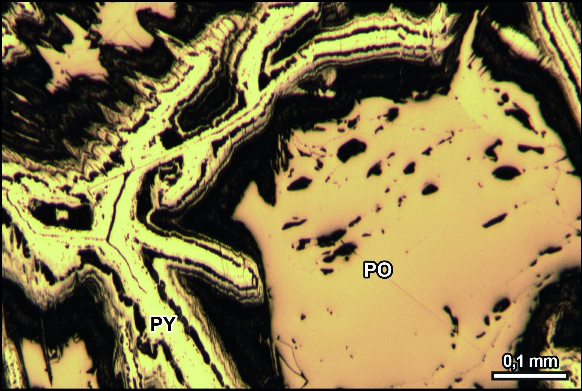 On trouve des minéralisations aurifères encaissées dans des formations de fer dans une zone fortement plissée de la CRVHE (Zone 5). Les niveaux de formation de fer rubanée à silicates se distinguent par leur forte signature magnétique. Le litage irrégulier est plissé de façon erratique et montre une alternance de lits clairs cherteux et de lits sombres à grunérite et grenat. La zone minéralisée se trouve au cœur des plis. Elle consiste en pyrrhotite et en pyrite qui coexistent avec la magnétite. La pyrite est soit colloforme, soit constituée de cristaux automorphes à subautomorphes, ces derniers résultant d’une altération rétrograde de la pyrrhotite. L’échantillon 2016-ML-5040A a donné 55 ppb Au et 10,9 % S.