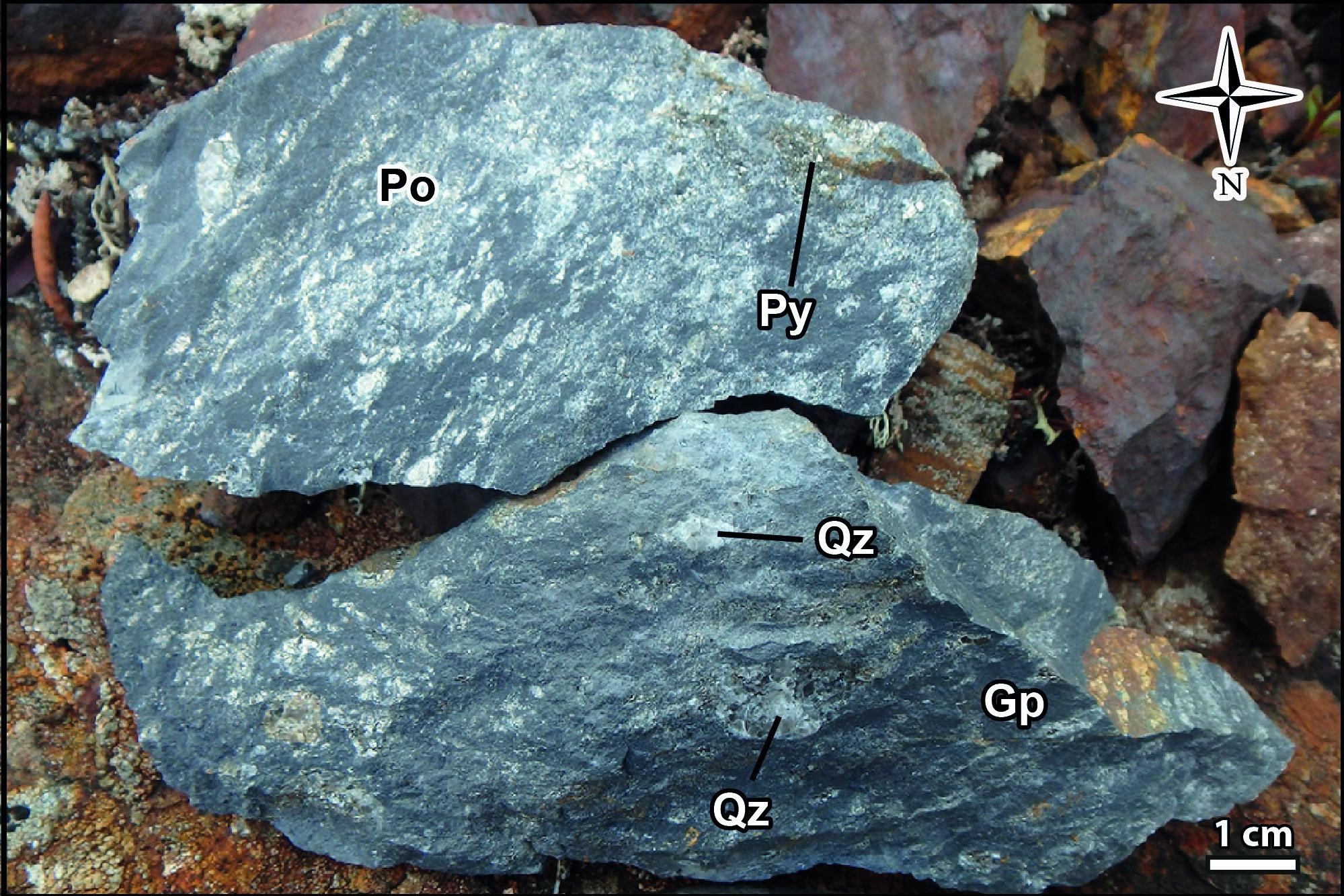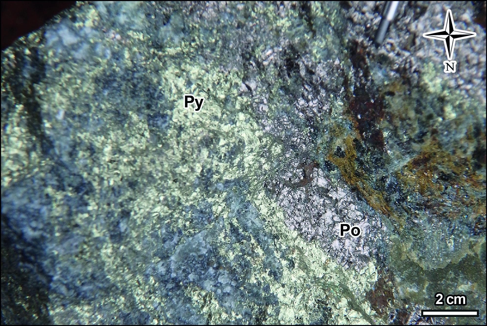 Des intrusions mafiques à ultramafiques décamétriques se sont injectées dans la séquence volcanique de la CRVHE et s’étendent latéralement sur des kilomètres. Elles sont métamorphisées au faciès des amphibolites et présentent une altération en épidote et serpentine visible en lame mince. Quelques minéralisations en Ni sont associées à ces intrusions. L’indice Ruisseau Leran-2 (0,34 % Ni), encaissé dans une intrusion ultramafique au sein de basaltes, contient 5 à 12 % de pyrrhotite et des traces de pyrite (Blain, 1993). Un échantillon d’amphibolite à grenat et magnétite avec 1 % de pyrite-pyrrhotite finement disséminées associées à une forte chloritisation (2016-FT-3145A) a été prélevé sur lzone minéralisée du Ruisseau Leran-1. Cet échantillon a livré des valeurs anomales de 0,21 % Ni et 392 ppb Au.