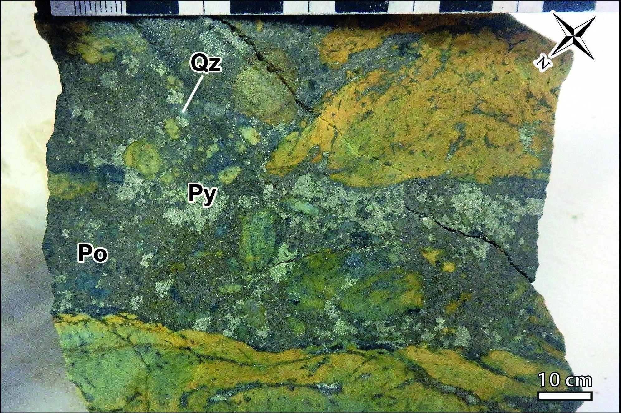 Un grand nombre d’amas sulfurés sont aussi associés à des dômes felsiques (rhyodacite-rhyolite) et des tufs felsiques de la Formation de Roman (Zone 2). Ces roches constituent un niveau marqueur conducteur associé à une anomalie magnétique positive qui constitue un bon critère d’exploration. De plus, ce niveau est coupé par la Zone de cisaillement du Lac Banane, une zone de déformation fragile-ductile d’orientation NE à ENE. Les sulfures sont bréchifiés, massifs (pyrrhotite-pyrite) ou semi-massifs (pyrrhotite-pyrite ± chalcopyrite) et associés aux lapillis et aux blocs. Les zones minéralisées en cuivre Éch. 47472 et Alta-Eastmain, de même que la zone minéralisée en zinc Éch. 47095 sont associés à ce niveau. L’échantillon 2016-AN-6166C, une amphibolite à chlorite et grenat contenant ∼5 % de sulfures (pyrite-pyrrhotite-chalcopyrite), a donné une valeur indicielle de 0,69 % Cu, 105 ppb Au et 5,26 % S. Cet échantillon est situé à ∼180 m à l’ENE de la zone minéralisée d’Alta-Eastmain.